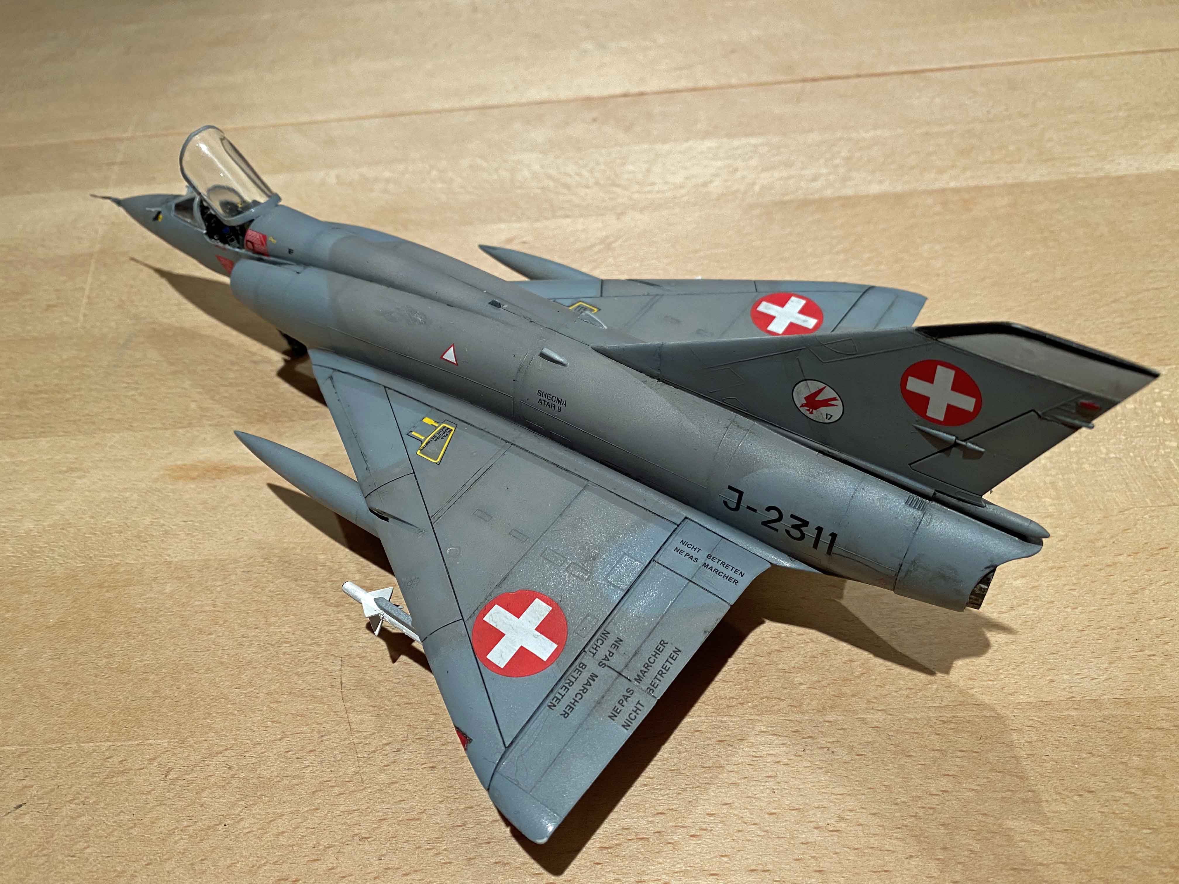 Meine laufenden Projekte sind 2 Mustangs: 1 x USA (ICM mit Decals von ICM und Eduard) zum Testen des silbernen Anstrichs und 1 x Schweizer Version (auch mit gemischten Decals) sowie eine Mirage III RS von Kinetic
