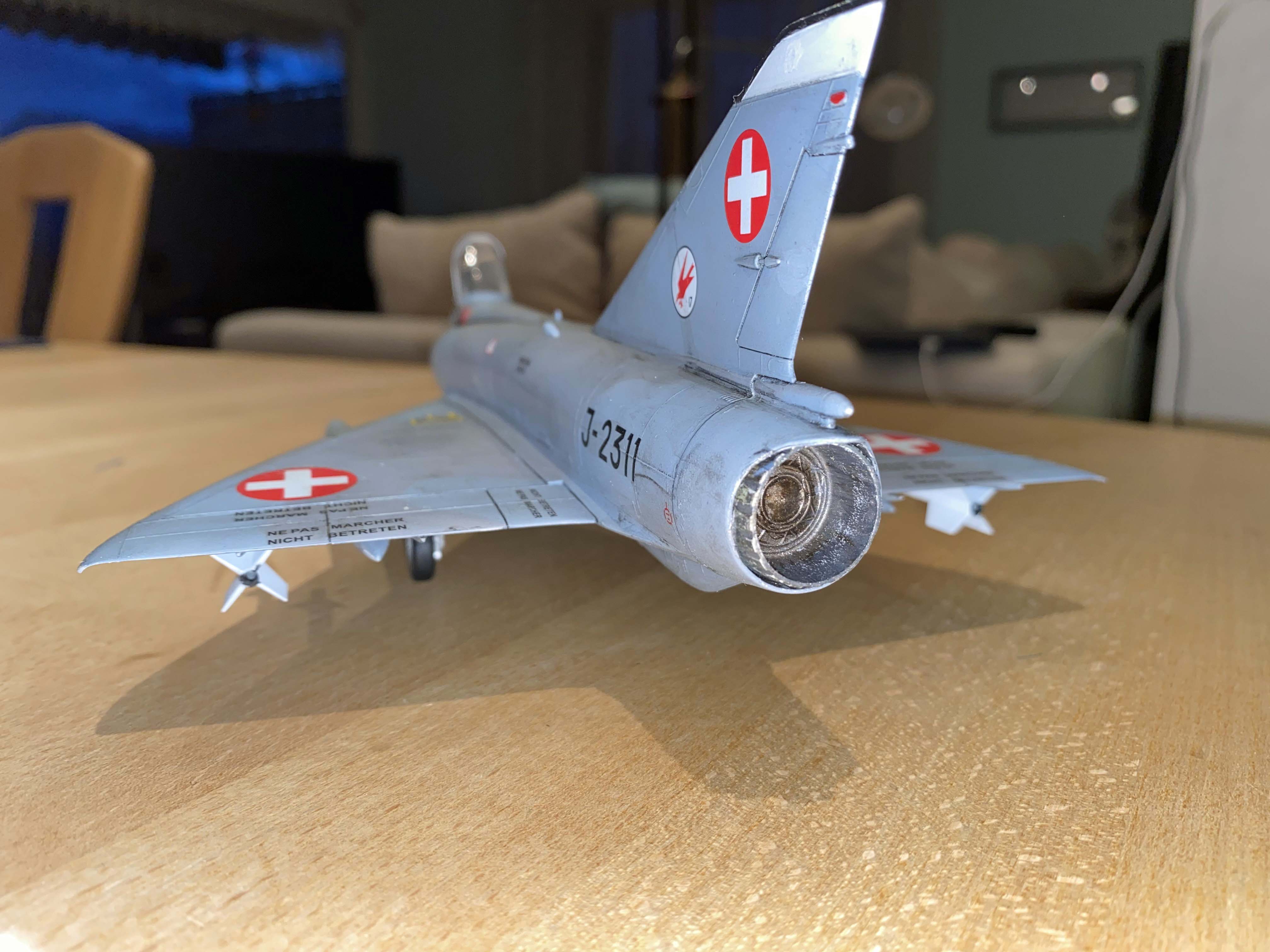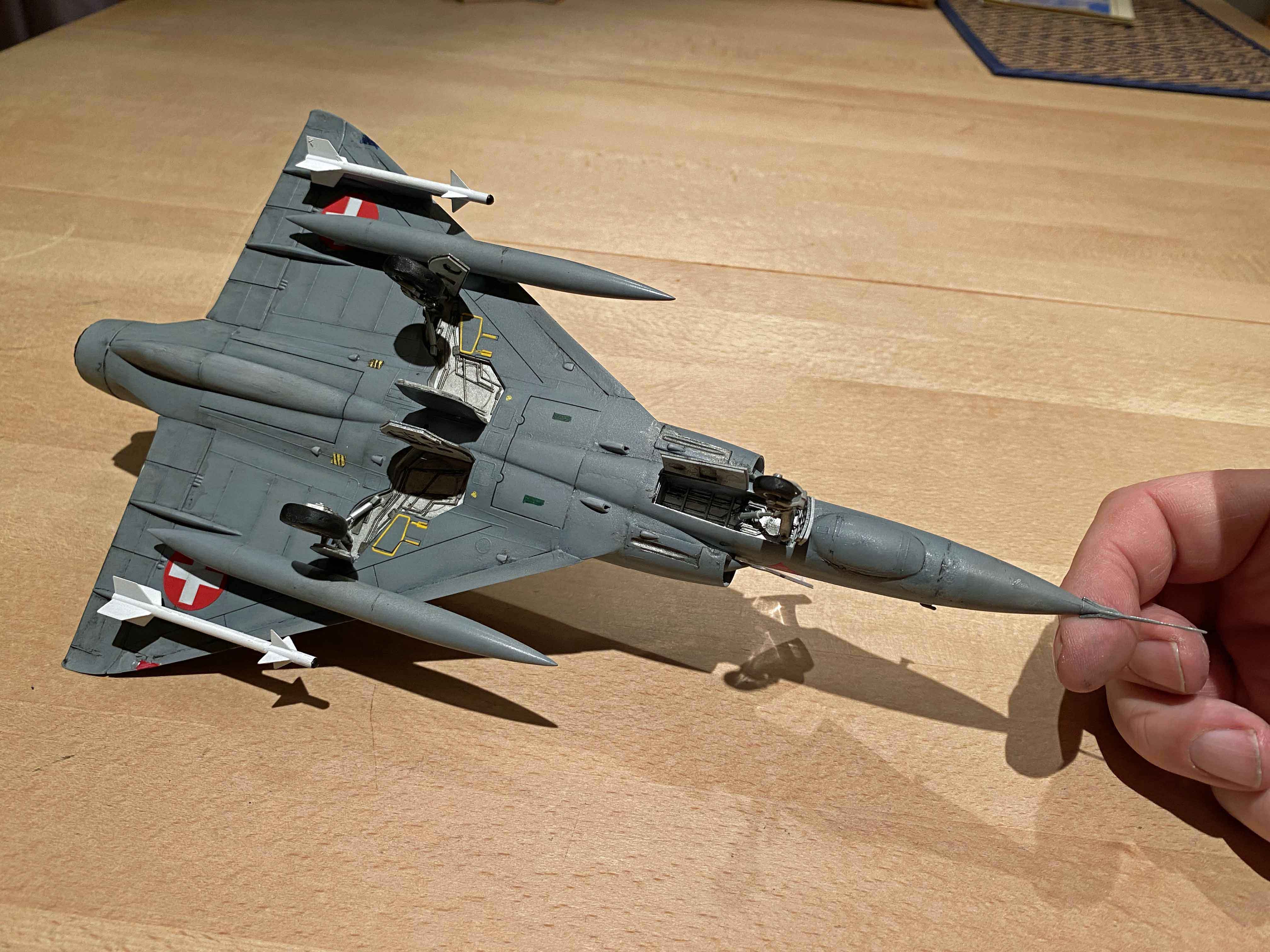 Das Flugzeug war 1989 Teil der Fliegerstaffel 16 und in Stans (nahe Luzern) stationiert. Ich mag mich noch gut daran erinnern, als die Mirages der Schweiz noch silbern waren. Dann wurden sie zeitgemäss mit einem grauen Tarnanstrich versehen, wie jetzt im Modell dargestellt. Die Farben sind mir leider etwas zu dunkel gekommen, da muss ich beim nächsten Mal besser planen. Später kamen dann bei einem "Upgrade" der Mirage III S noch Entenflügel (Canards) dazu, aber erst nach 1989.