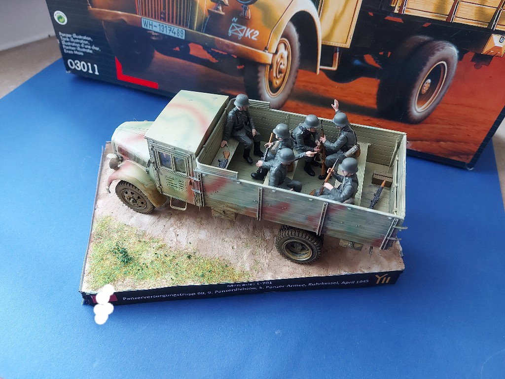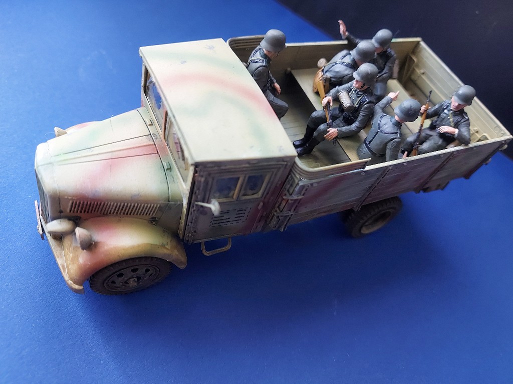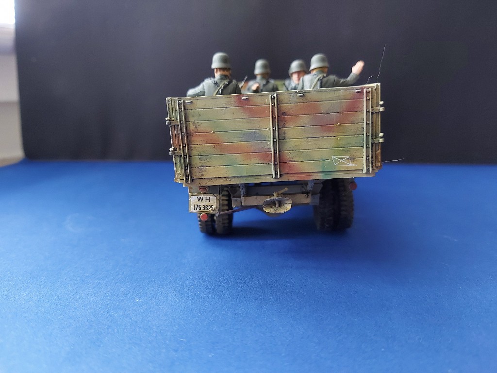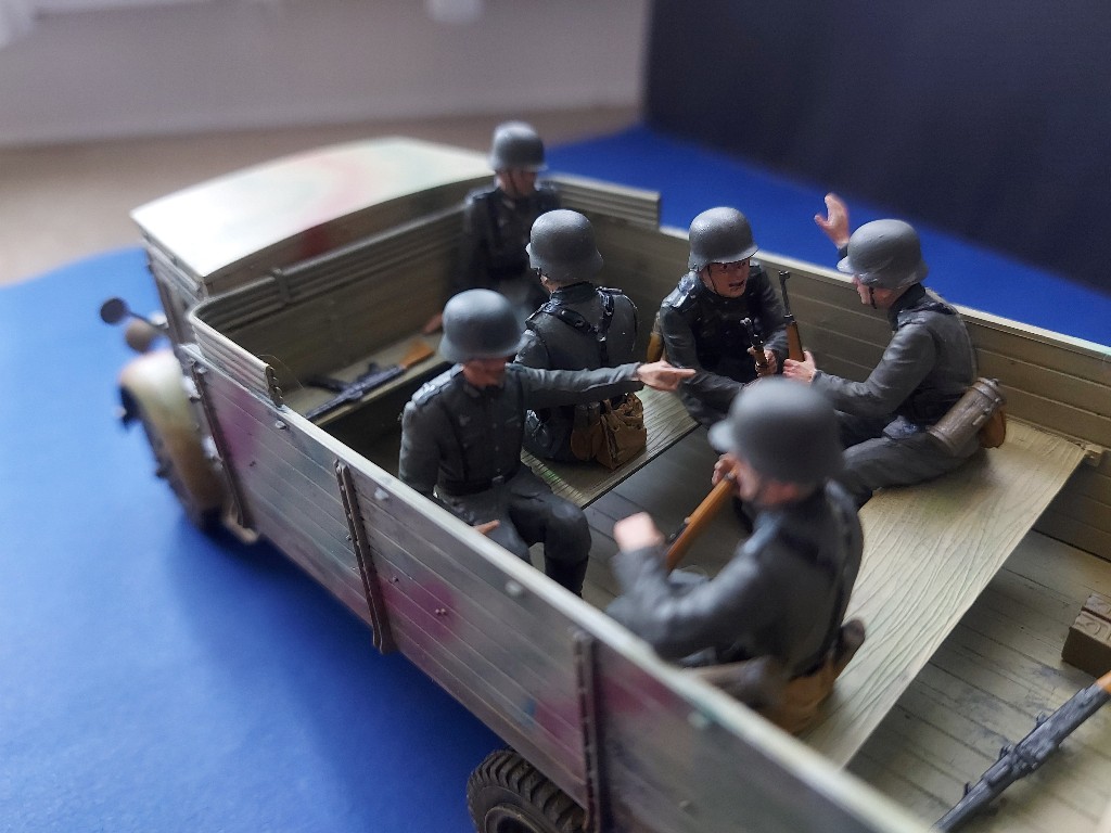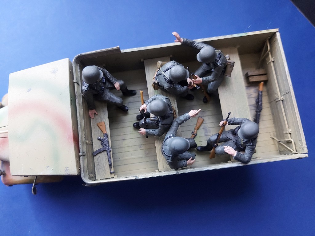 So es ist erneut vollbracht, ein weiteres Modell steht auf den Beinen. Und ich bin sehr zufrieden. Dargestellt wurde ein Fahrzeug zum Kriegsende, welches Sonnenterrasse anderem im Ruhrkessel anzutreffen war. Die armen Kerle wurden als "Feuerwehr" noch im Kessel verheizt, mit dem letzten Rest was noch da war. Die Jungs sind entsprechend mit allem bewaffnet: Karak 98, Gewehr 43, MP 18 und 40 und das Stg 44, hinzu kommt noch eine MG 42. Für ein relativ altes Modell, finde ich den LKW super und er hat viel Spaß gemacht, vorallem weil man gut zum Ziel kam und Spachteln nicht notwendig war. :thumbup: