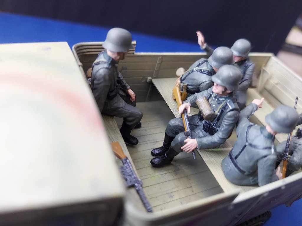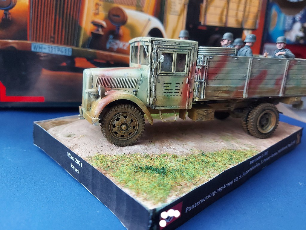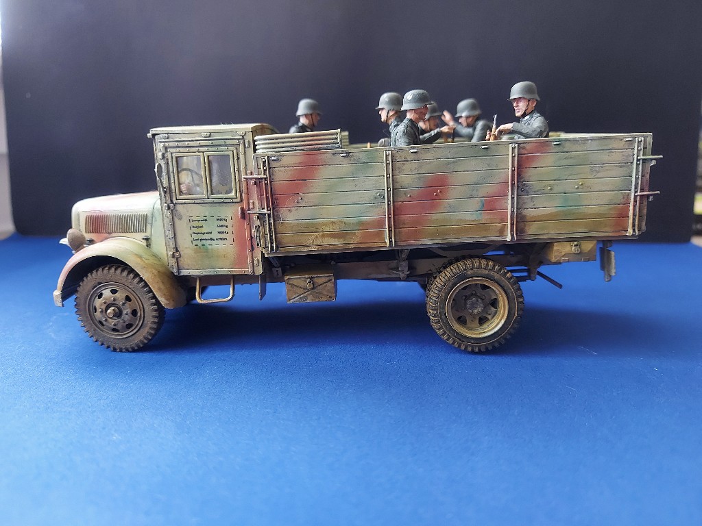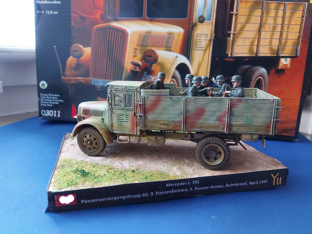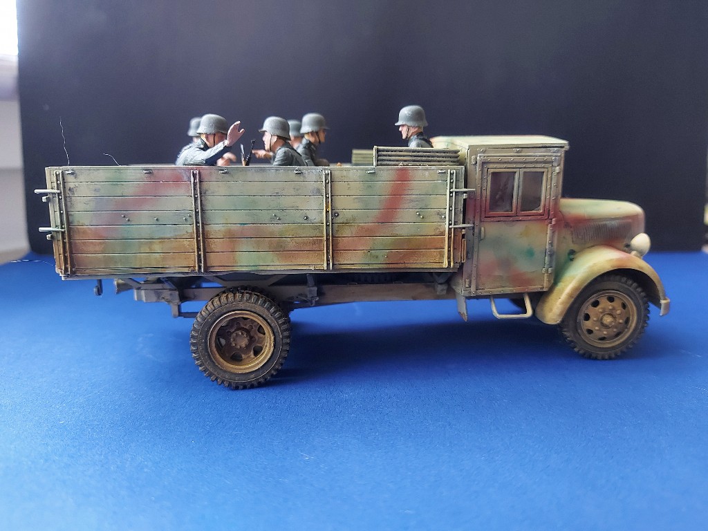 So es ist erneut vollbracht, ein weiteres Modell steht auf den Beinen. Und ich bin sehr zufrieden. Dargestellt wurde ein Fahrzeug zum Kriegsende, welches Sonnenterrasse anderem im Ruhrkessel anzutreffen war. Die armen Kerle wurden als "Feuerwehr" noch im Kessel verheizt, mit dem letzten Rest was noch da war. Die Jungs sind entsprechend mit allem bewaffnet: Karak 98, Gewehr 43, MP 18 und 40 und das Stg 44, hinzu kommt noch eine MG 42. Für ein relativ altes Modell, finde ich den LKW super und er hat viel Spaß gemacht, vorallem weil man gut zum Ziel kam und Spachteln nicht notwendig war. :thumbup: