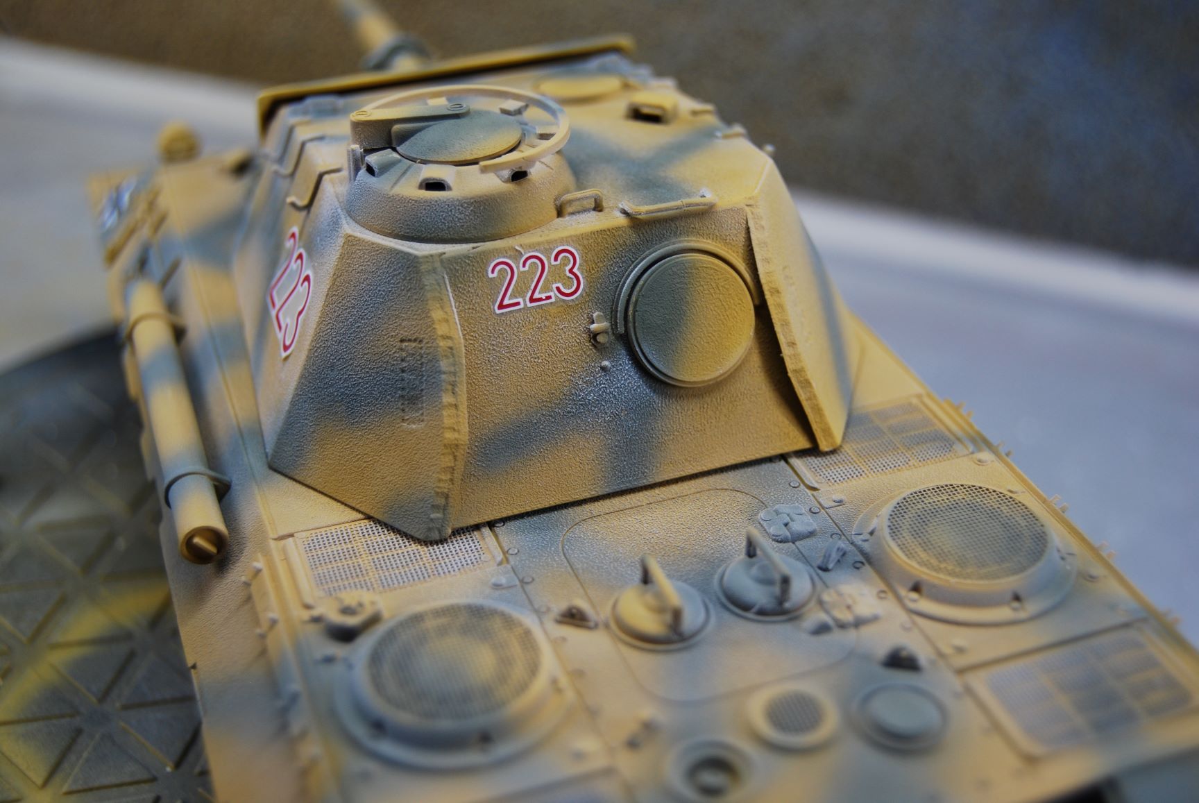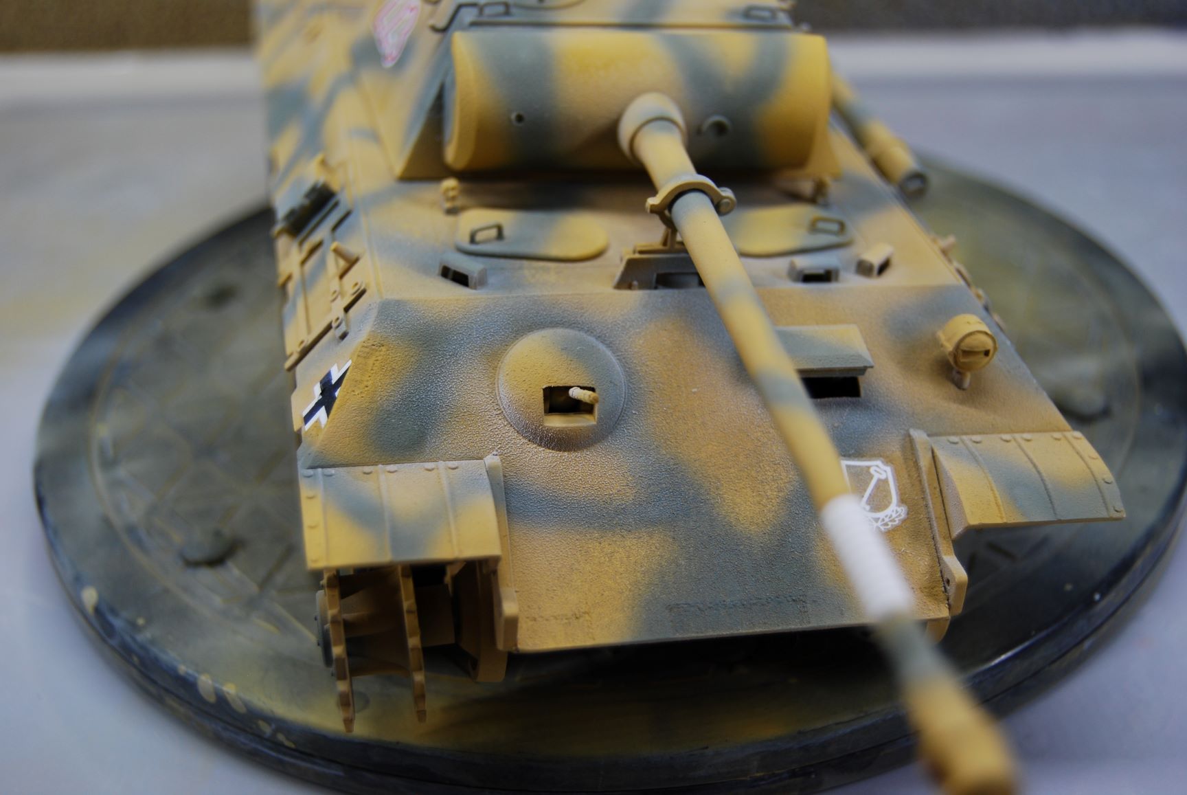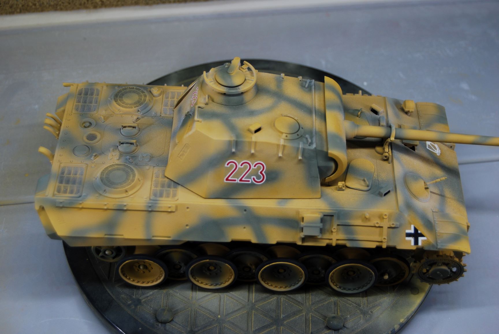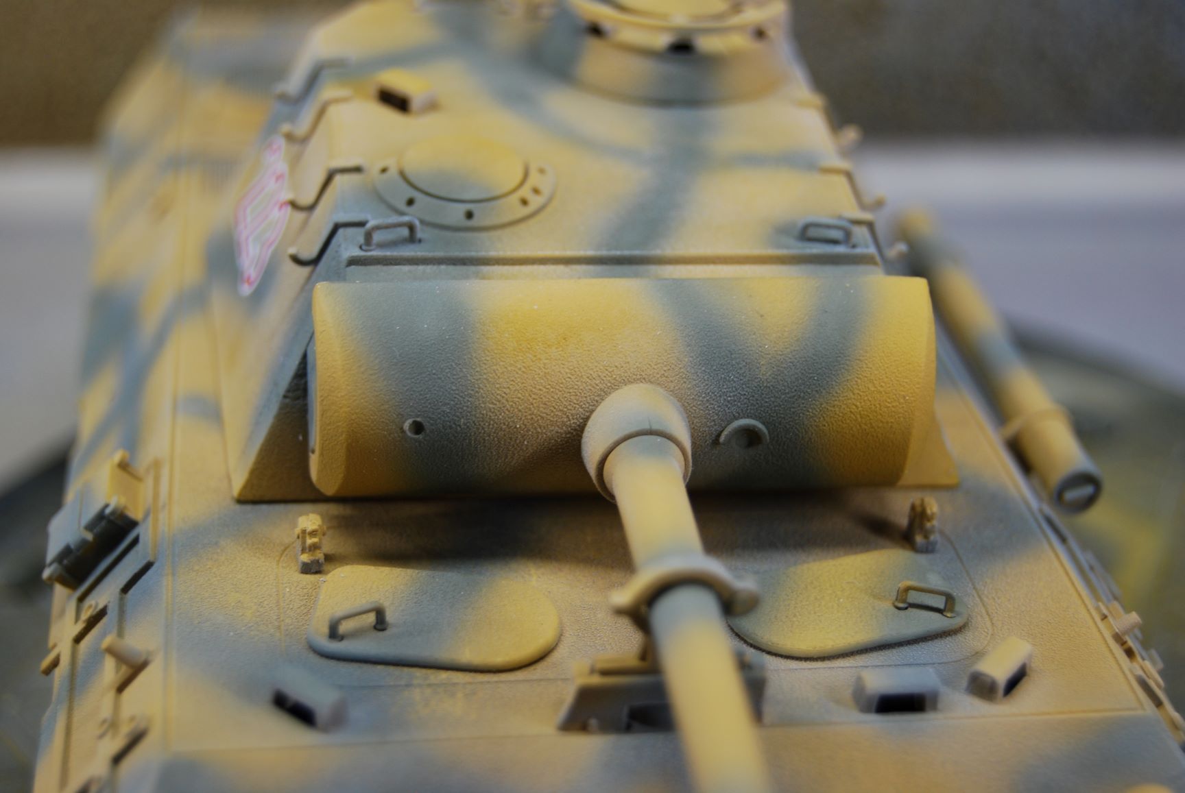 In meinem Nachbarthema "Probleme mit Revell Airbrush Email Basic" geht es ja um die raue Oberfläche der Grundierung an dem Panther A meines Sohnemannes. Nachdem ich die Oberfläche an der Panzerwanne nachgebessert habe, habe ich das Modell mit Sand matt Nr.16 gesprüht und danach mit Grüngrau matt Nr.67. Das Kanonenrohr und die Gitter von ABER habe ich davor noch mit dem Metal Primer von Tamiya behandelt. Nr. 16 habe ich mit 0,3 mm Düse und 1,6 bar Arbeitsdruck verarbeitet und die Streifen aus Nr. 67 mit der 0,2 mm Düse bei gleichem Druck. Eine Lackierprobe mit beiden Farben habe ich vorher auf einem Stück nicht grundierter Polycarbonat-Scheibe gemacht. Da die Oberfläche der Grundierung sehr unterschiedlich ist und auch das Modell an sich auf Wannenoberseite und Turm strukturiert ist, bin ich nicht von einer Babypopo Lackierung ausgegangen. Vor dem Lackieren mit dem Klarlack matt Nr. 2, habe ich noch die Decals angebracht. Wie ich nach diesem Arbeitsschritt in diesem Forum lesen konnte, habe ich dabei einen Fehler gemacht. Ist aber nicht soooo schlimm. ;)