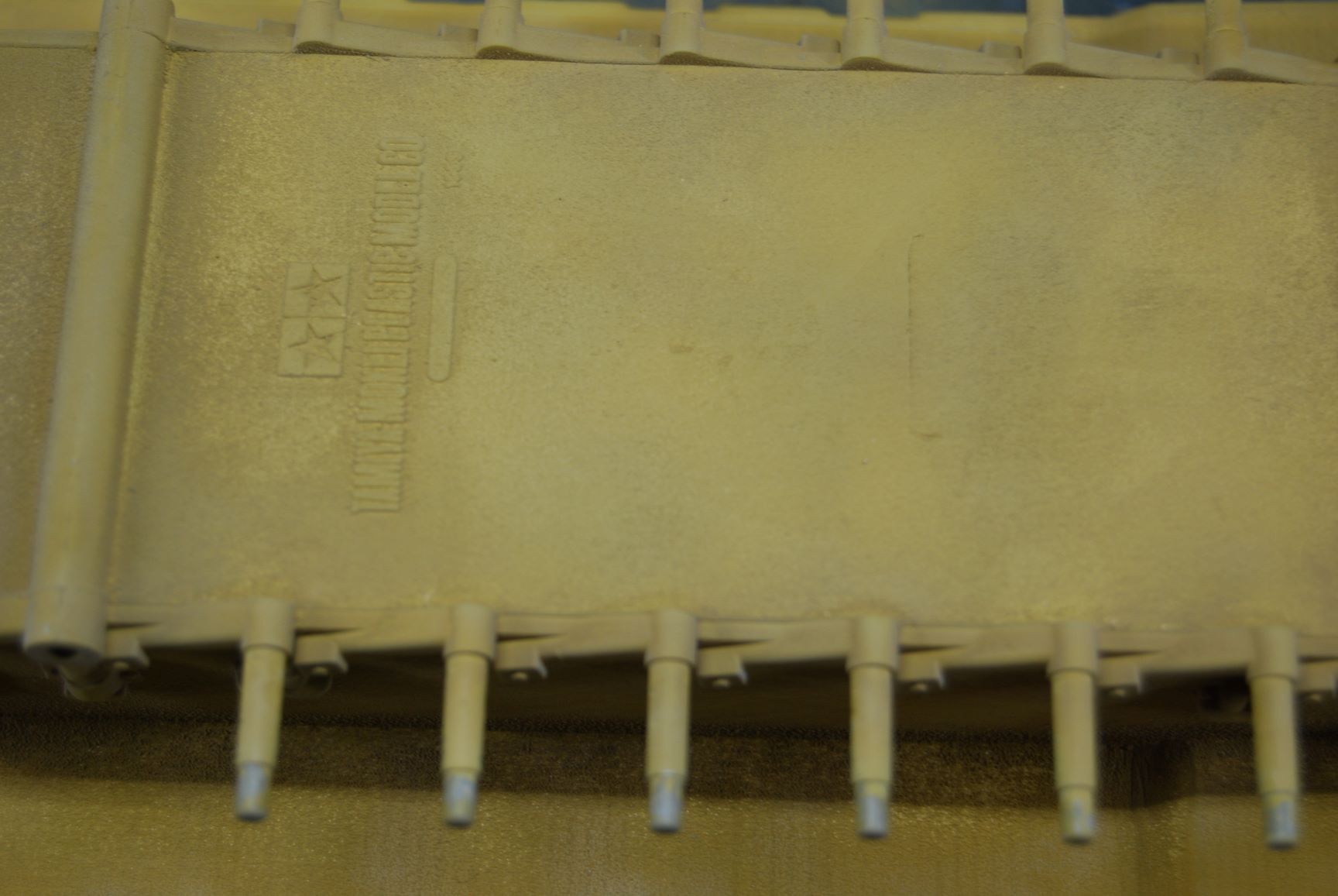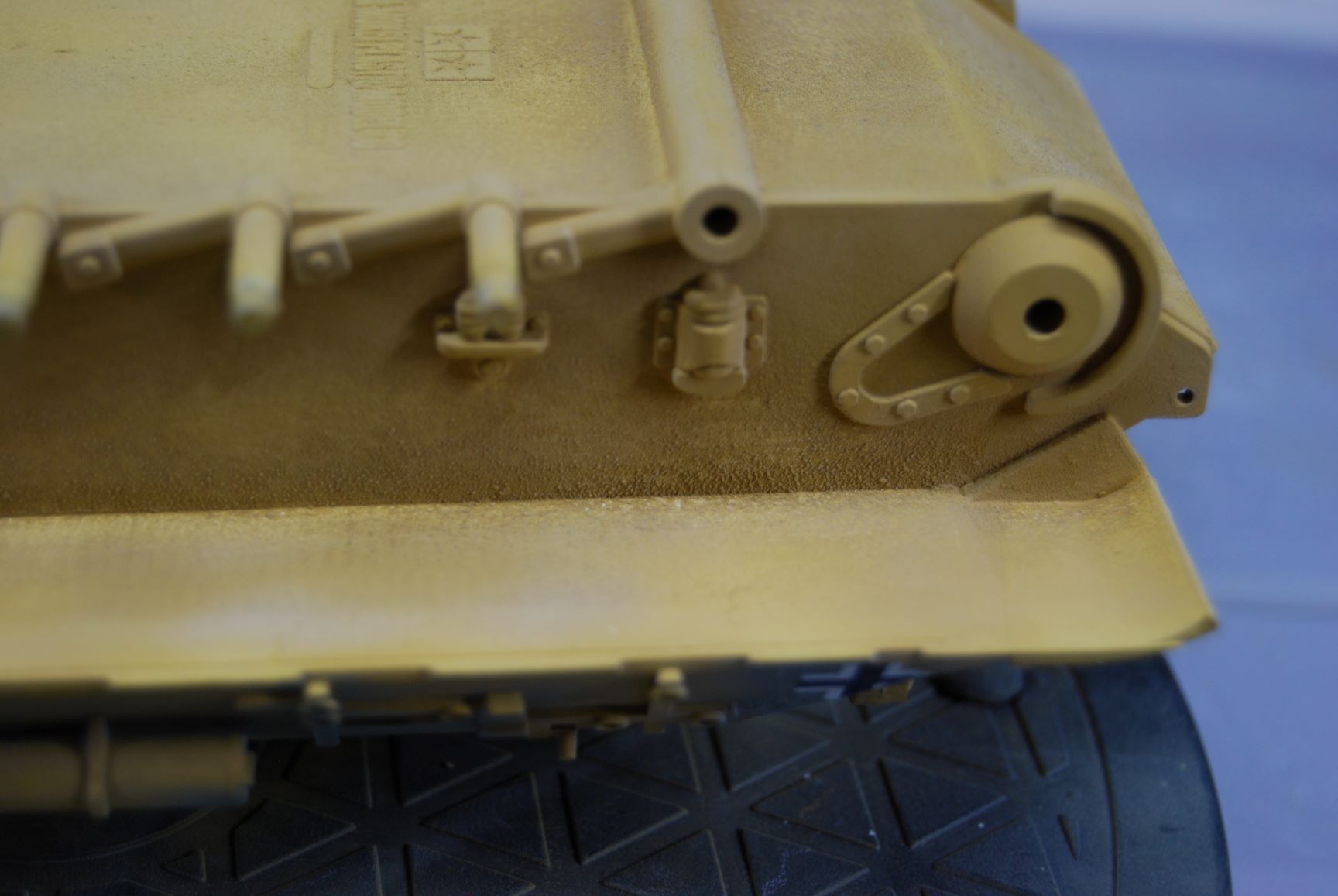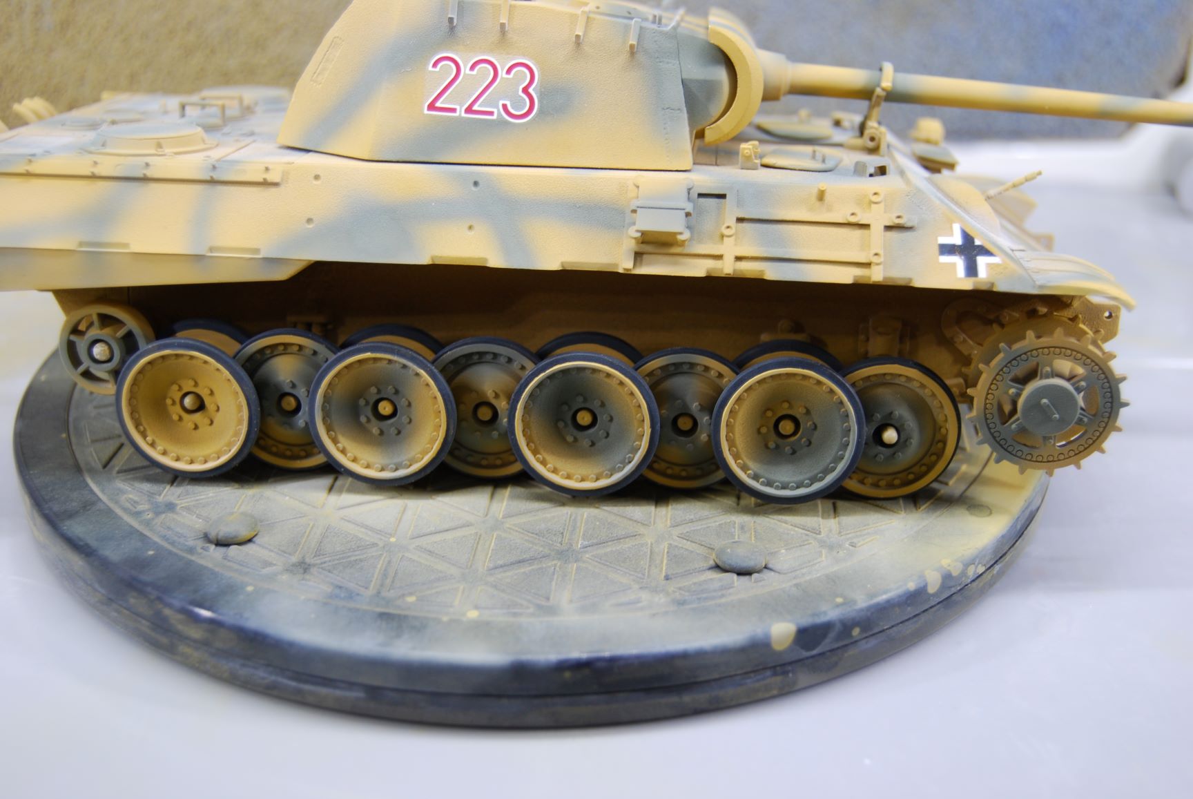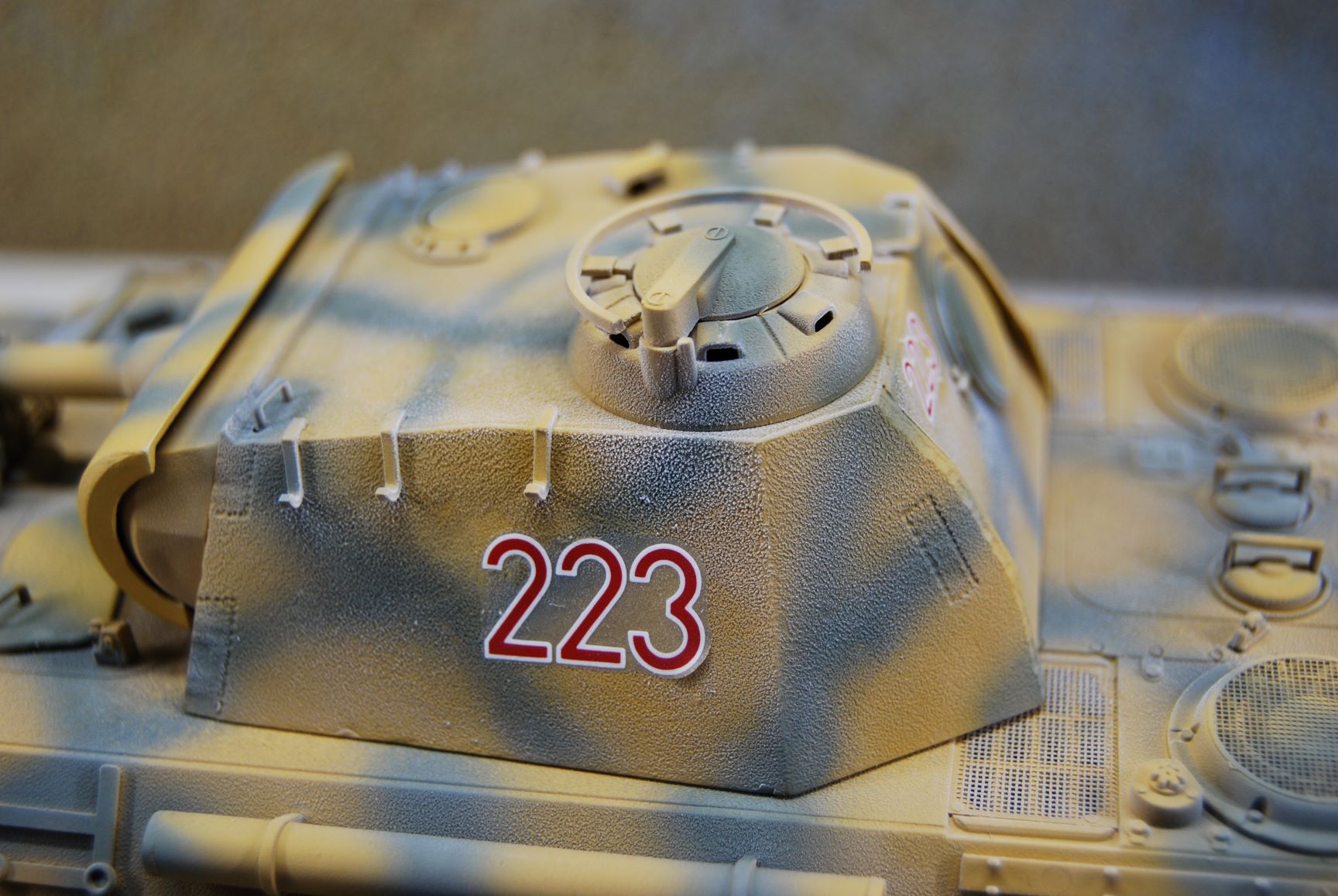 In meinem Nachbarthema "Probleme mit Revell Airbrush Email Basic" geht es ja um die raue Oberfläche der Grundierung an dem Panther A meines Sohnemannes. Nachdem ich die Oberfläche an der Panzerwanne nachgebessert habe, habe ich das Modell mit Sand matt Nr.16 gesprüht und danach mit Grüngrau matt Nr.67. Das Kanonenrohr und die Gitter von ABER habe ich davor noch mit dem Metal Primer von Tamiya behandelt. Nr. 16 habe ich mit 0,3 mm Düse und 1,6 bar Arbeitsdruck verarbeitet und die Streifen aus Nr. 67 mit der 0,2 mm Düse bei gleichem Druck. Eine Lackierprobe mit beiden Farben habe ich vorher auf einem Stück nicht grundierter Polycarbonat-Scheibe gemacht. Da die Oberfläche der Grundierung sehr unterschiedlich ist und auch das Modell an sich auf Wannenoberseite und Turm strukturiert ist, bin ich nicht von einer Babypopo Lackierung ausgegangen. Vor dem Lackieren mit dem Klarlack matt Nr. 2, habe ich noch die Decals angebracht. Wie ich nach diesem Arbeitsschritt in diesem Forum lesen konnte, habe ich dabei einen Fehler gemacht. Ist aber nicht soooo schlimm. ;)