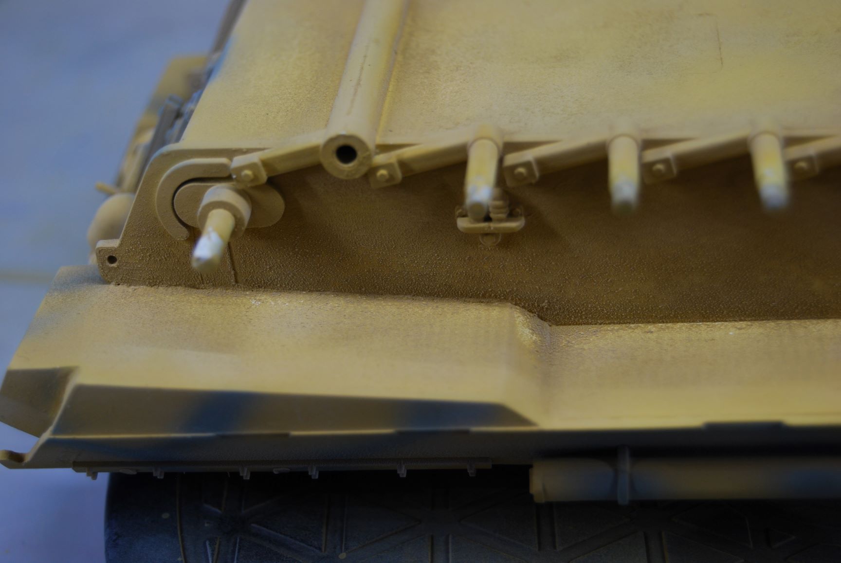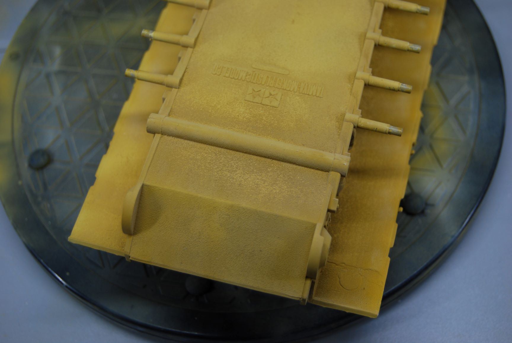 Den Klarlack habe ich 1 zu 2 mit Revell Color Mix Verdünner gemischt und mit der 0,3 mm Düse und 1,6 bar gesprüht. Natürlich vorher auf den Sprühtest mit beiden Tarnfarben auf der PC-Scheibe. Das Ergebnis auf der Scheibe war toll. Aber leider nicht auf dem Panzer. Aber seht selbst.