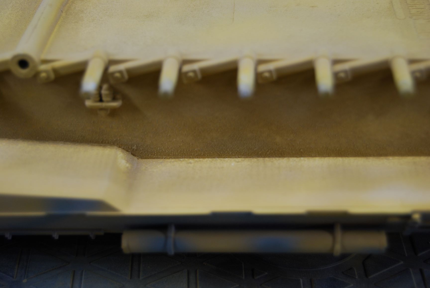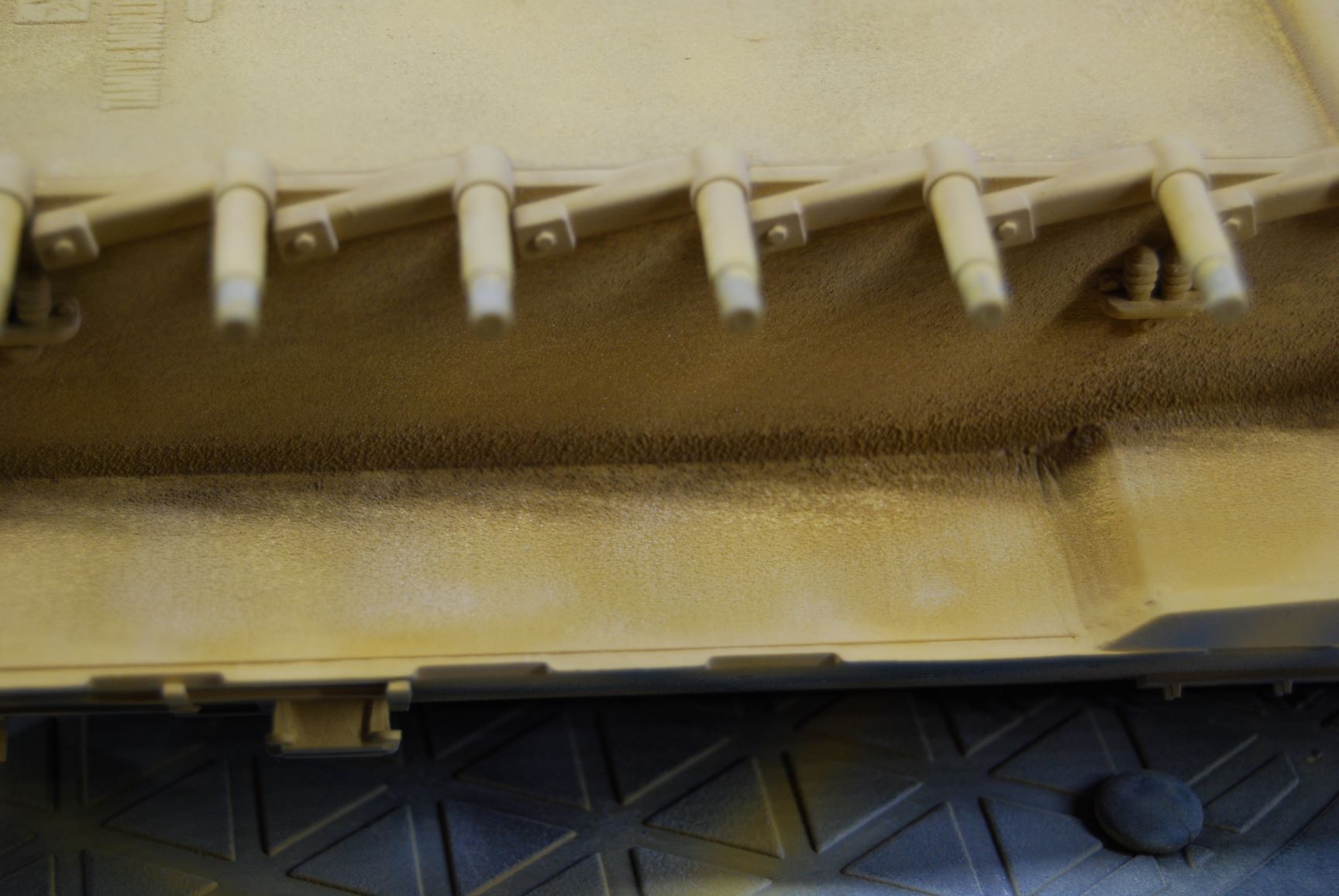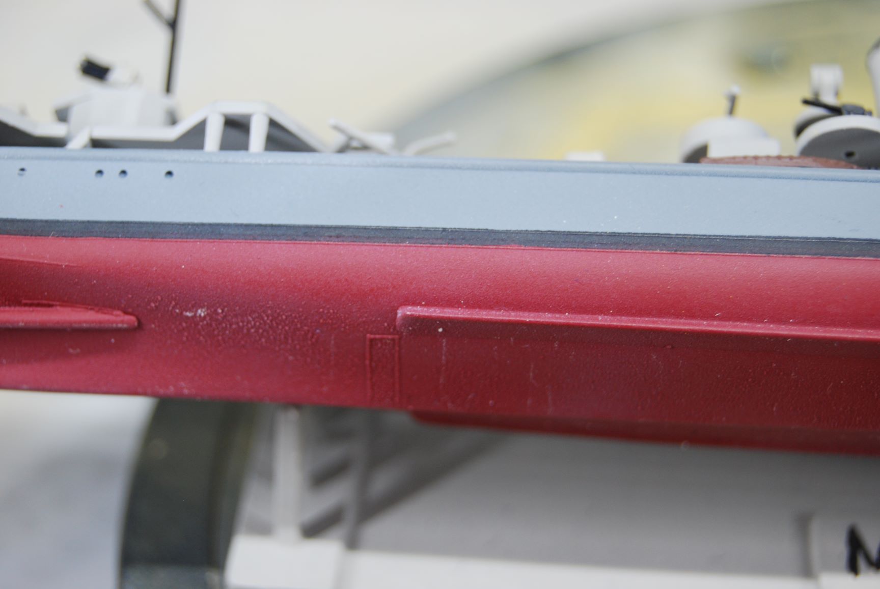 Der Klarlack ist an manchen Stellen recht weiß geworden mit Flöckschenbildung. An machen Stellen sieht es aus wie eine Staubschicht, was an sich ja bei solch einem Modell nicht schlecht ausschaut, aber an anderen Stellen wie Frost. Ich habe mehrere dünne Schichten des Klarlacks aufgetragen und nicht zu trocken. Zwar habe ich auch in diesem Forum gelesen, dass der Revell Klarlack bei einigen Modellbaufreunden recht weiß geworden ist, aber so etwas ist mir noch nie passiert. Als ich diesen Klarlack in den 1990ern für meine Flugzeug- und Panzermodelle verwendet habe, gab es keine Probleme. Besonders ärgerlich ist, dass sich der Klarlack mit dem Grüngrau zusammen leicht abbürsten lässt. Deutlich sieht man das unterhalb des MG's und an der Unterseite der Wanne.