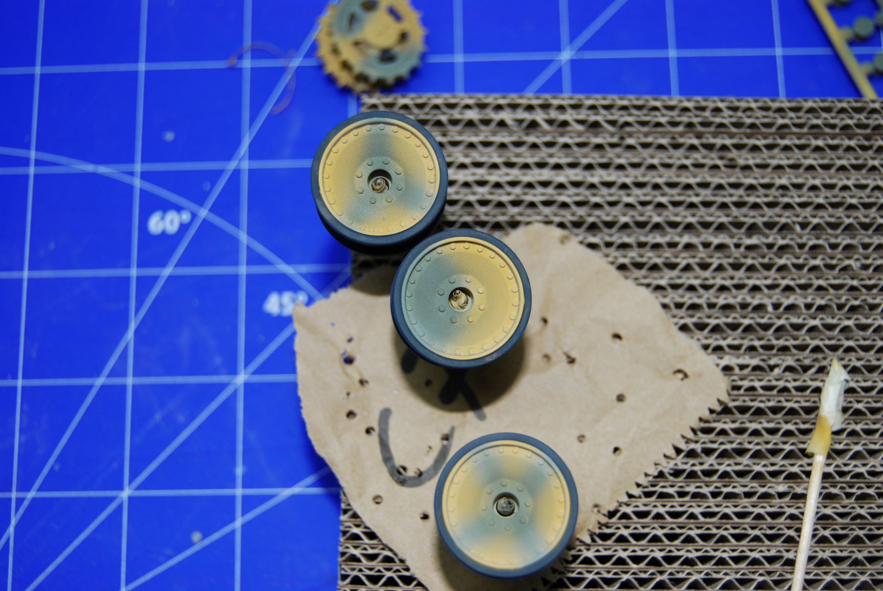 Am besten sind mir jedoch die Laufrollen gelungen, die ich zuerst mit dem Klarlack behandelt habe. Mit dem Rest aus dem Döschen. Am nächsten Tag habe ich den Rest des Panzers lackiert und dafür ein neues Döschen Klarlack aufgemacht.