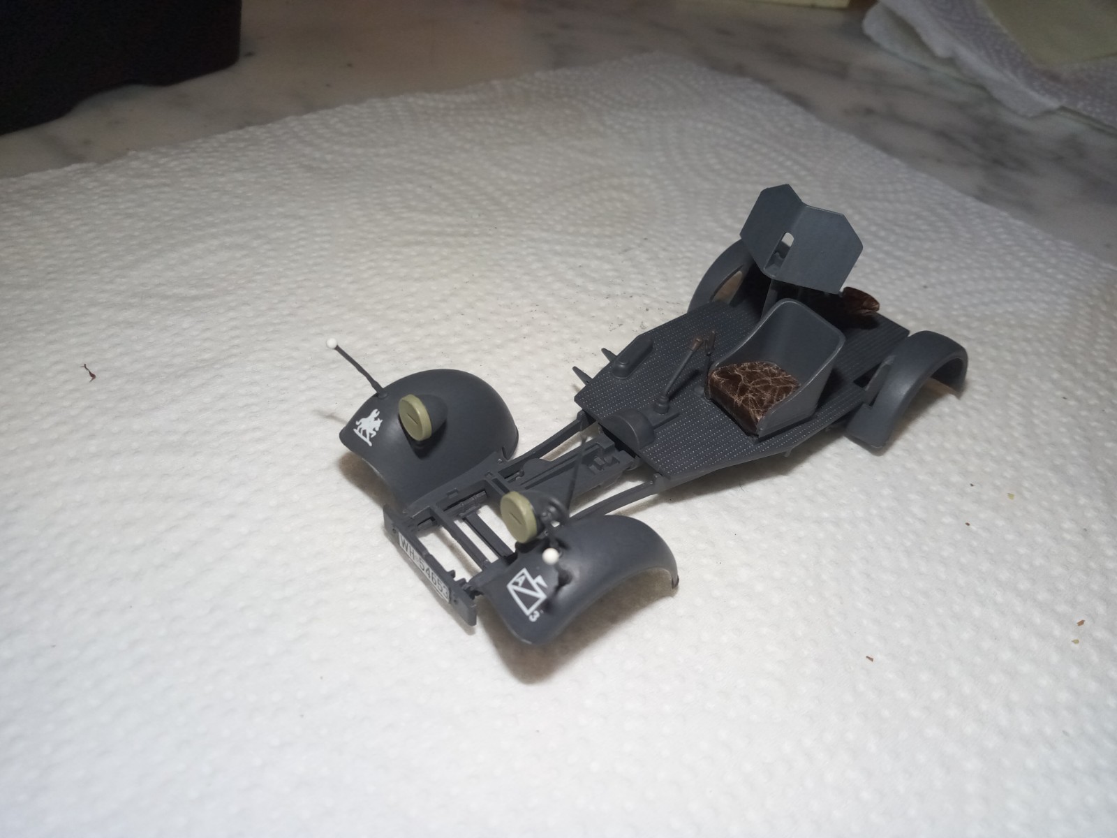 Bei so frühen Fahrzeugen kann ich mir schon vorstellen das man Leder nahm.Ich imitiere damit eine Stoffoberfläche, weil ich skeptisch bin, dass die teures Leder dafür nahmen.