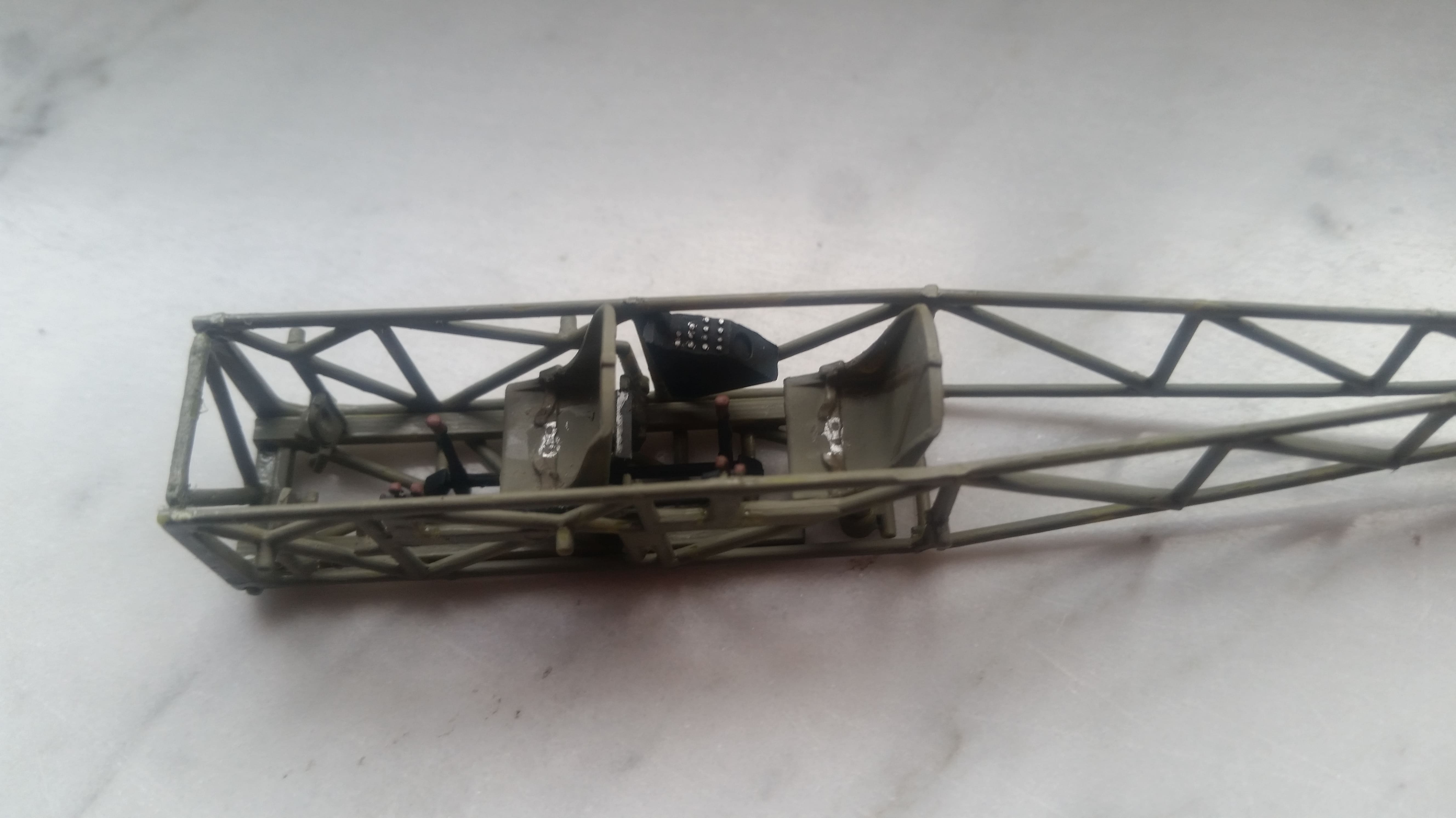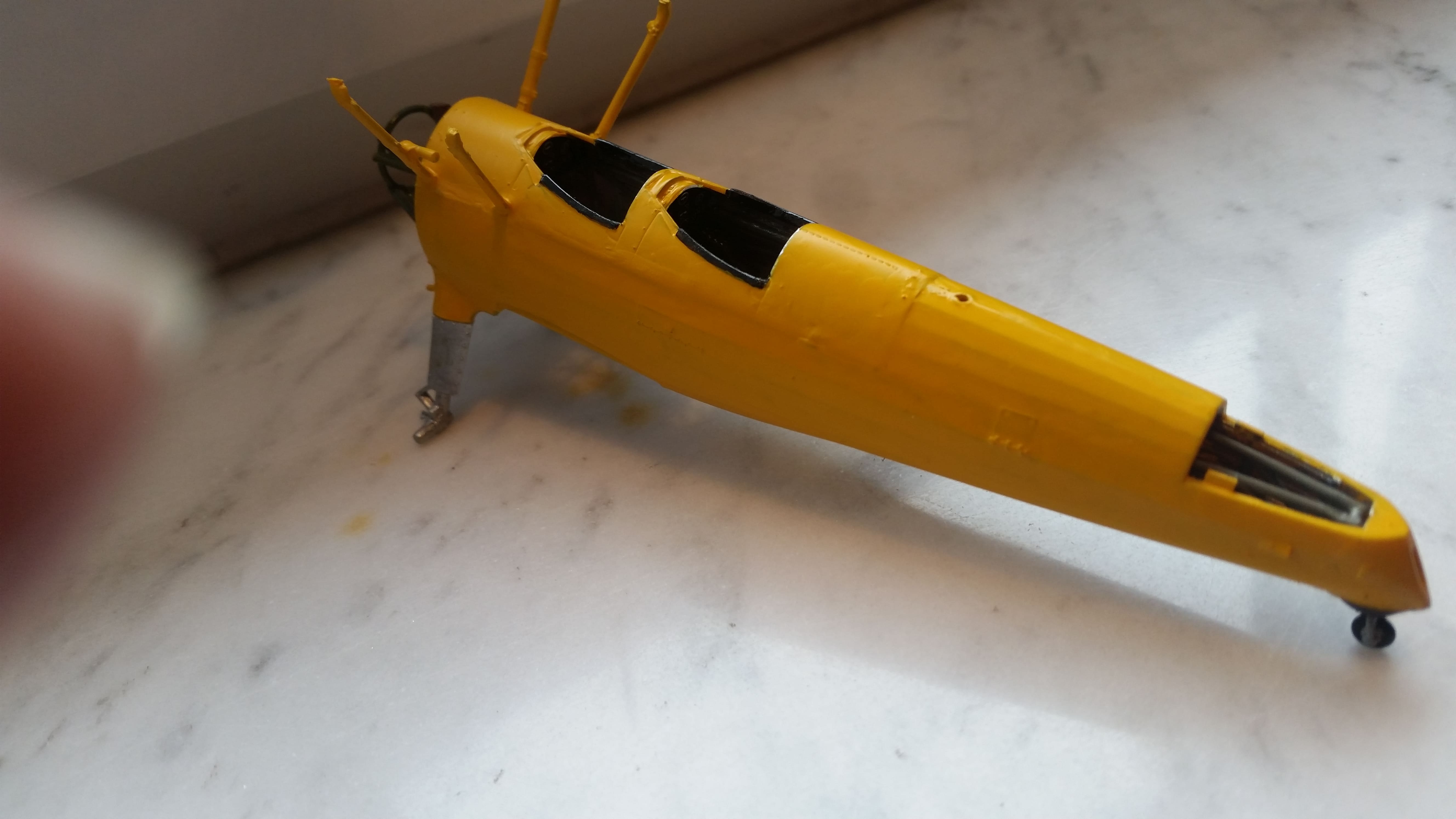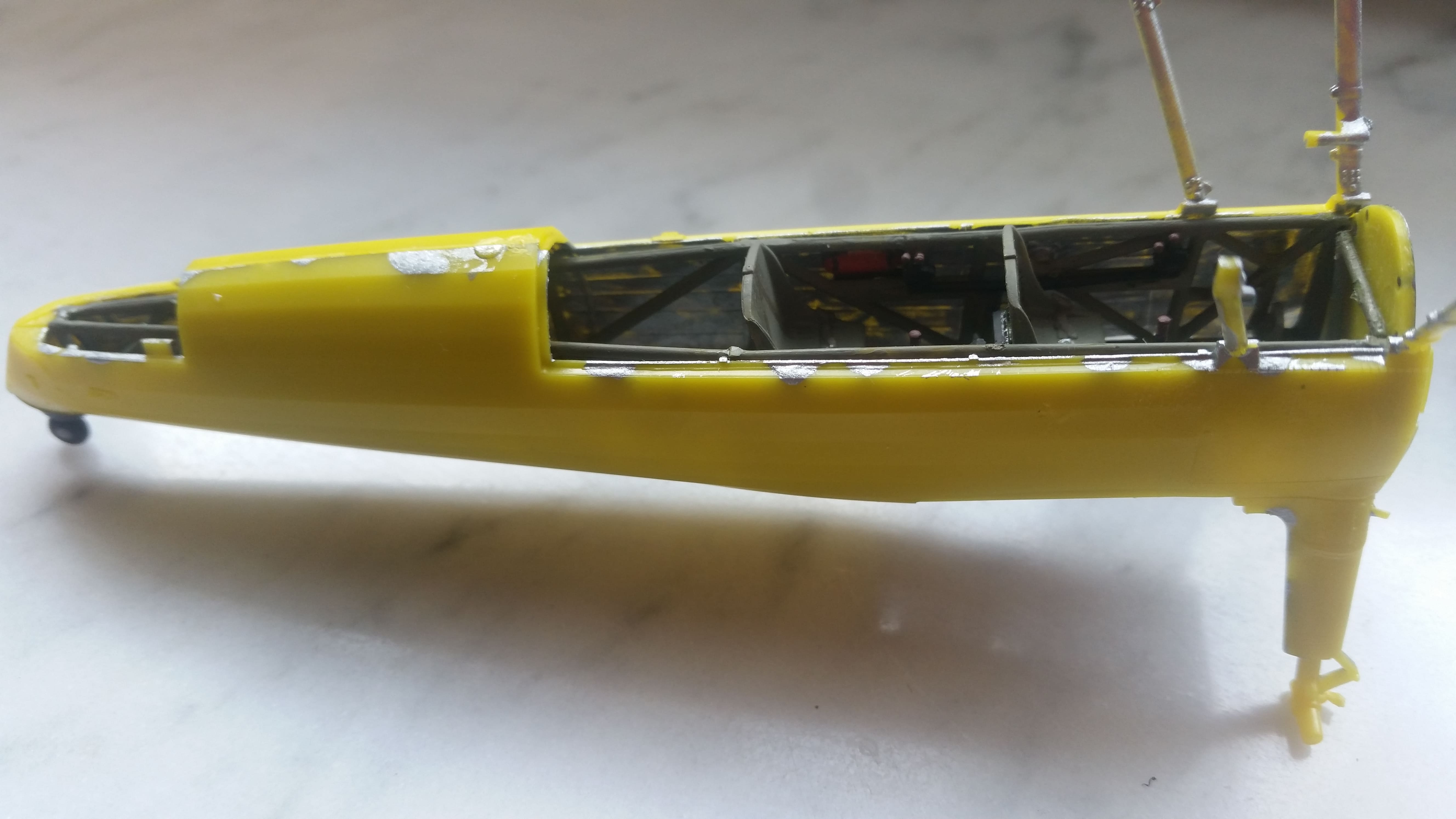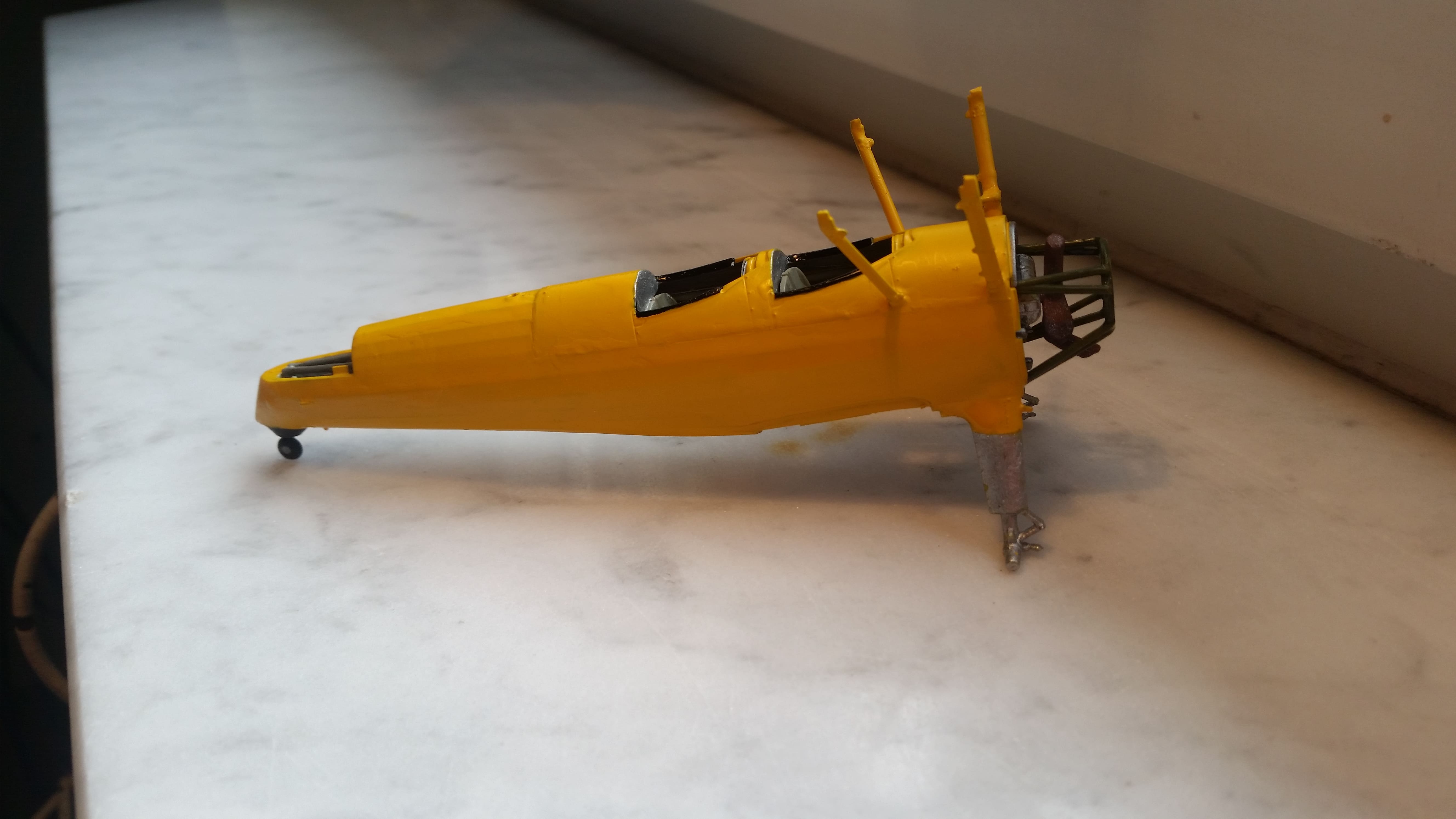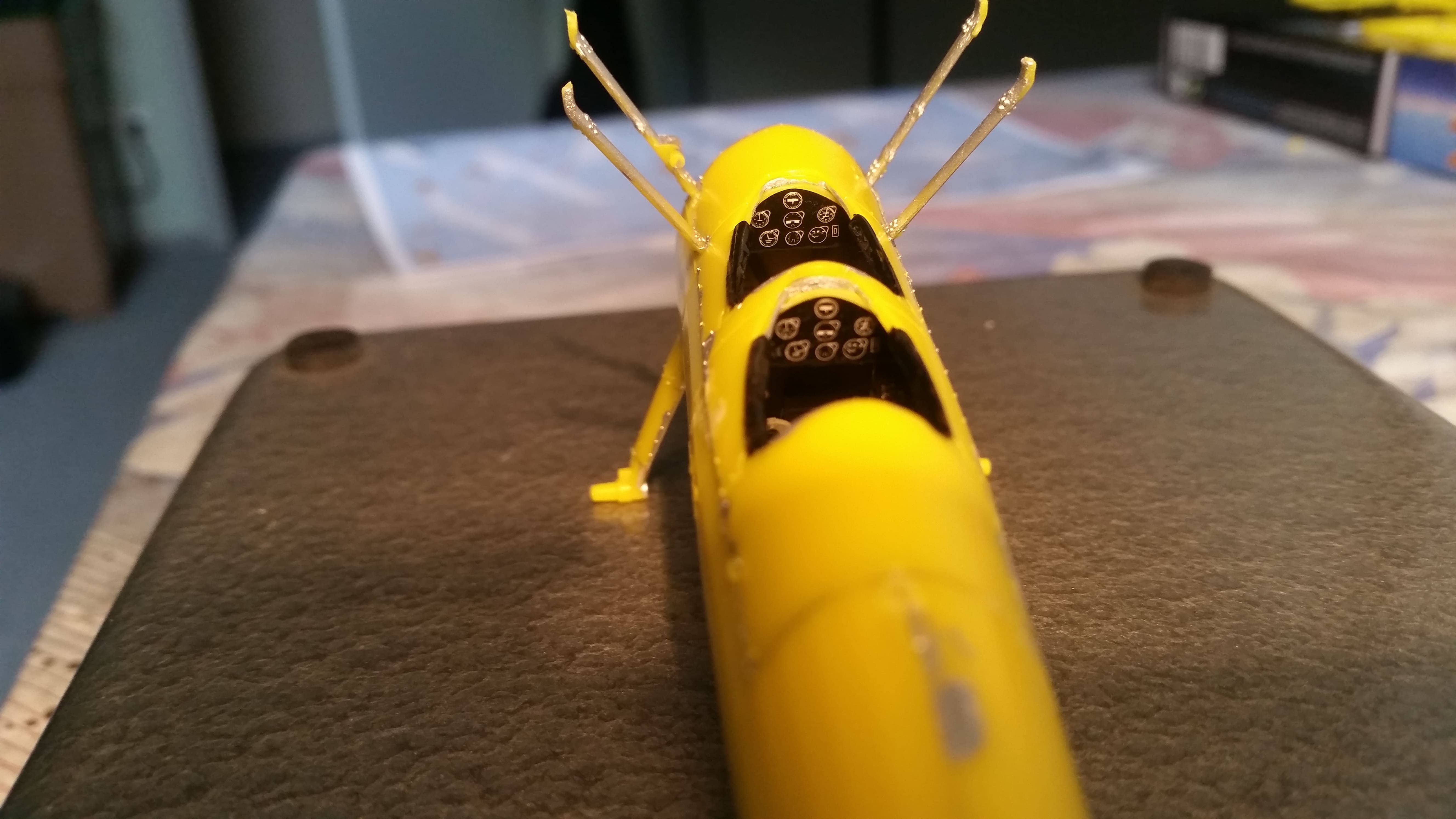 Der "Pilotenkäfig" ist fertig. Allerdings fallen mir jetzt schon mehrere Dinge unangenehm auf. Zuerst einmal die schrill gelben Spritzgussteile, das Bemalen ist mühsam weil dreimal übermalt werden muß, bevor das gelbe nicht mehr durchscheint.