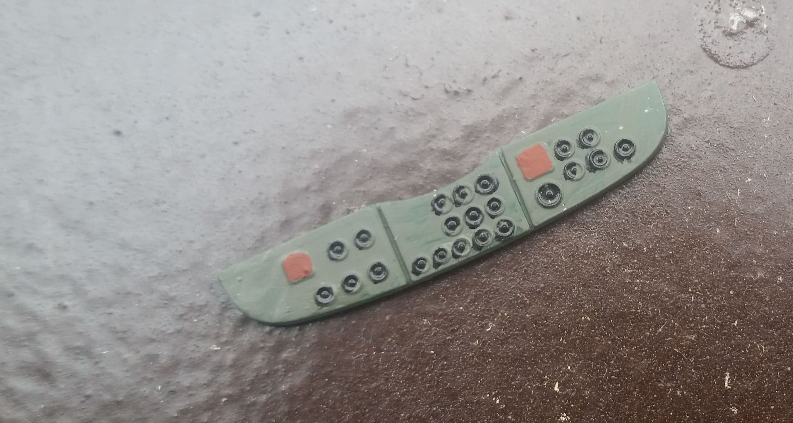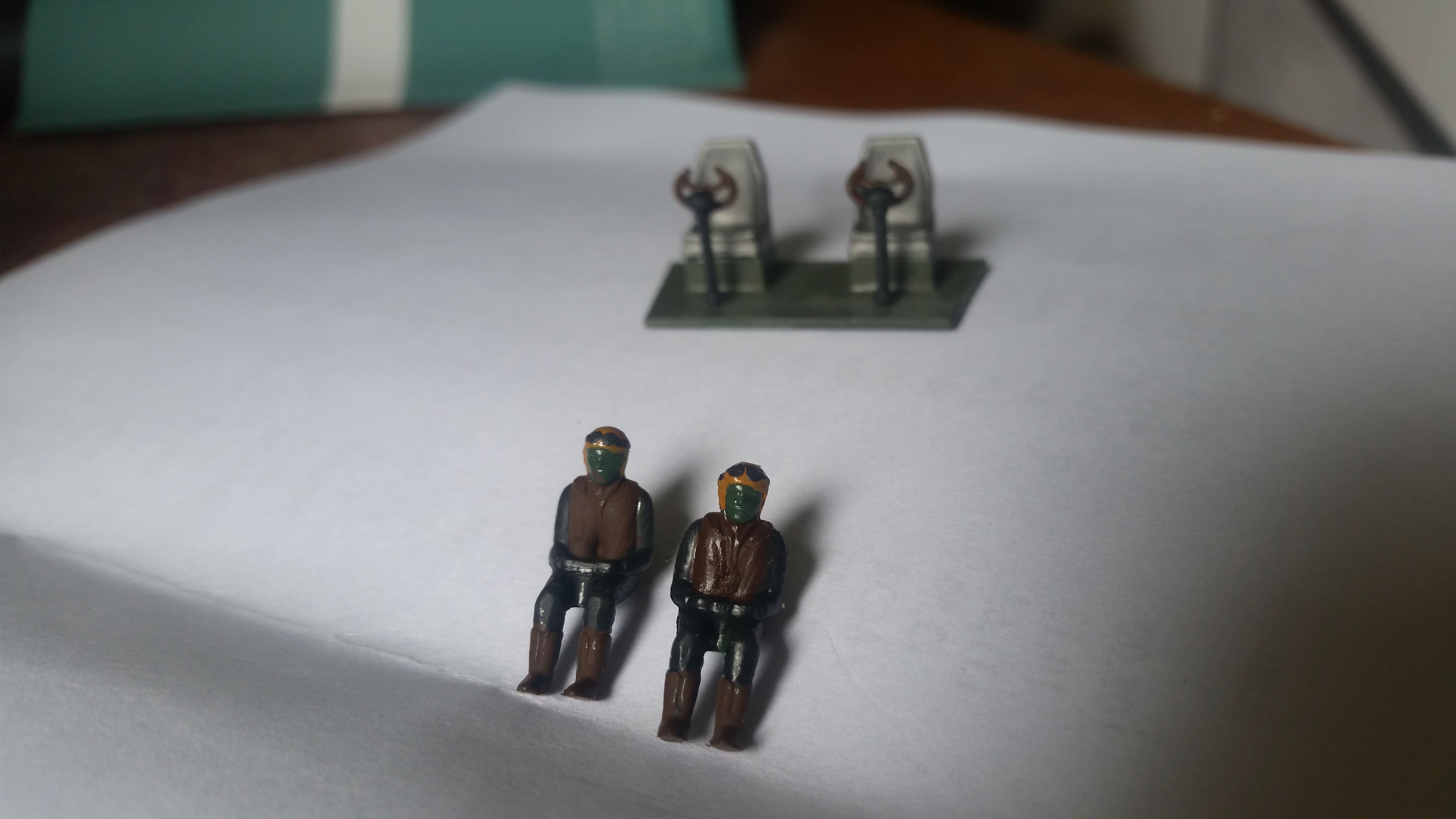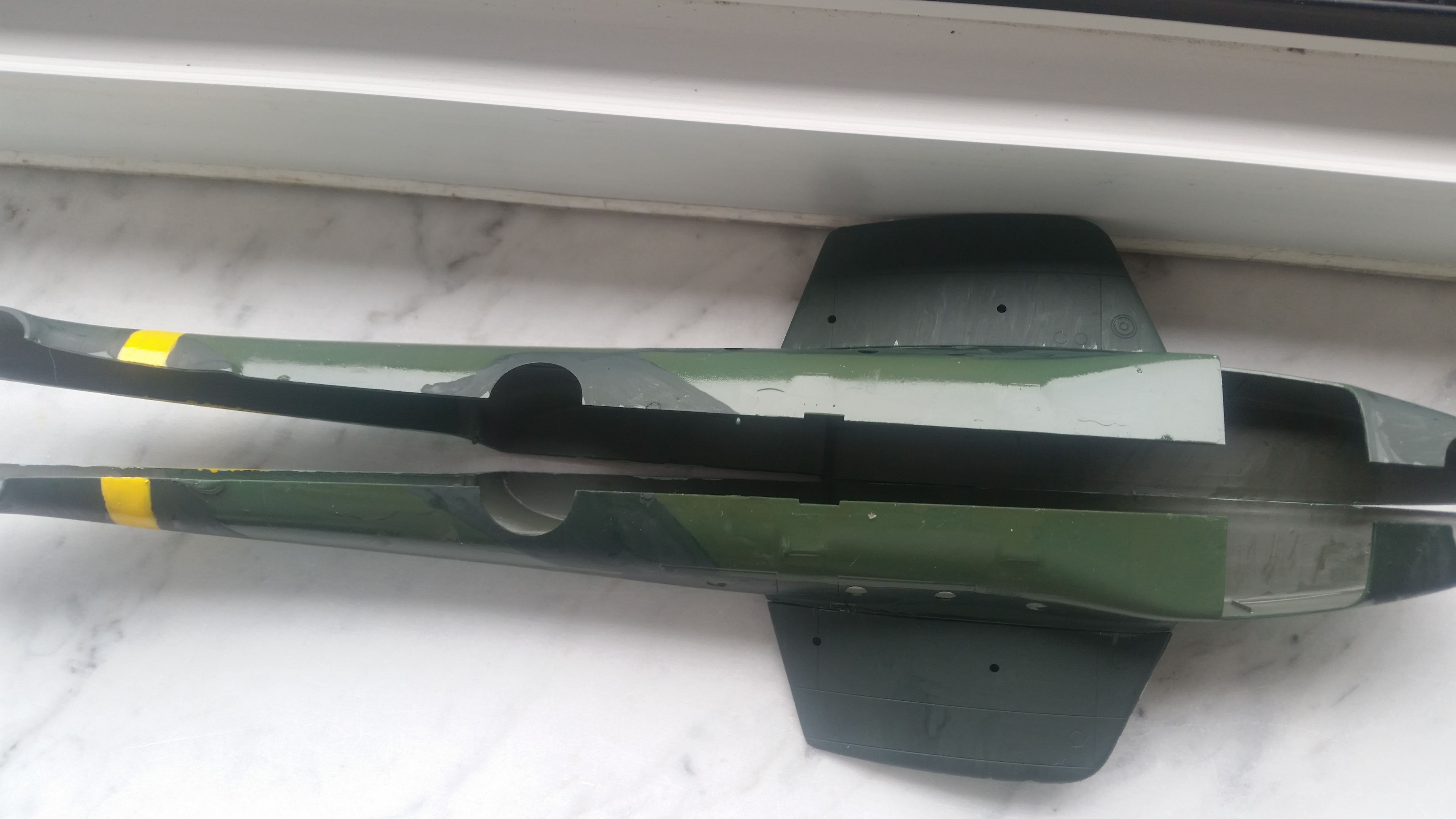 Die Kanzel ist bemalt ebenso die Instrumententafel und der Rumpf. Beim Rumpf tritt wieder dieser merkwürdige Farbeffekt auf. Während Schwarzgrün matt ist, sieht man beim Dunkelgrün matt glänzende Stellen