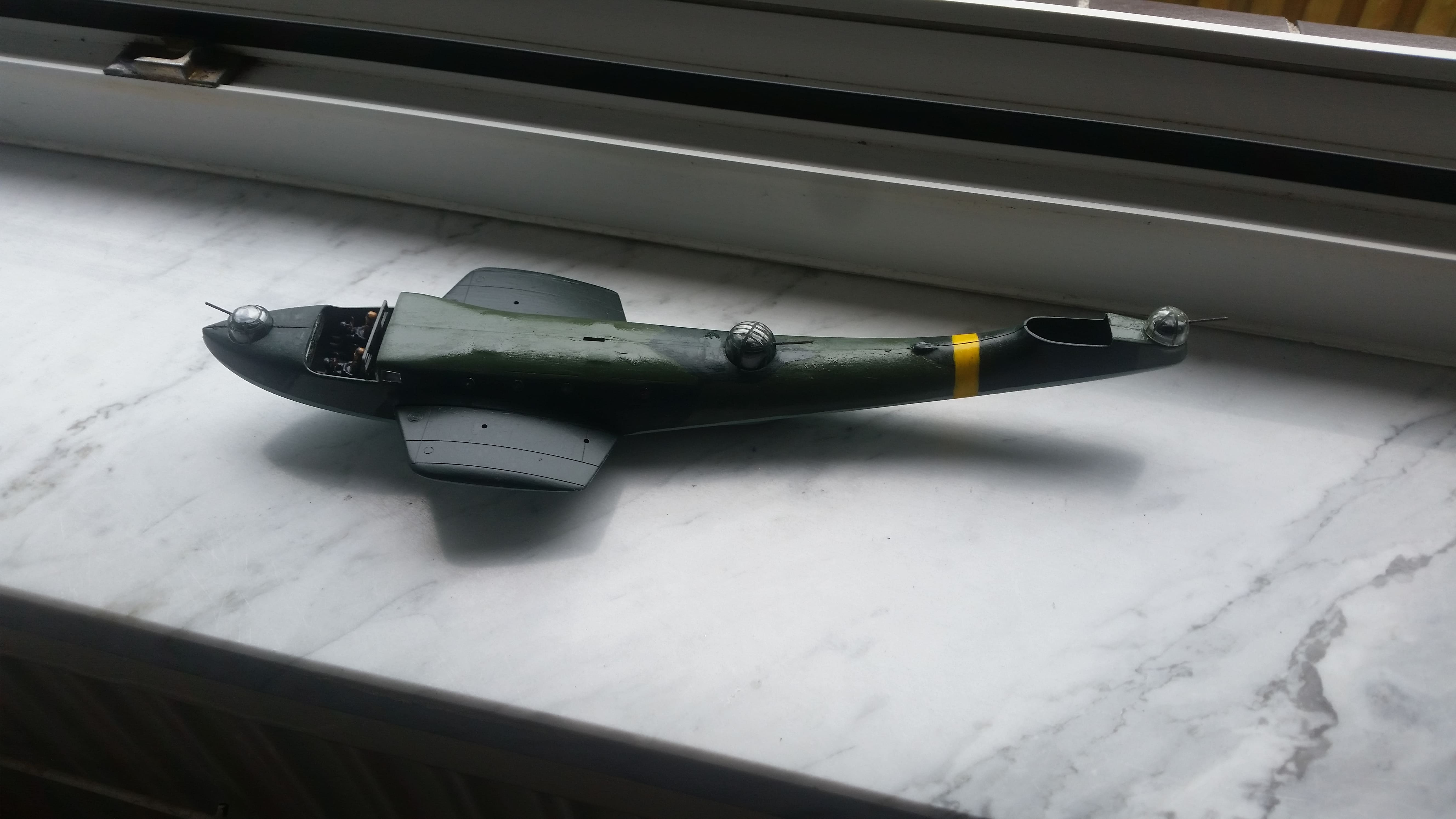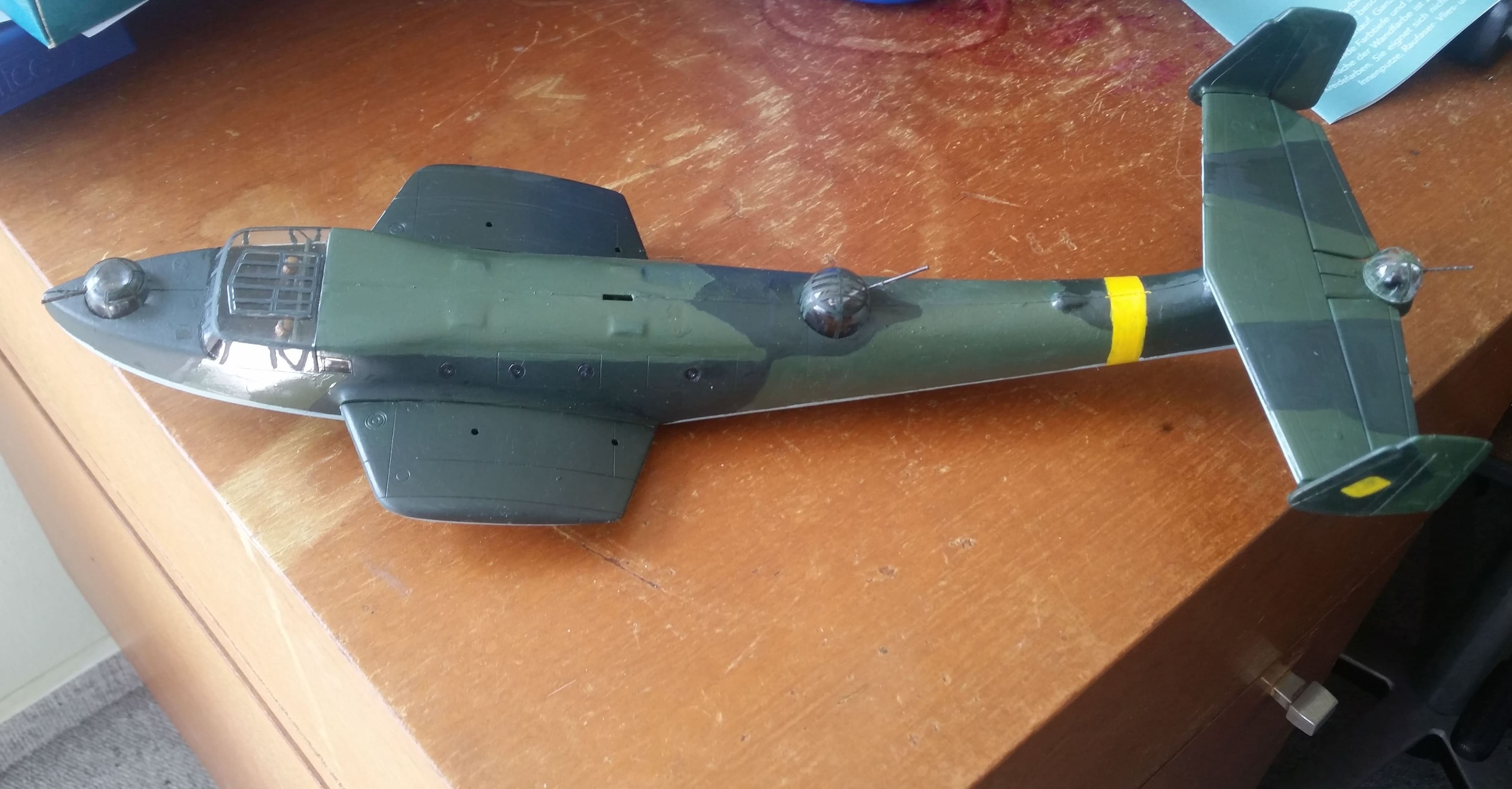 Die Bemalung nervt mit diesen Acrylfarben mehr als das sie Spass macht. Ansonsten ist der Rumpf zusammen, die Geschützkanzeln und die Pilotenkanzel eingebaut. Die Geschütze sind vorne und hinten MG 15, 7,9 mm und in der Mitte die MG 151 20mm, alles Defensivbewaffnung. Die zwei vorderen Geschütztürme sind bei dem Modell drehbar, das hintere musste angeklebt werden. Auch das hintere Leitwerk ist eingebaut.