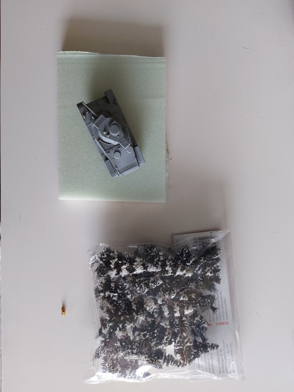 Im Laufe des Tages entstand auch der erste Schritt fürs Diorama. Bäume hab ich im ortlichen Modellbahn Laden gekauft. Der Boden soll zunächst aus Gips bestehen und wird dann mit Schlamm in den Fahrrinnen und Schneepulver bedeckt