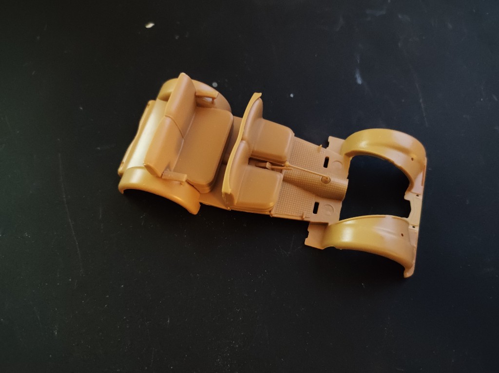 Zunächst wurden die Sitze, Schalthebel und Handbremse angebracht. Jetzt zeigte sich aber ein sehr hässlicher Versatz, das zog sich an vielen Teilen so durch. Eigentlich ein Unding, die Form ist von 2012 und von einem Hersteller wie Italeri erwarte ich schon ein wenig mehr Qualität, wenn es sich dabei um Formneuheiten handelt.