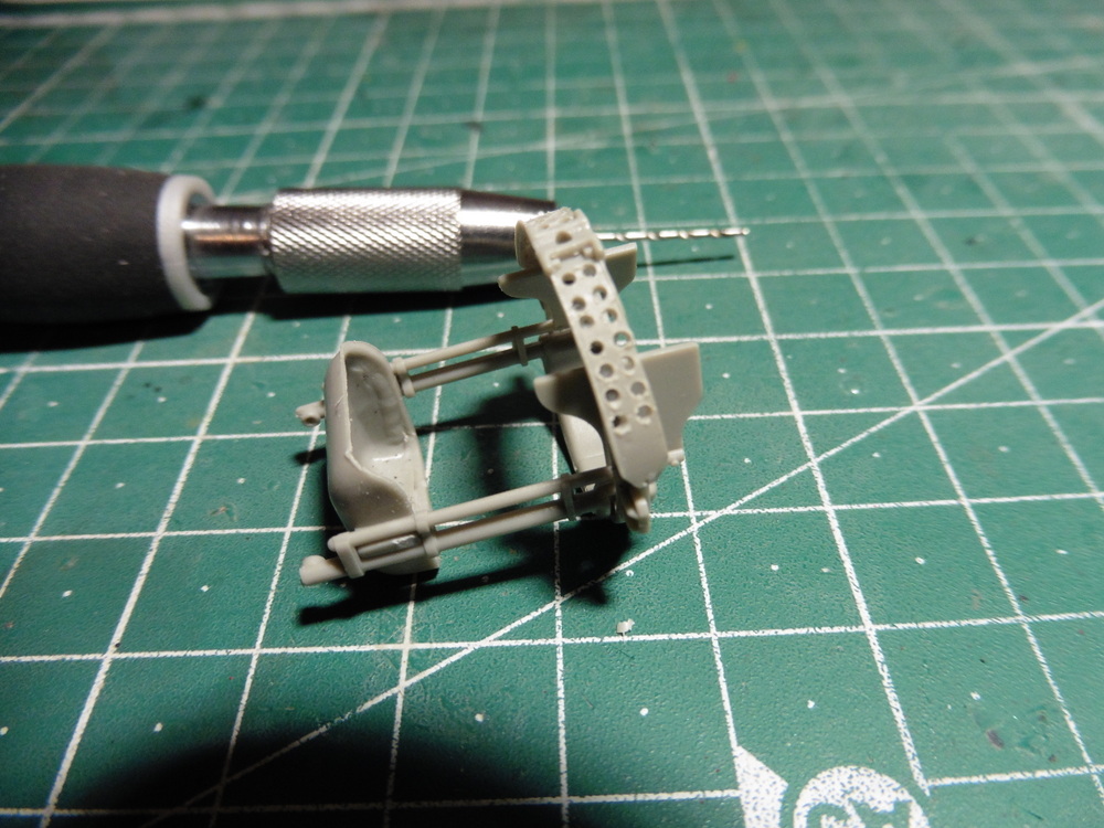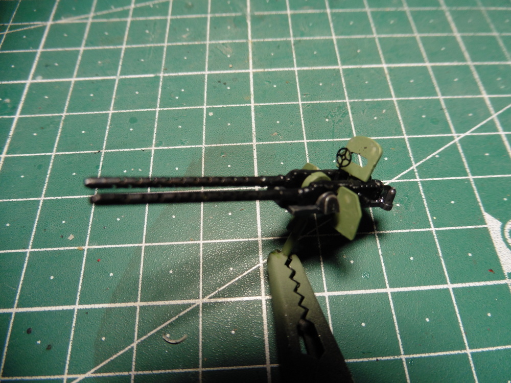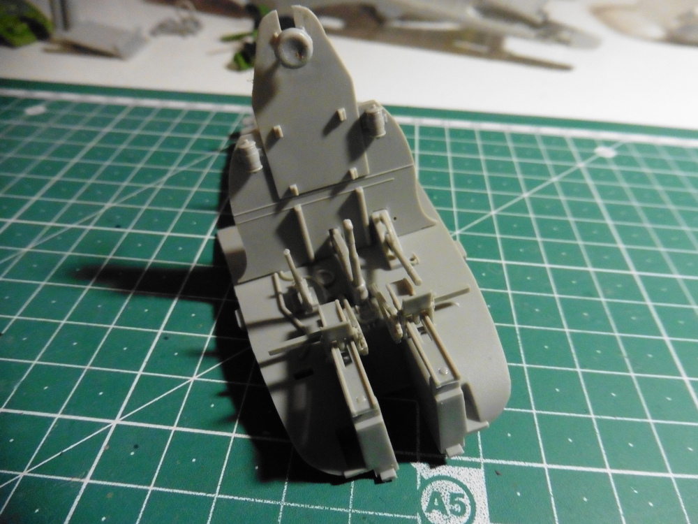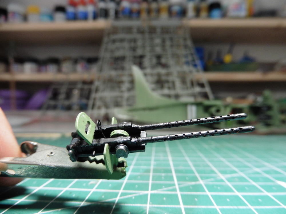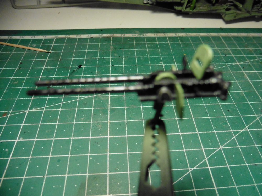 so gestern hab ich mich noch um den hinteren Gunnerplatz gekümmert. Die Sitz- Steh-Gondel war einfach . Die Halterung des Doppel 7,62 Geschützes war nur angedeutet gelocht . Ich habe dann mit einem Handbohrer die Löcher nachgearbeitet war ziemliche Fummelei war .