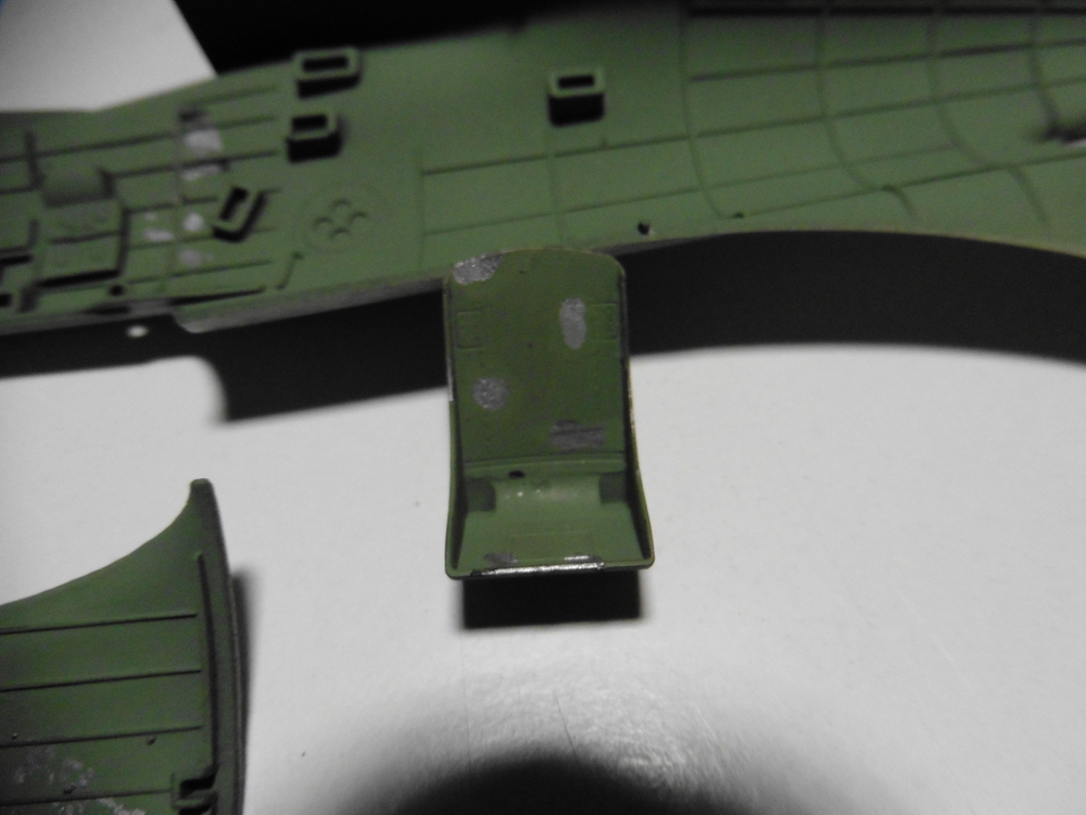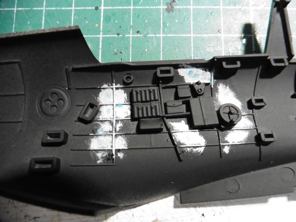 Also nachdem ich soweit alles vorgebaut habe wurde das ganze mit FinePrimer Schwarz besprüht . Als nächstes geht es darum , Abnutzungsspuren im Cockpit zu realisieren . Meine Vorgehensweise , die Bereiche , die sichtbare Abnutzungen haben sollen , werden mit Aluminiumfarbe gestrichen. Das ganze kann grob / großflächig gemacht werden . Als nächstes wird mit einer Maskierflüssigkeit der Bereich mit einem Pinsel ( auf jeden Fall keinen Guten benutzen , eher einen der dann weg kann ) leicht betupft. Man kann auch ein kleines stück Schaumstoff benutzen welches man vorher leicht ausgefranzt hat Das Ganze sieht dann so aus Nach ca 30 min kann man dann mit der Cockpitfarbe beginnen . Hier habe ich Cockpit Green vom Tamiya XF-71 genommen . Die Vorgabe Zinc Chromatic Type1 sah meines erachtens nicht gut aus.