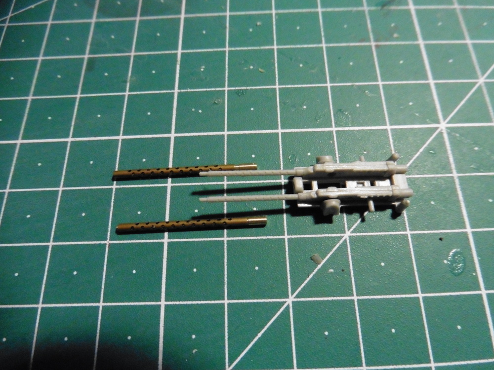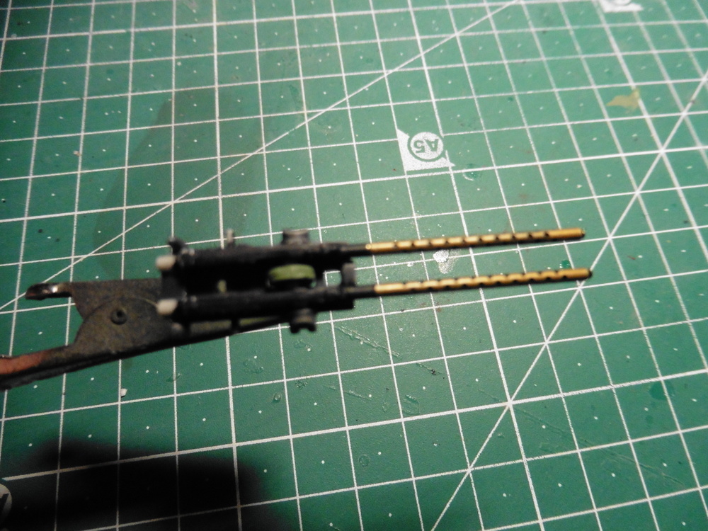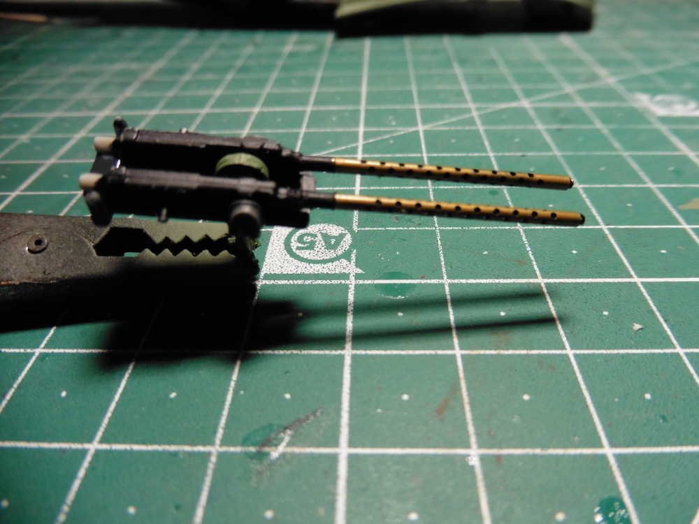 Als nächstes waren die beiden Browninngs dran ... diese sehen dann so aus , Da die MG´s ja nun mal ein Highlite des Fliegers sind ( Optisch natürlich ) fand ich diese doch echt spärlich . Zum Glück hatte ich in meinem Funduss noch 2 Bronnings Geschützrohre aus Messing in 1/32 liegen .