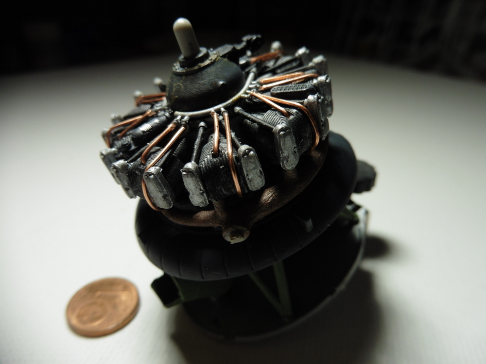 Der Motor wurde erst einmal schwarz gemacht . Dann habe ich mit Silber im Trockenmalverfahren die Lamellen hervorgehoben. Dann kamen alle anderen Bauteile drangeklebt. Hinter dem Motor wurde die Abgasrohre ausgeglüht bemalt (rostig ) und angebaut . Somit wäre der Motor eigendlich fertig gewesen . Leider oder zum Glück waren vorne in den Zylindern jeweils ein Loch für die Glühkerzen. Weder Kerzen noch kabel lagen dem Modell bei bzw gab es im Bauplan einen Hinweis wie zu verfahren wäre. Da das nicht mein erster fetter Motor war , und auch nach Recherche im Internet , habe ich gedacht , dass ich einfach Küpferdraht vom Verteilerstrang zum Zylinder lege . Ich hatte zwar noch verschiedene hier , aber entweder zu dick oder zu dünn. Musste mir auf meiner Baustelle erst einmal 1 m Klingeldraht vom Elektrischen borgen