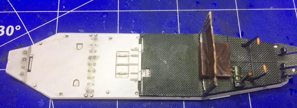 Als nächstes kamen die Seitenteile an das Unterteil. Das verzogene Teil habe ich erst an einem Ende angeklebt, über Nacht trocknen lassen und dann Stück für Stück fixiert und veklebt. Hat etwas länger gedauert, ging aber recht gut. Leichte Spalte habe ich teilweise mit Sekundenkleber und Acylputty von Vallejo aufgefüllt. Bei letzterem kann man nach ein paar Minuten den Überschuß prima mit feuchten Wattestäbchen wegwischen. Das spart Schleifarbeit und schont Details.