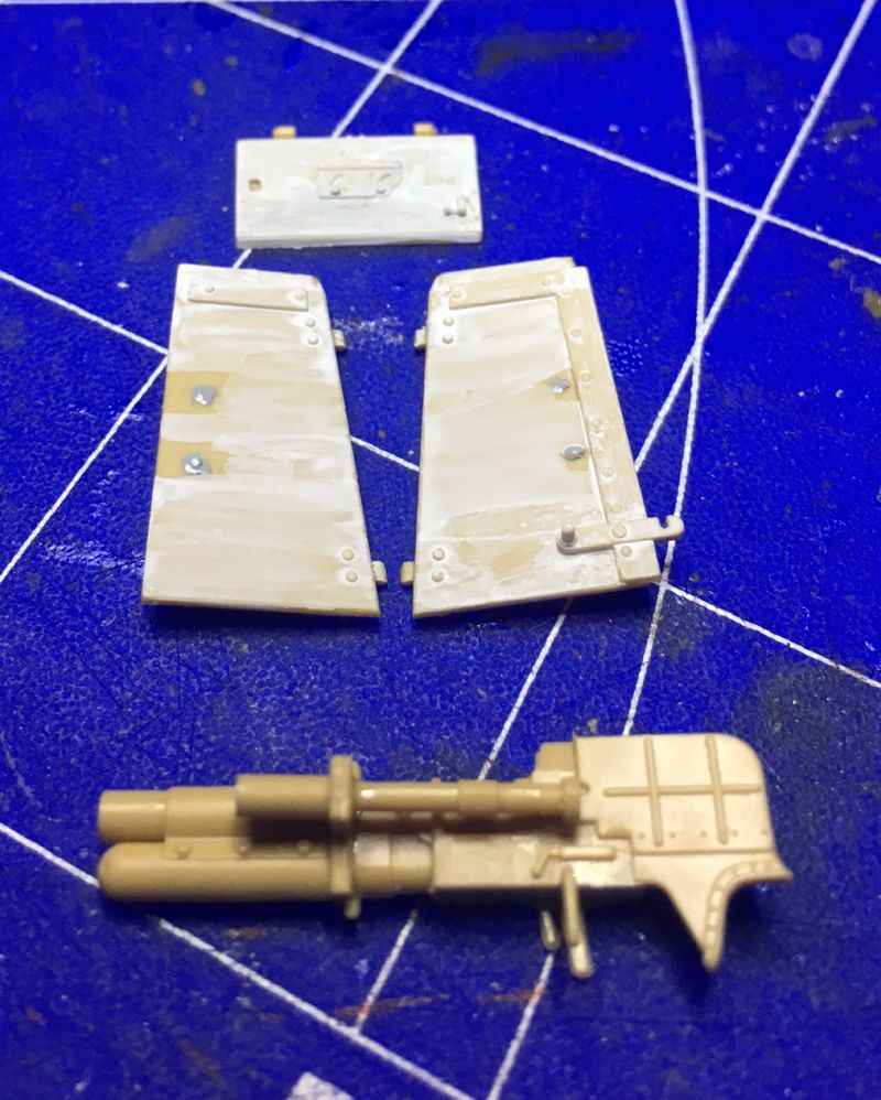 Die Klappen für den Fahrerplatz wurden mit Griffen versehen und mit dem Pinsel dünn grundiert. Danach kam dann Innenraumweiß und Alterung drauf. Alle erhabenen Stellen wurden natürlich wieder trocken gebürstet.. Die Waffe besteht bis hier aus 5 Teilen.