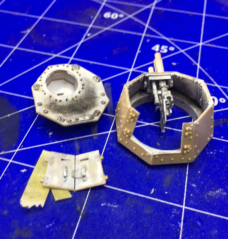 Die Turmteile sind nun alle verklebt. Beide Türen sind mit Abdeckband fixiert, damit die Innenseite mit der Airbrush grundiert werden kann. Auch der "Deckel in fertig. Die Waffe ist montiert, bleibt jedoch beweglich.