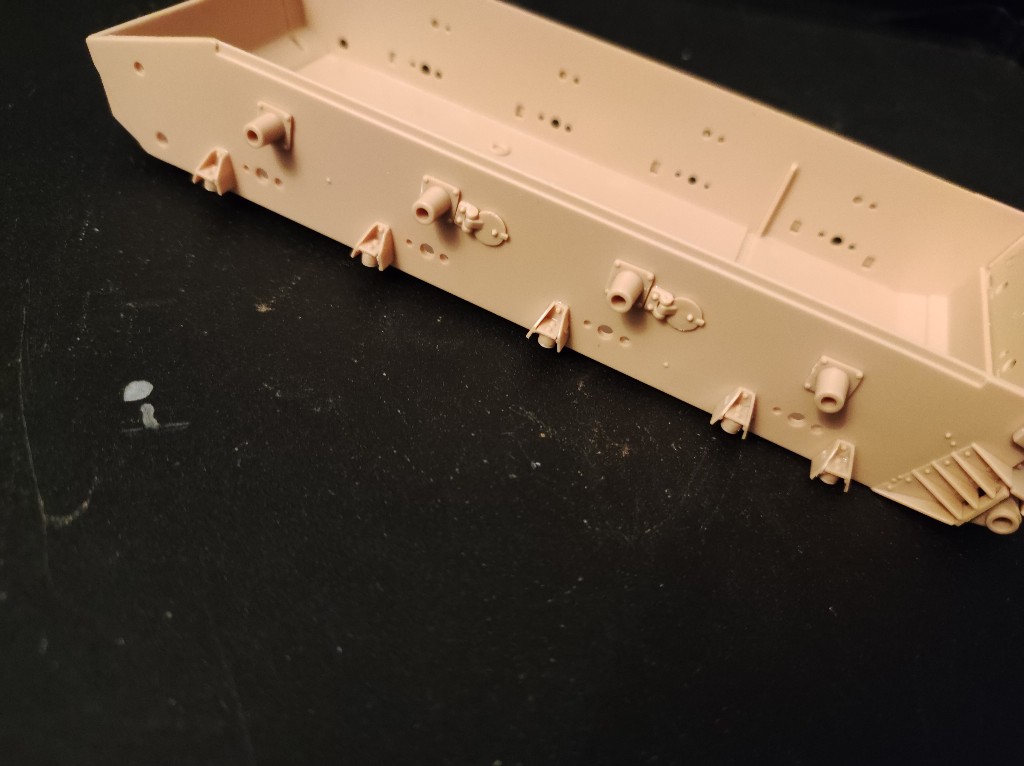 An der Front ging es mit zwei weiteren Platten weiter. Hier mussten die Abschleppösen noch einmal angeklebt werden