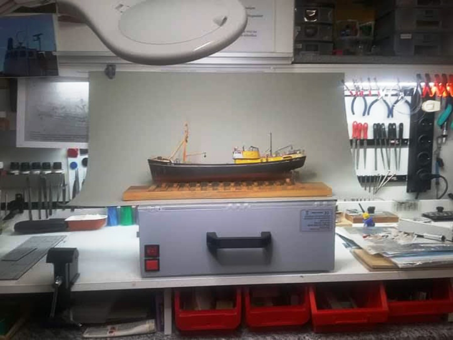 Bei der Platte muss ich auch zugeben dass sie größer sein könnte es war eine reine Preisfrage ,ich hätte sie auch mit größerem Umfang bestellen können. Auch dass das Boot etwas zu weit über der Wasserlinie liegt ist mir aufgefallen, ich war anfangs nicht sicher wie ich es gestalten soll denn es soll ja nicht nur träge im Wasser liegen sondern in schneller Fahrt durch die Wellen schießen, das nächste Mal werde ich so etwas auf jeden Fall tieferlegen da ich jetzt die Erfahrung bereits gemacht habe... fotografiert hätte ich das Diorama natürlich gerne vor einem schöneren Hintergrund z.b. draußen auf dem Terrassentisch, da ist halt nur mein Problem dass sich das Wunschkind im selben Haus befindet und ich das Projekt ja irgendwie geheim halten muss