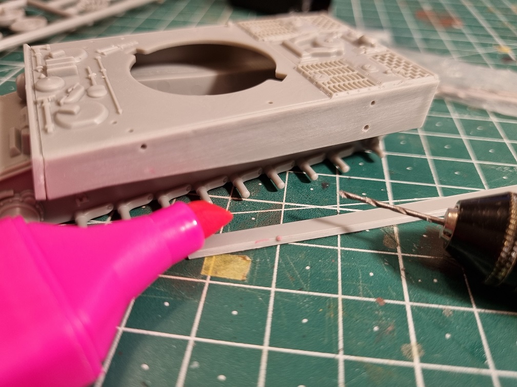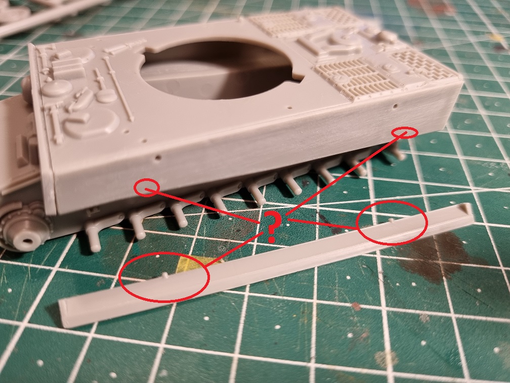 Es folgte ein kleines Rätsel - an der Seite sollte die schräge Panzerung angebracht werden... diese hatte 2 Befestigungsnippen. Doch an der Wanne waren dafür keine Löcher (die zu sehenden Löcher sind später für das seitlich angebrachte Schleppseil gedacht und wären für die Seitenpanzerung ohnehin viel zu weit oben: