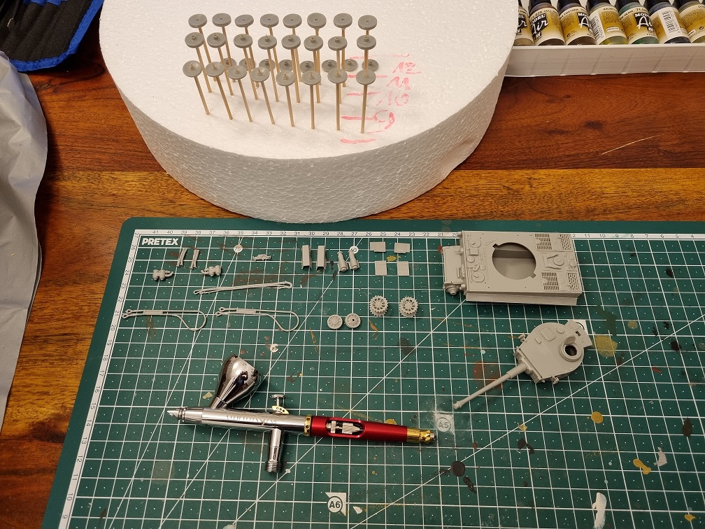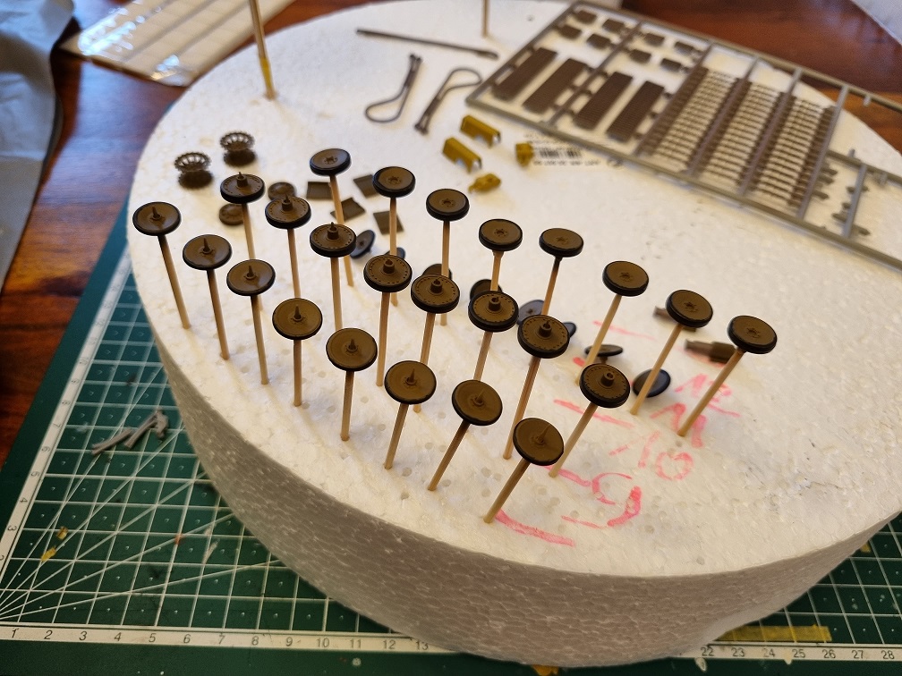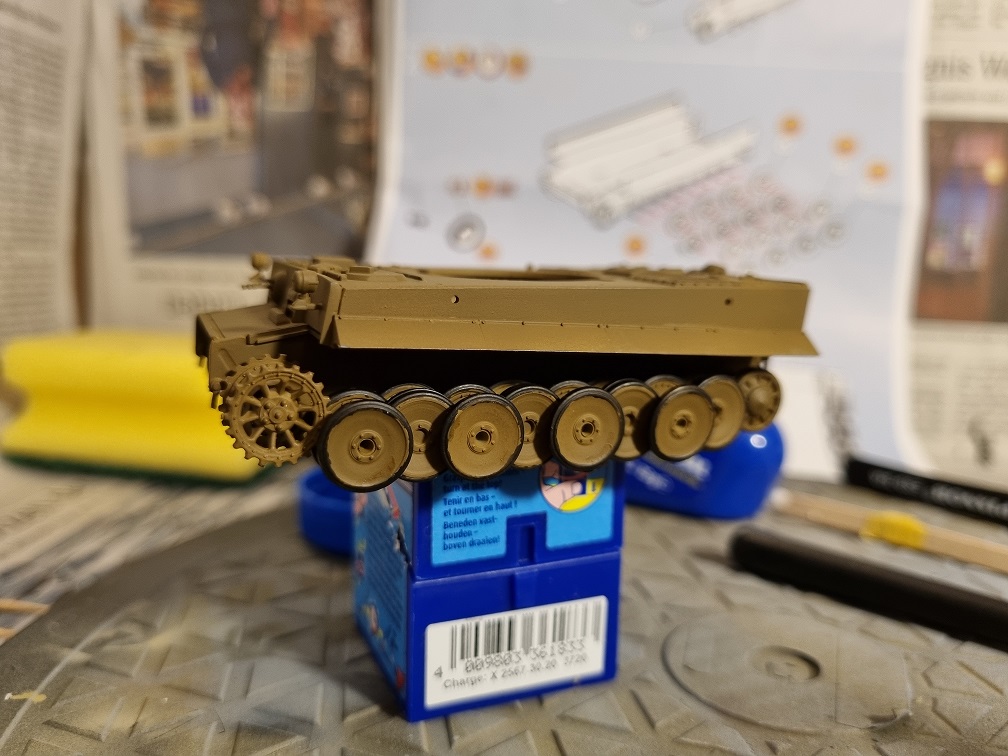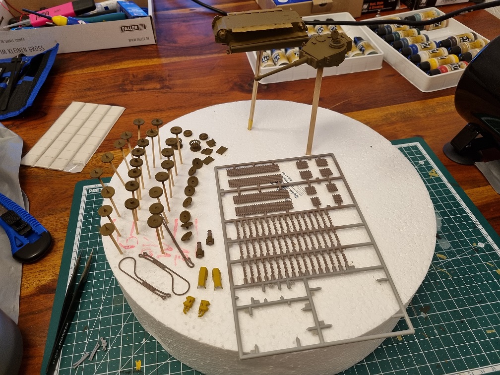 Die Antriebs-/Laufräder und die Umlenkrollen werden erst nach dem Lackieren in der Grundfarbe angebracht. Ebenso wie die Ketten, welche vorher natürlich erstmal lackiert werden. Die vorderen und hinteren Abdeckplatten der Ketten werden montiert, sobald die Ketten fertig sind. Das gibt mir etwas mehr Spielraum zur Montage der Ketten.