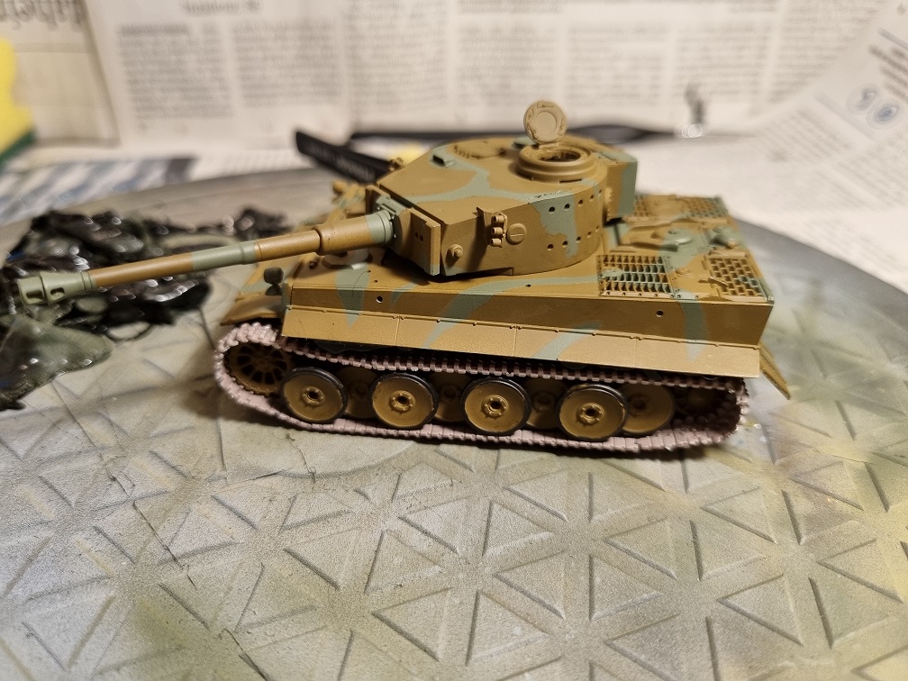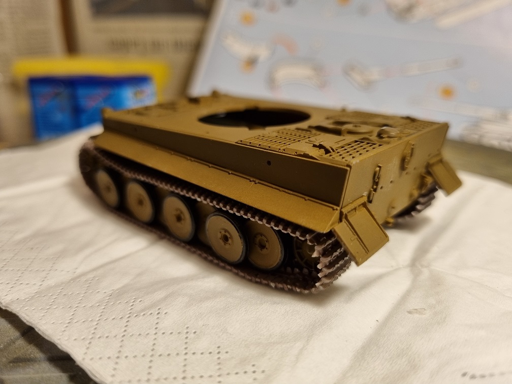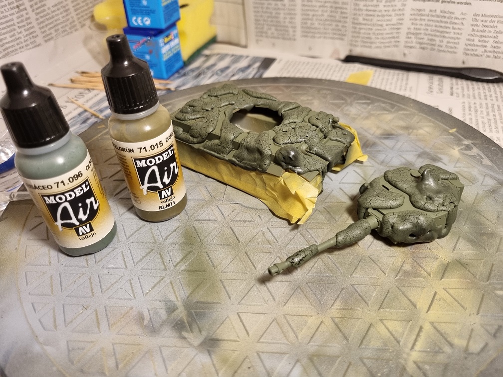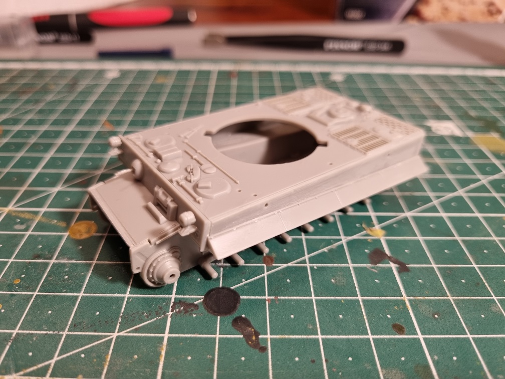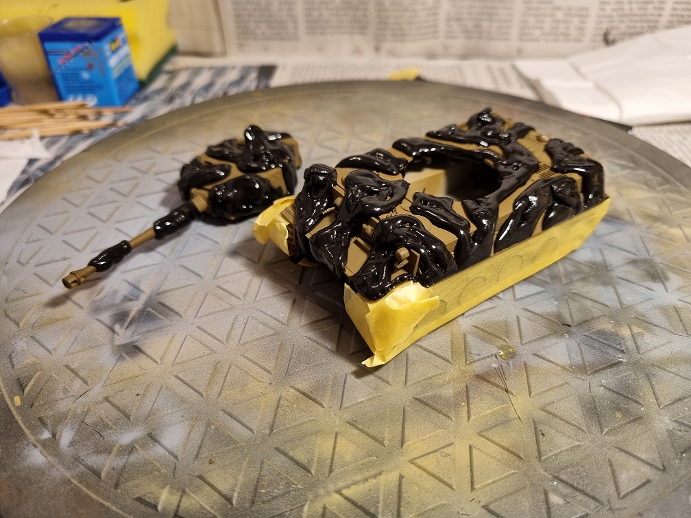 Die Antriebs-/Laufräder und die Umlenkrollen werden erst nach dem Lackieren in der Grundfarbe angebracht. Ebenso wie die Ketten, welche vorher natürlich erstmal lackiert werden. Die vorderen und hinteren Abdeckplatten der Ketten werden montiert, sobald die Ketten fertig sind. Das gibt mir etwas mehr Spielraum zur Montage der Ketten.