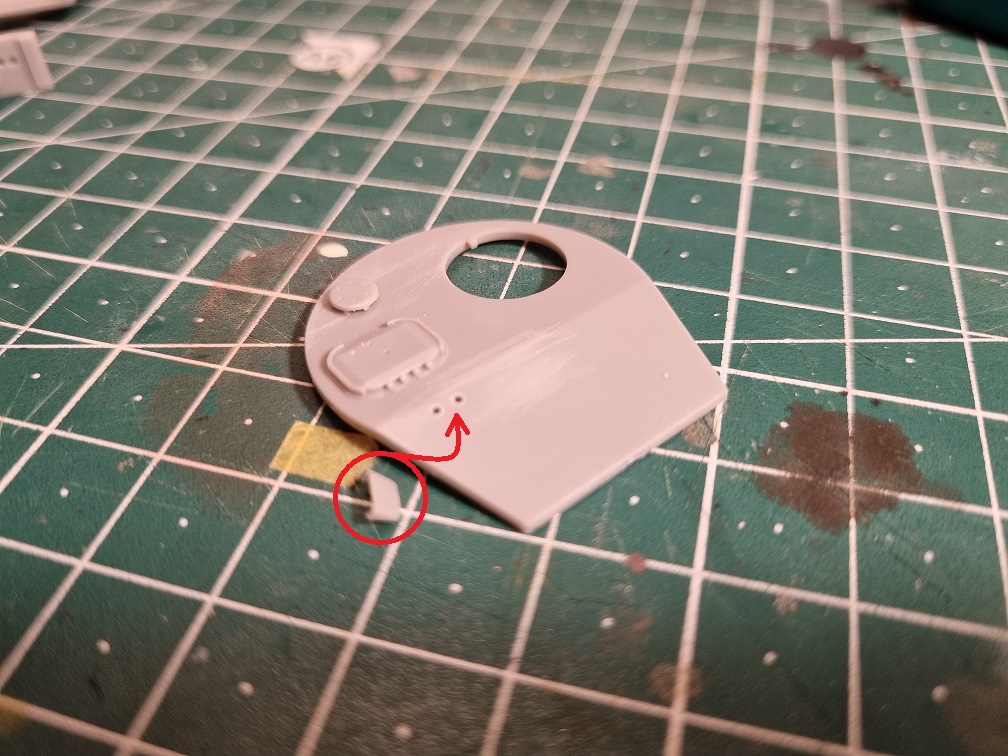 um auf das Dach des Turms noch eine (wie ich denke) Lüstungsöffung und ein weiteres Teil (eine Art Periskop schätze ich) zu montieren, war wieder der Handbohrer nötig: