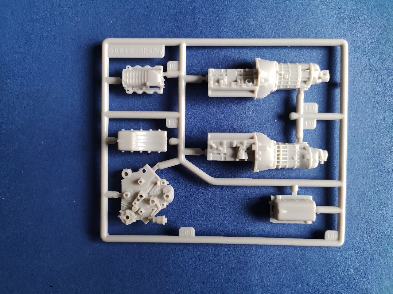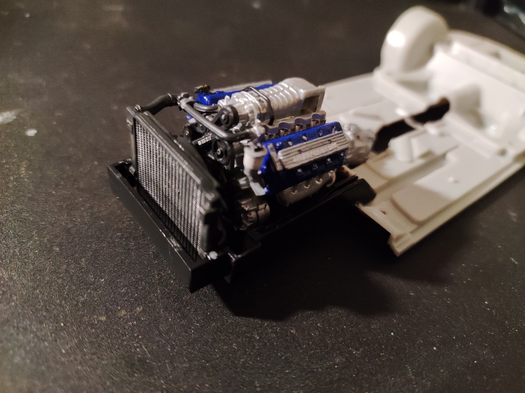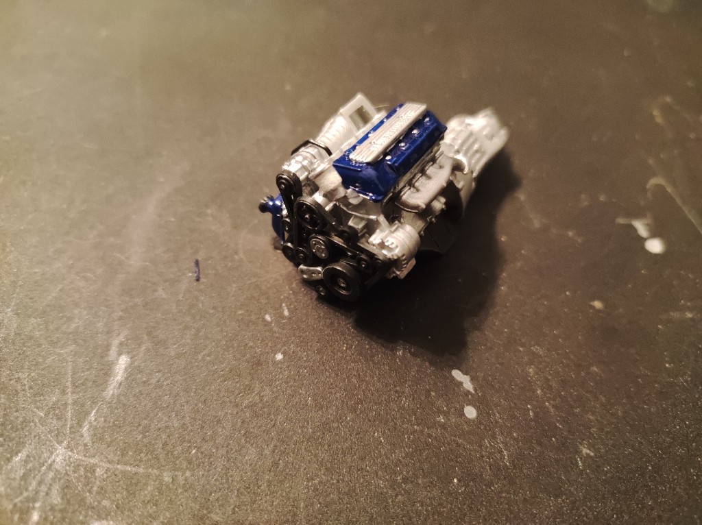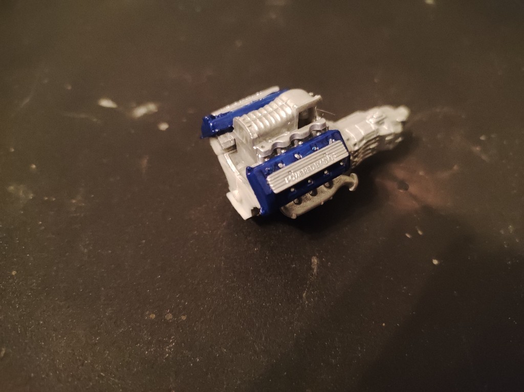 Ganz klassisch habe ich den Motorblock und Getriebe einfach erstmal zusammengesetzt, der kleine Kasten ist vermutlich der Kompressor, der insbesondere beim Shelby vorhanden ist.