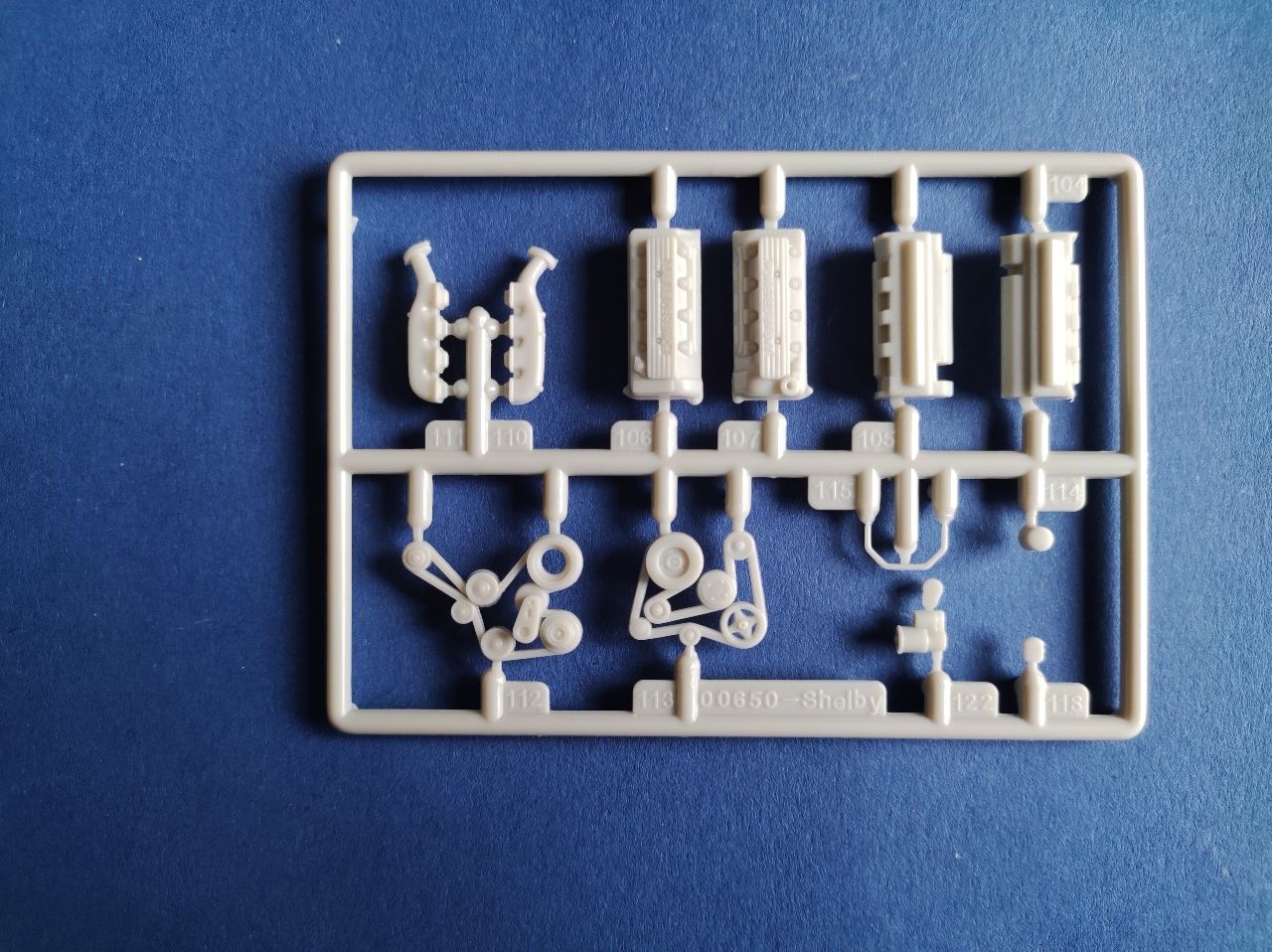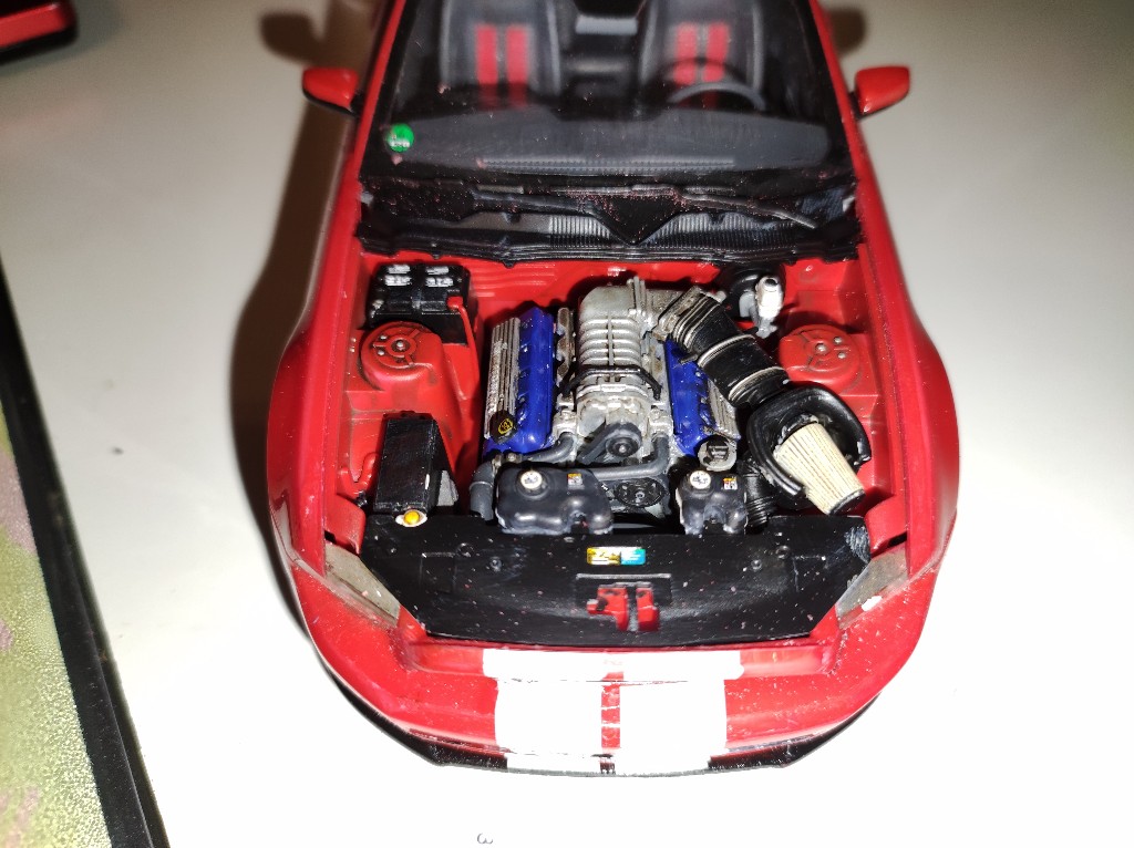 Der Motorraum der hier schon angegossen ist, ist echt gut gelungen, schaut man sich den Motor des Shelbys an, findet man alles wieder. Leider sind in der Anleitung keine Decals für die Batterie vorgesehen, obwohl hier sicher etwas benötigt wird.