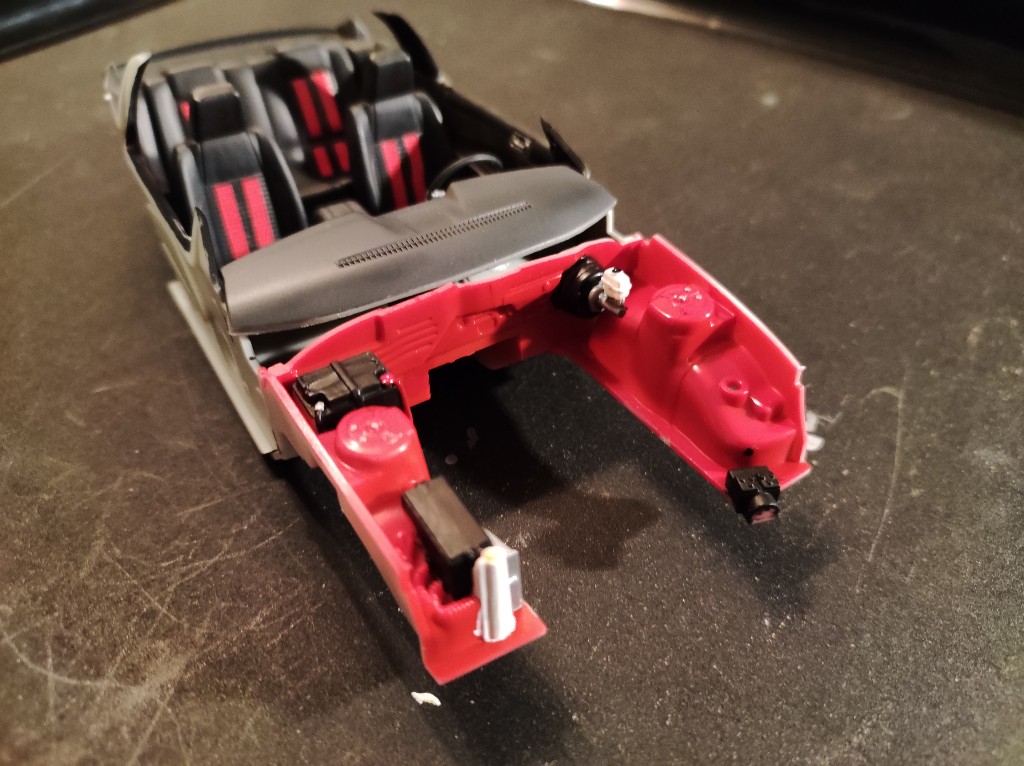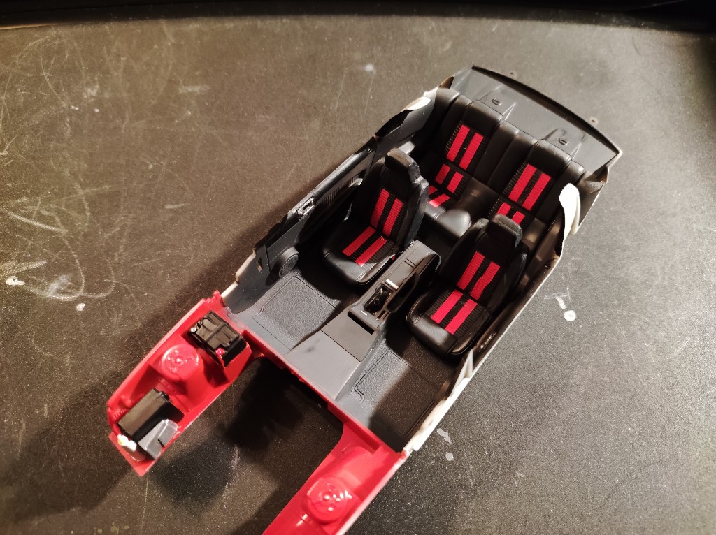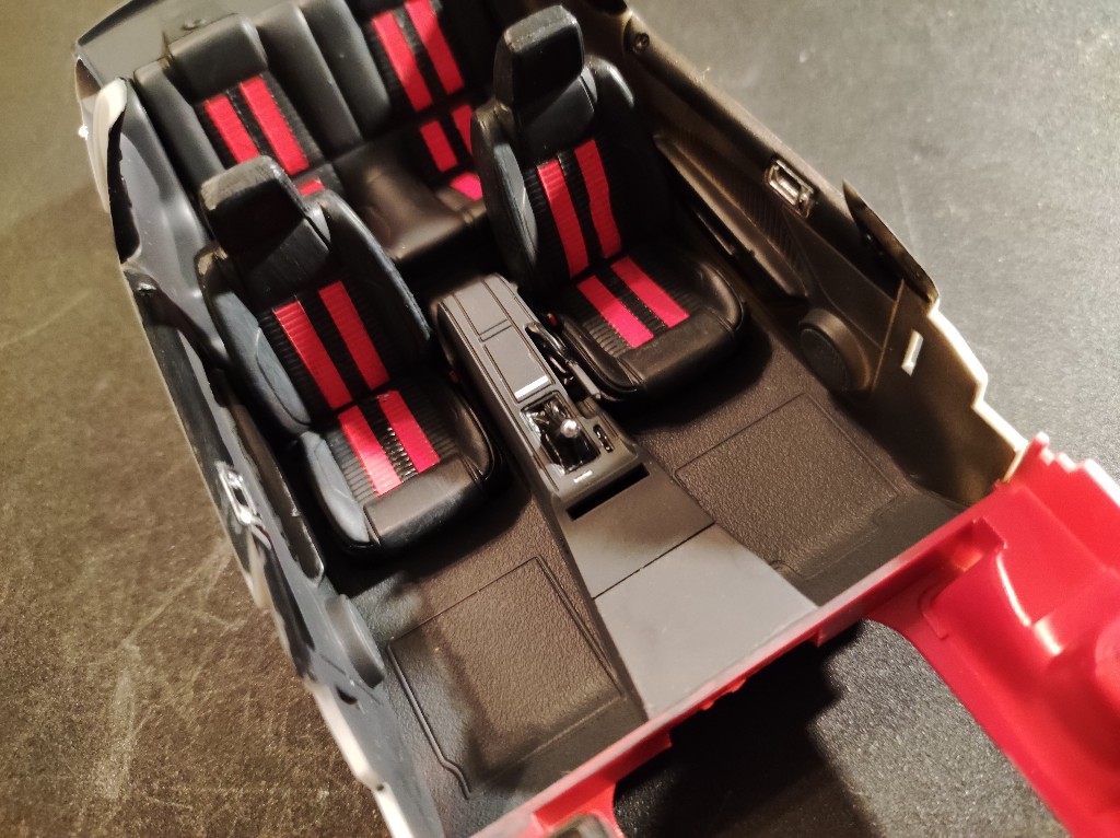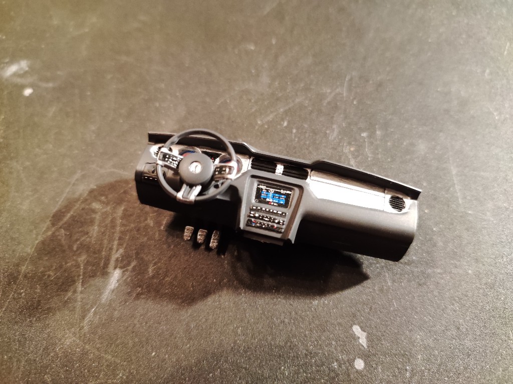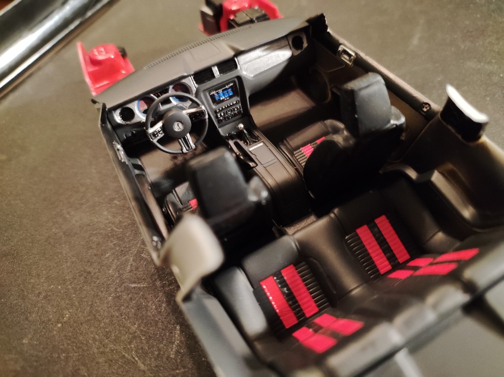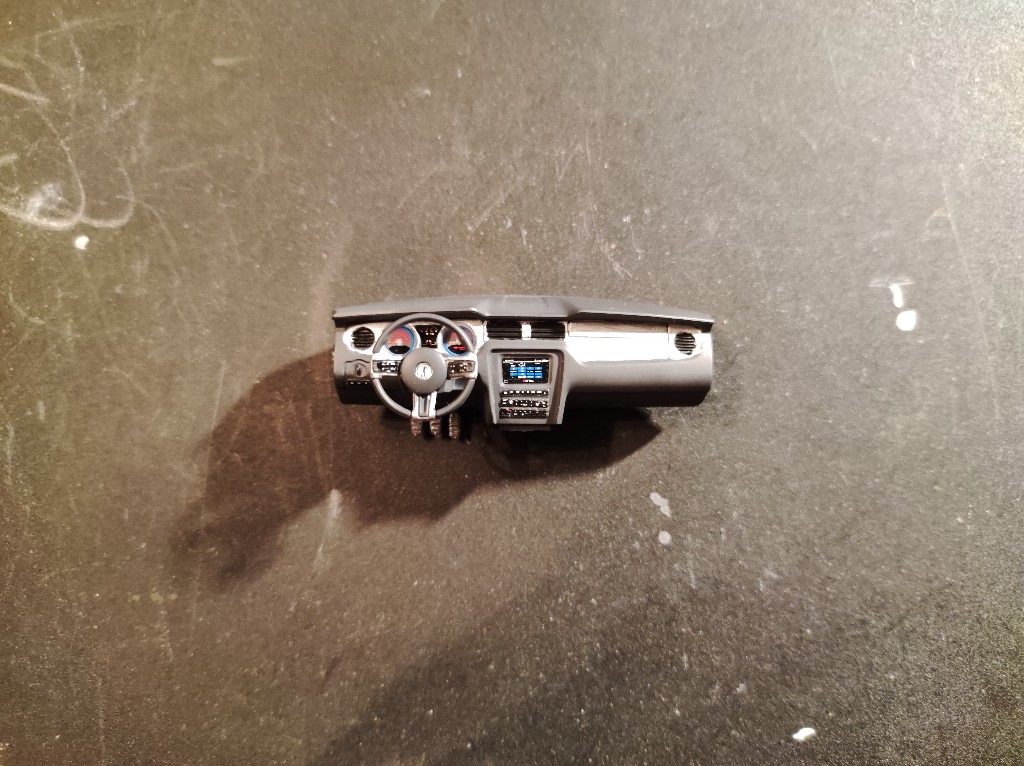 Armaturenbrett ist nun auch weitestgehend verbaut. Ein echt Spitzen Teil, Modern und Sportlich, passt zum Shelby. Was mich an Automodellen oft stört ist einfach, dass man bei fast jeden Schritt wieder mit Decals und bemalen weiter machen muss, richtiger Baufluss kommt so nur schwer Zustande.