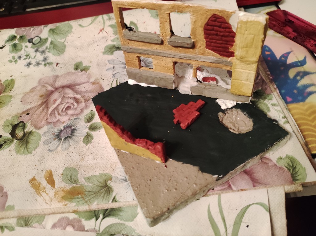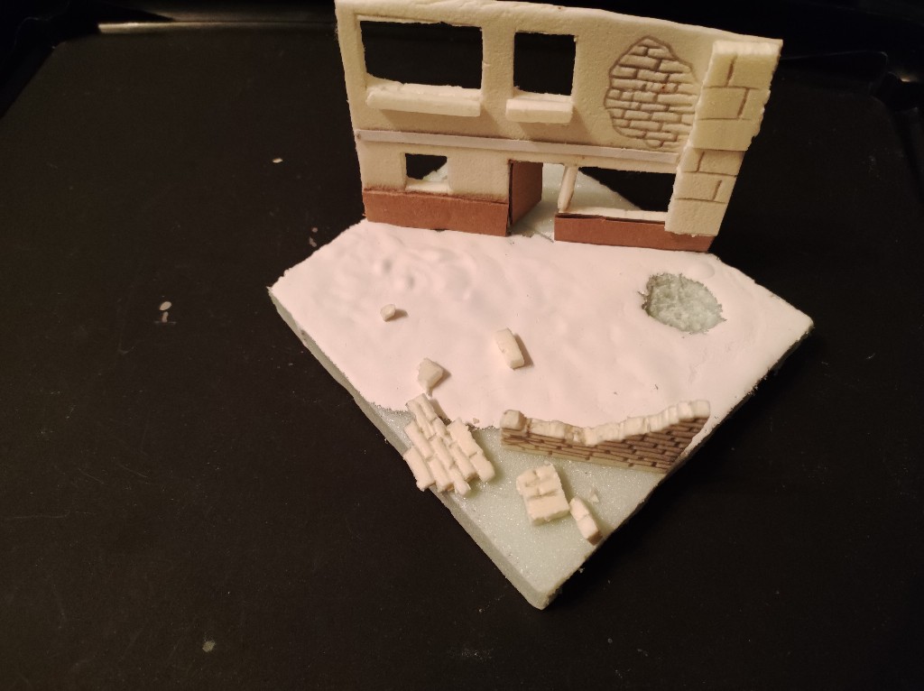 Ich hab's erstmal mit Blitz versucht. Es kam noch etwas Schutt mithilfe von Pigmenten hinzu, auch mit Wash würde das Ausgebrannte Haus noch dargestellt. Pigmente müssen noch Fixiert werden, wie ich das genau mache, weiß ich leider noch nicht.vielleivht hat jemand von euch eine Idee.