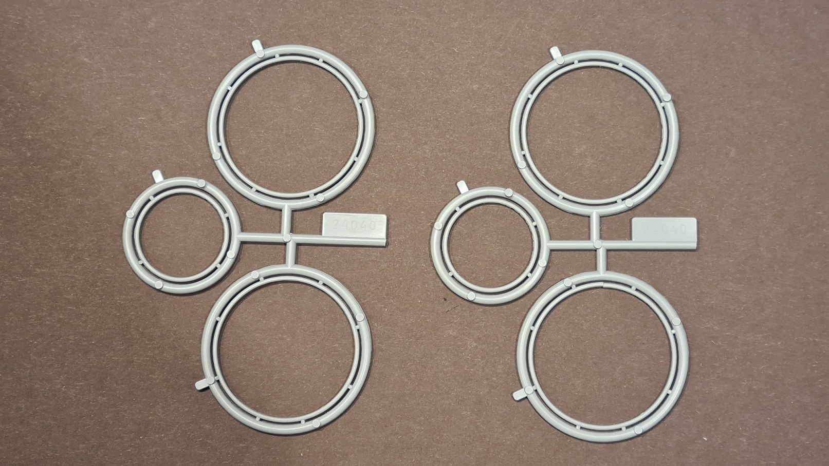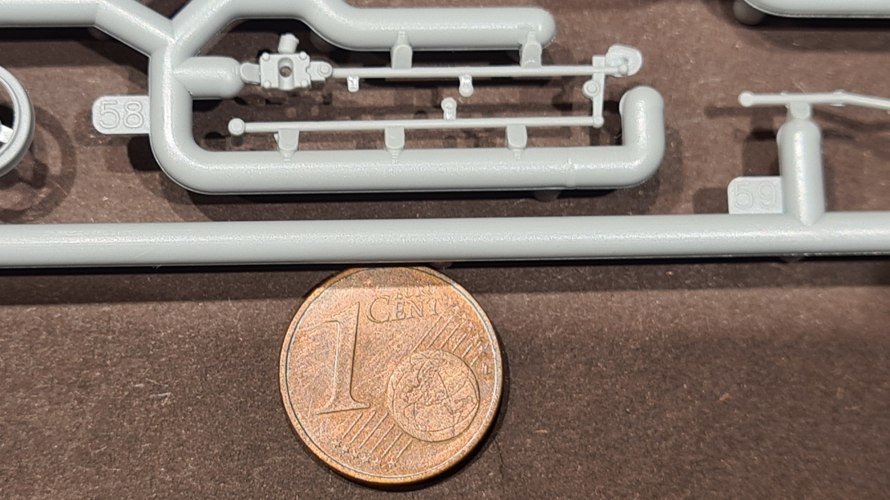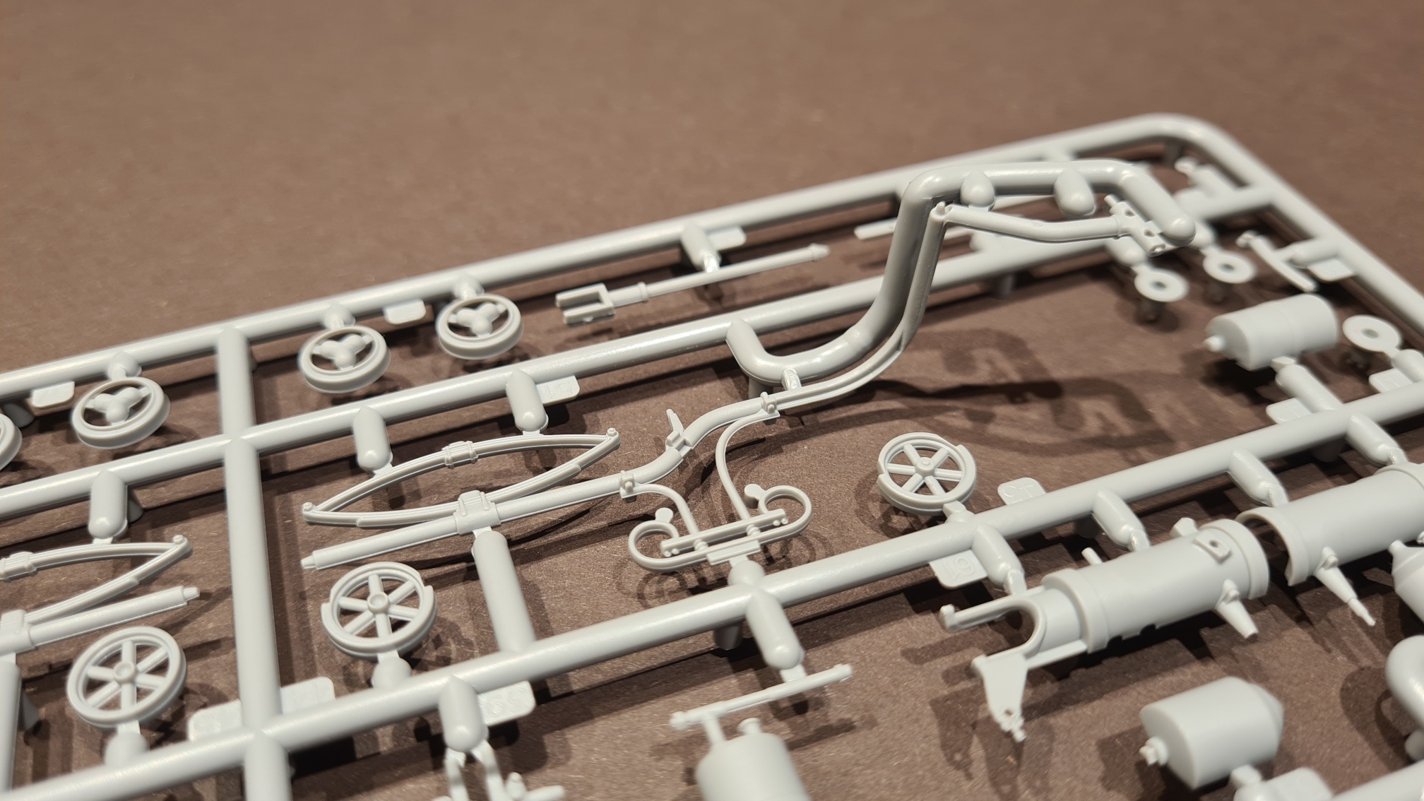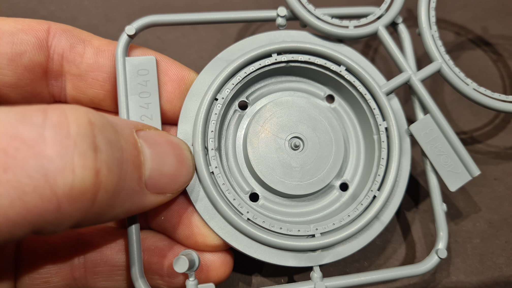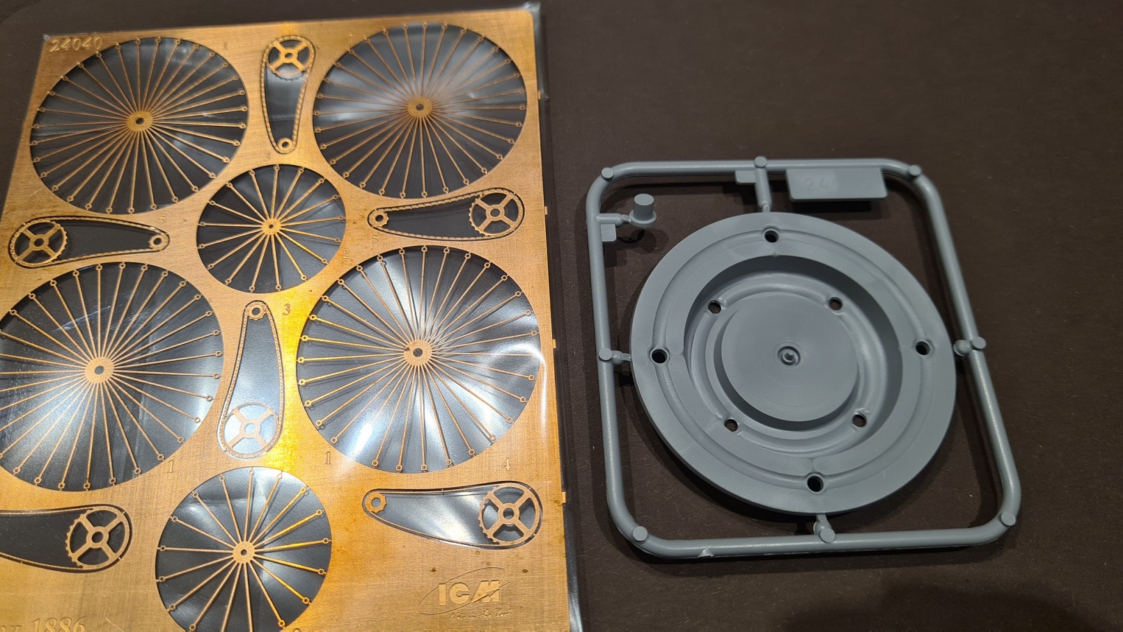Auf dem letzten Bild ist ein großes Spritzteil enthalten, welches nicht verbaut wird, sondern als Biegehilfe für die Speichen dient. Noch im Spritzgussrahmen werden die Radkränze in die Form eingesetzt, darauf kommen dann die Speichen, dann wird gebogen, ...