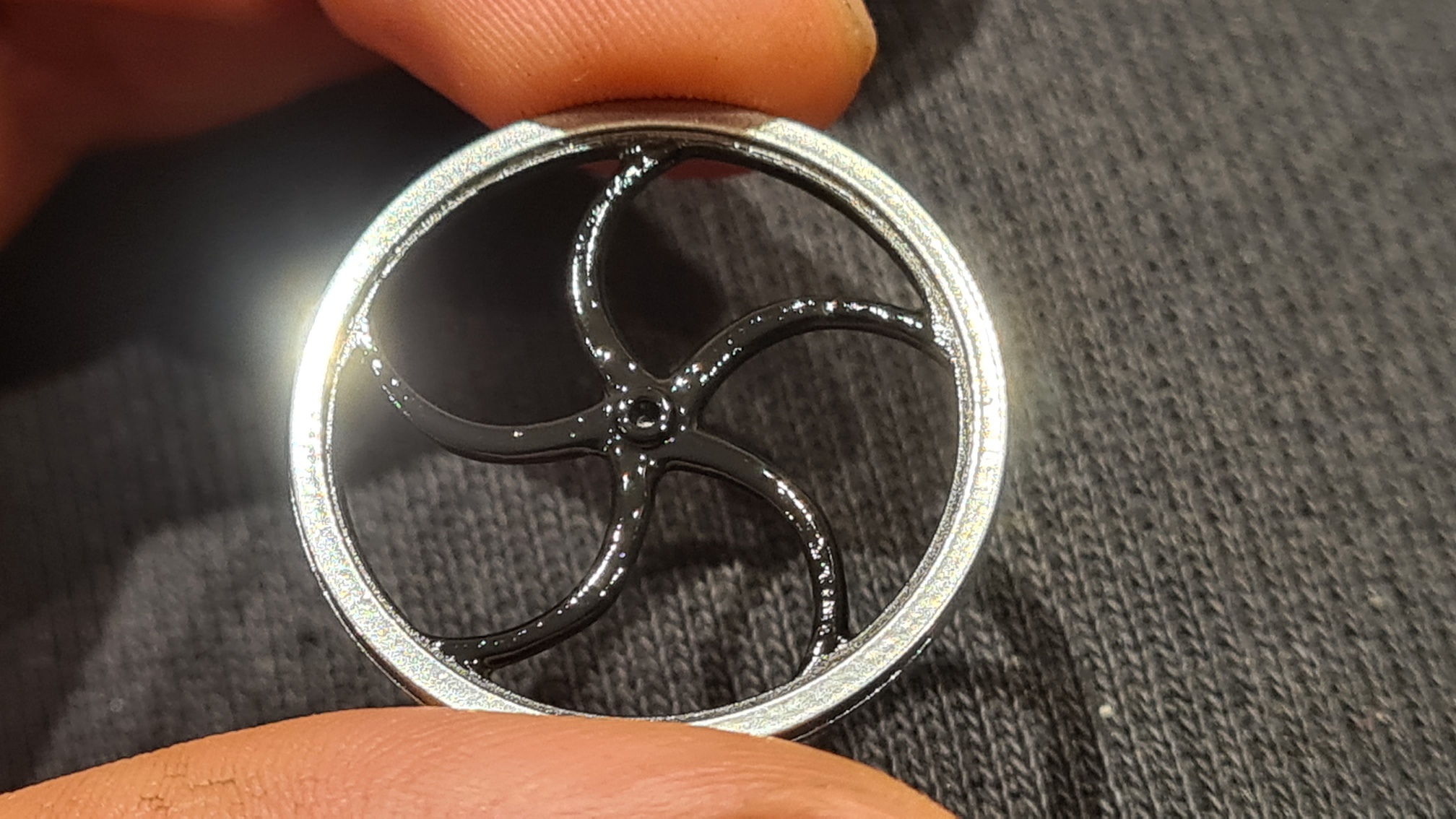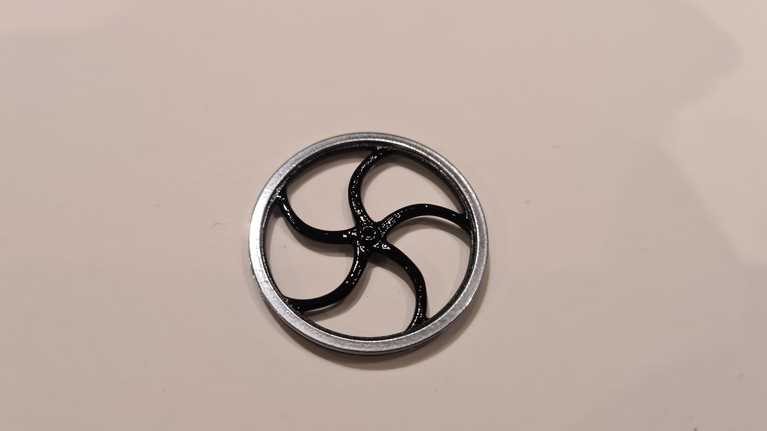 Antworte ich mir mal eben selbst. Ich hab den Glanz weggenommen. Kurzer Blick in Wikipedia sagte, dass der Edelstahlt erst etwa 1912 erfunden wurde, das Rad also überhaupt nicht aus Edelstahl sein kann. Falsche Farbe. Zu viel Glanz. Lack in der Form gab es auch noch nicht.