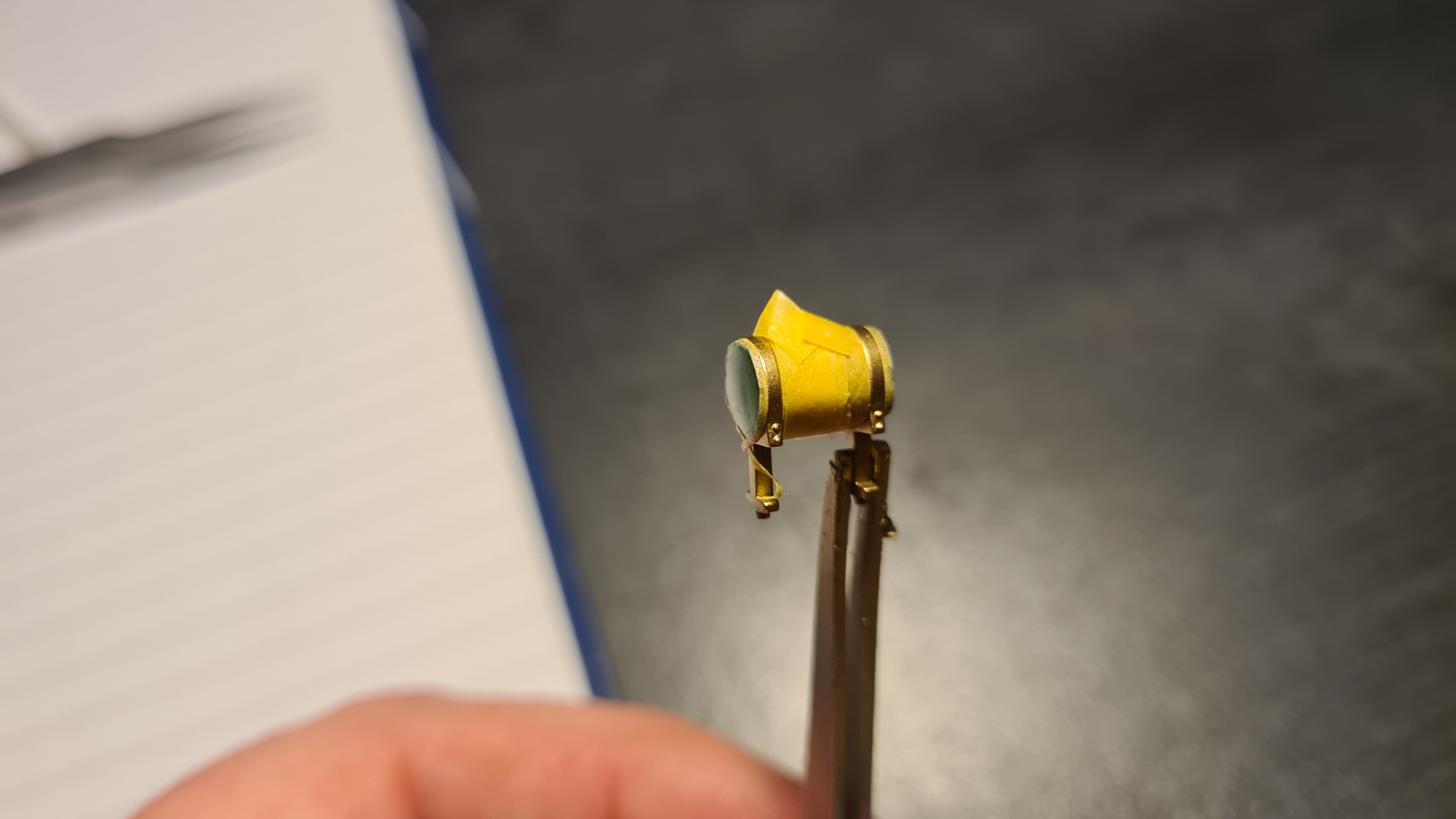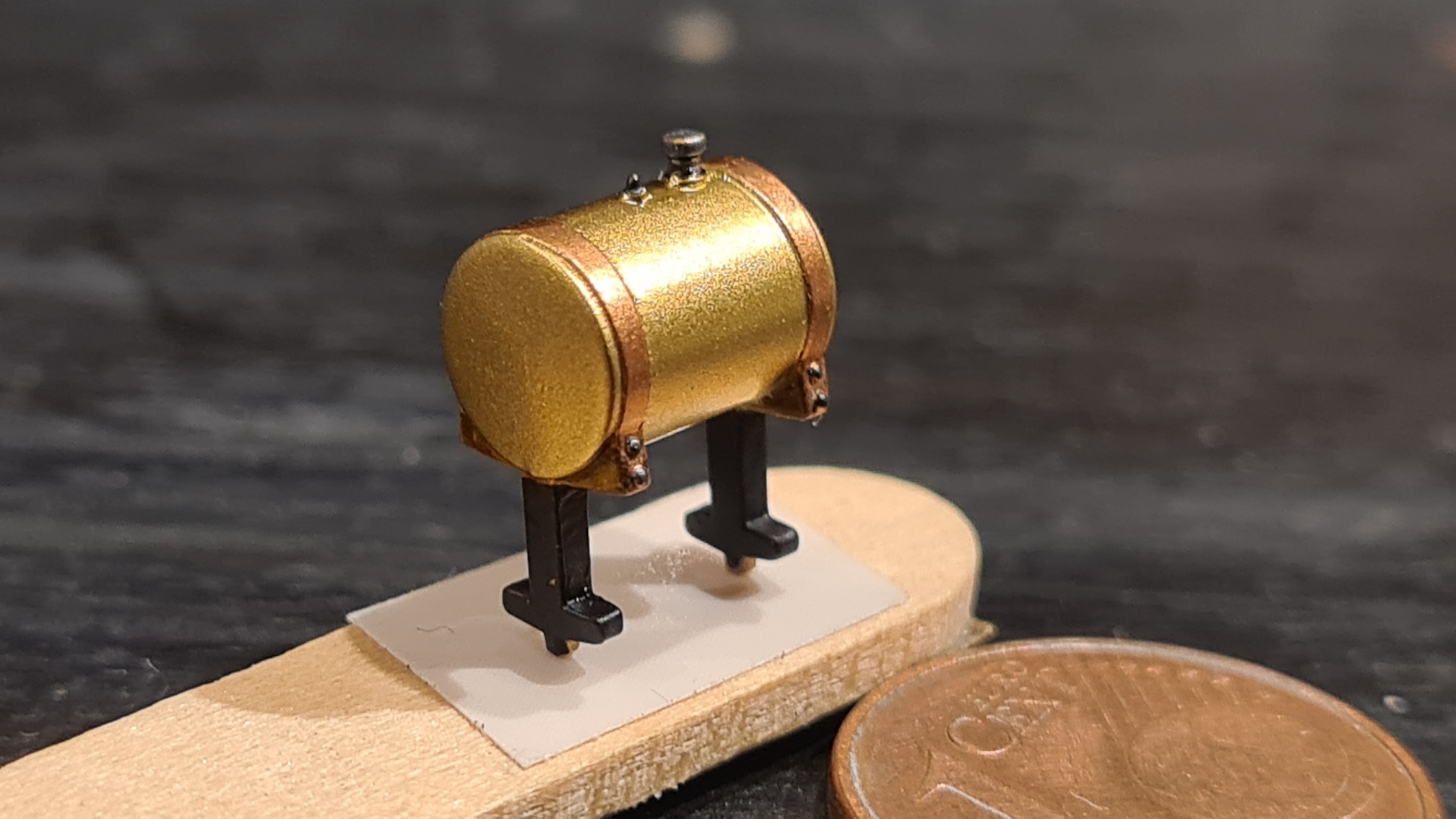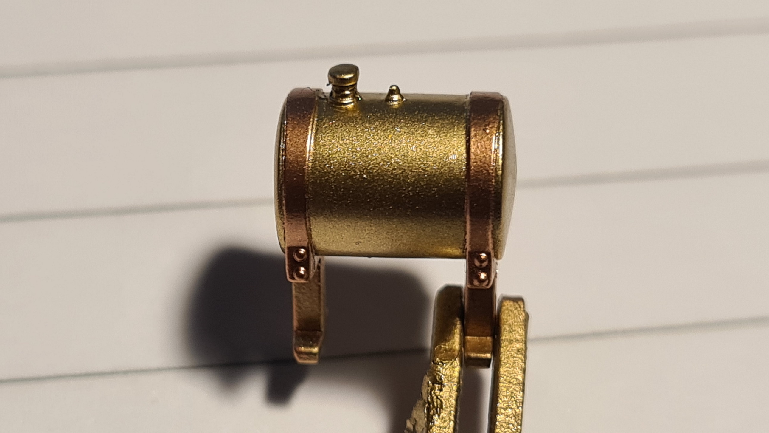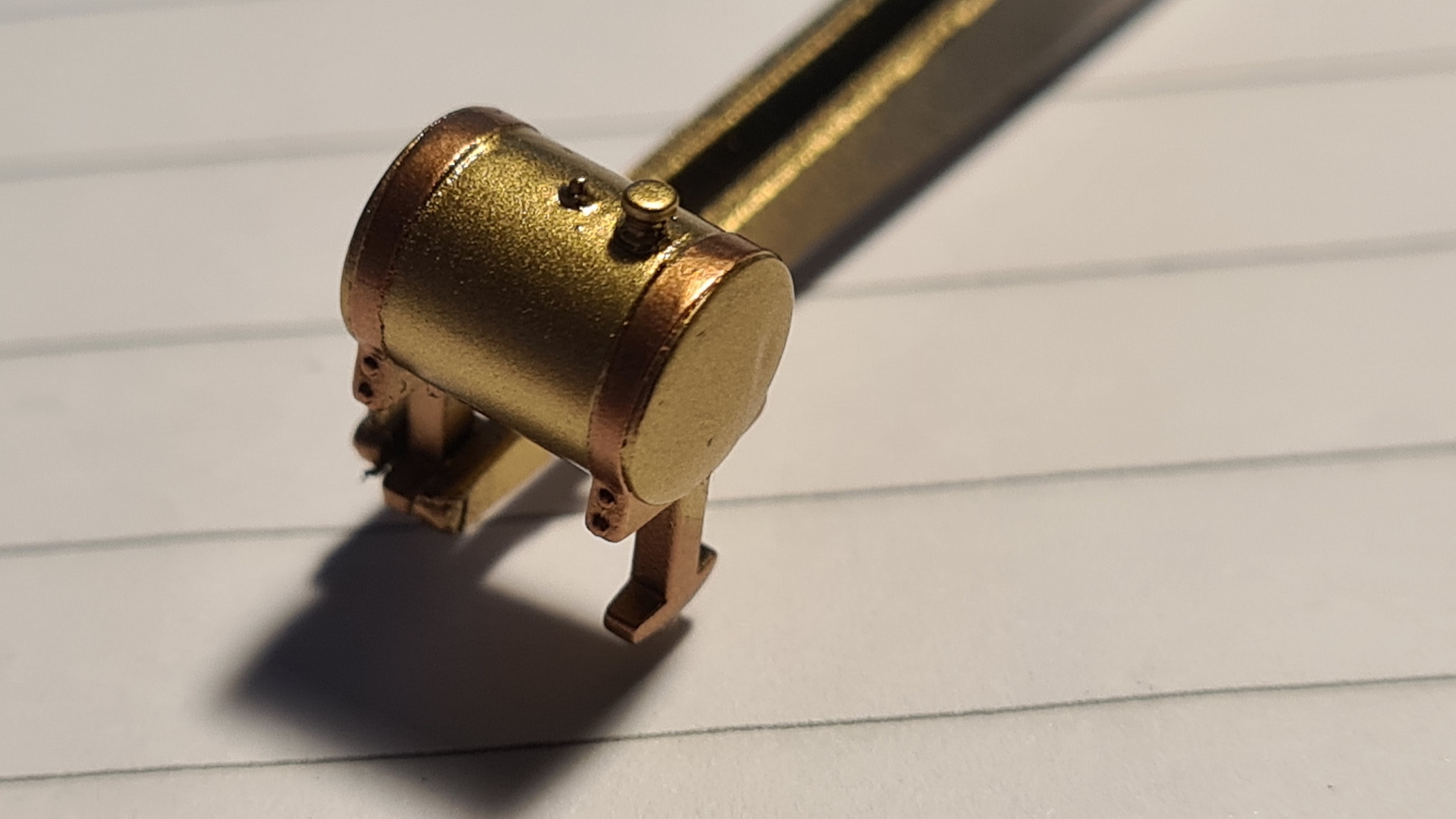 Der soll aus glänzendem Messing sein. Halterung aus Kupferblechen, gelagert auf Holzstücken, befestigt am Fahrzeugrahmen mit Metall. Der Bausatz hat hier einfach 2 Hälften geliefert, der Rest ist Fummelei.