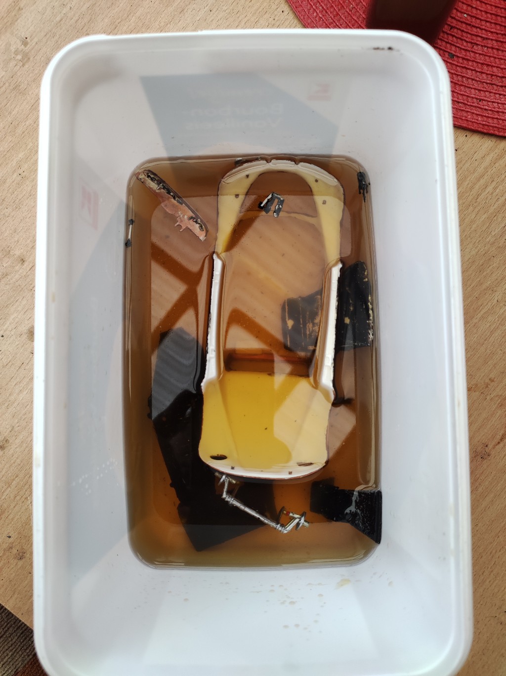 Die Farbe müsste (bzw muss noch) nun runter. Der Revell Paint Remover hat hier schon Mal versagt und man hatte eigentlich nichts runter bekommen. Zweiter Versuch, ein Bad im Bremsflüssigkeit. Wie zu sehen geht die schwarze Farbe schon gut ab. Das Bronze ist leider weiterhin sehr Hartnäckig und macht keine Anstalten sich zu lösen. Sollte ich vielleicht versuchen den Lack anzuschleifen? Insgesamt baded das Zeug schon fast zwei Tage in der Suppe.