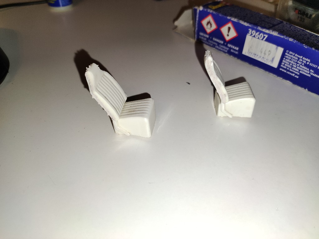 Ich hab heute fest gestellt dass leider auch Teile vom Motor fehlen... Wäre auch zu schön wenn es einfach laufen würde... Dann habe ich mich halt um die Sitze gekümmert. Hier sieht man die Qualität des Modells... Der Zahn der Zeit hat sehr daran genakt, die Sitze passen nur schlecht und müssen gespachtelt werden.