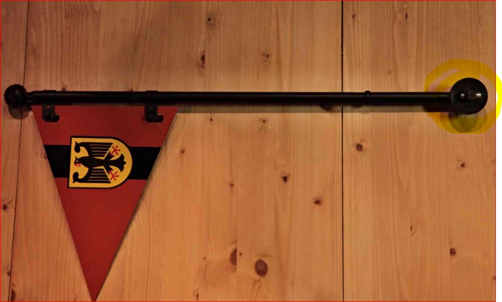 Diese "Standarte" kenne ich auch noch in der Neuzeit. An diese Halterung (eine Art Bajonettverschluss) wird die Flagge des "VIP" gesteckt. Jede Kompanie hatte zum Beispiel einen Stander mit dem KpWappen darauf. Am Chefwolf wurde der Stander aber nur selten gesteckt. Ich kann mich jedoch erinnern, dass der Stander beim Chef auf dem Schreibtisch stand.