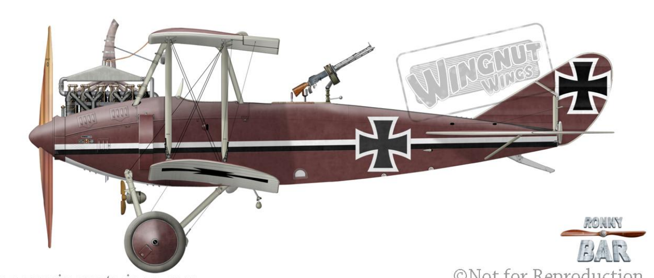 Das gezeigte Flugzeug konnte nicht identifiziert werden. Die Farbe lässt sich damit nicht eindeutig aufklären. Jedenfalls dunkel. Spannend ist, dass es glänzend war. Wingnut Wings schlägt einen "leberfarbene" Lackierung vor, die es einer Quelle zufolge gegeben haben soll. Ich denke, mit den Seitenstreifen wird das ziemlich gut aussehen. Hier der Vorschlag von Wingnut Wings: