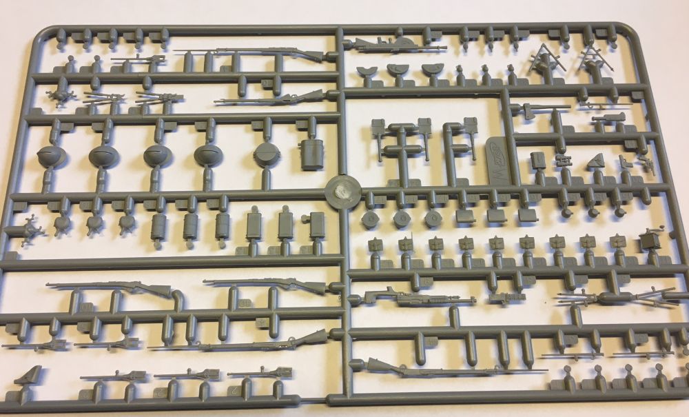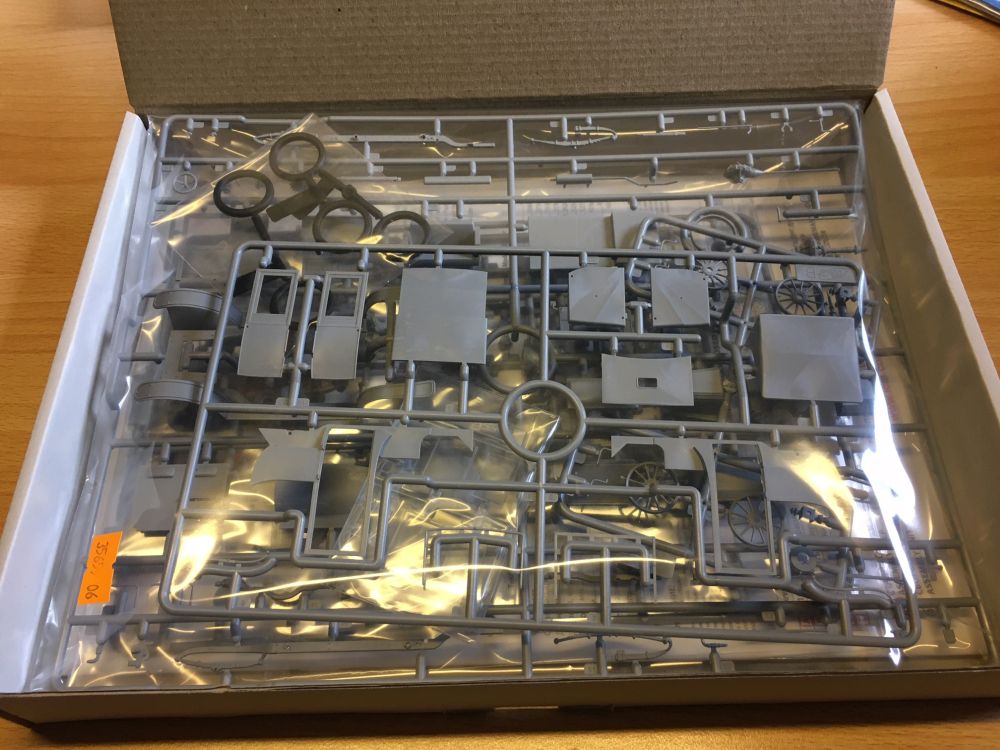Darin befinden sich 4 graue und ein klarer Spritzling. Dazu kommen eine DinA4 Bauanleitung mit 24 übersichtlichen Seiten, 2 DinA4 Blätter zu Figuren und Zubehör, 5 Reifen aus Gummi und ein kleiner Decalbogen.