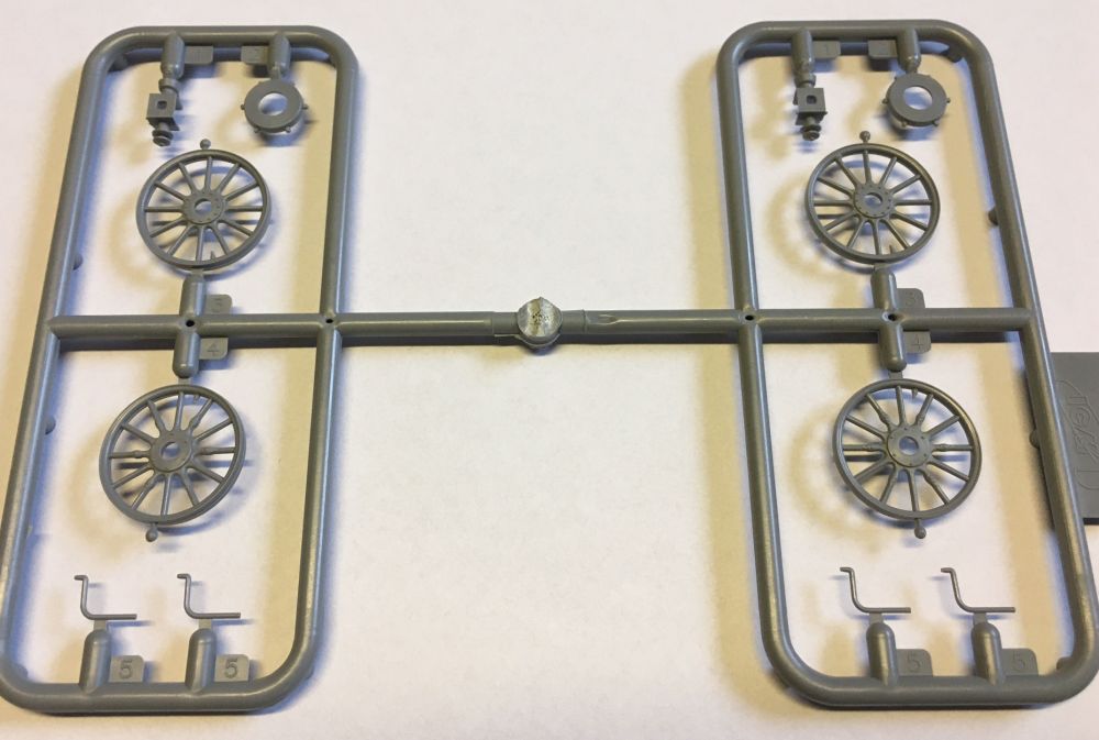 Spitzling A hat u.a. die Teile des Rahmens und des Motörchens. Die Details sind sehr gut. Alles ist sehr sauber gespritzt, fast gradfrei, ohne Fischhäute und sichtbare Auswerfermarken. Letzteres zumindest so weit ich es bisher sehen kann. Die teilweise sehr dünnen und gebogenen Teile bedürfen großer Vorsicht beim Heraustrennen und eines scharfen Cutters.