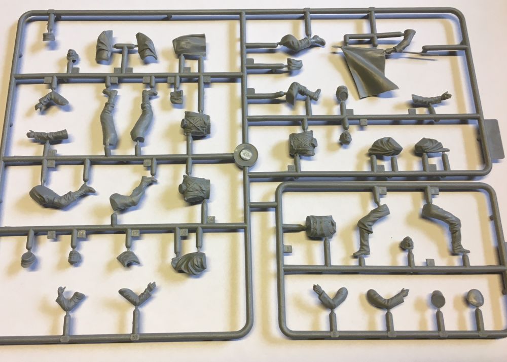 Fehlt noch die Besatzung. Auch hier bieten die Teile viele Details. Besonders gefallen mir die sehr orginellen, zeitgenössigen und bärtigen Gesichter. Da freue ich mich schon auf die Bemalung. Auch die Fahne wirkt schon am Spritzling sehr lebhaft.