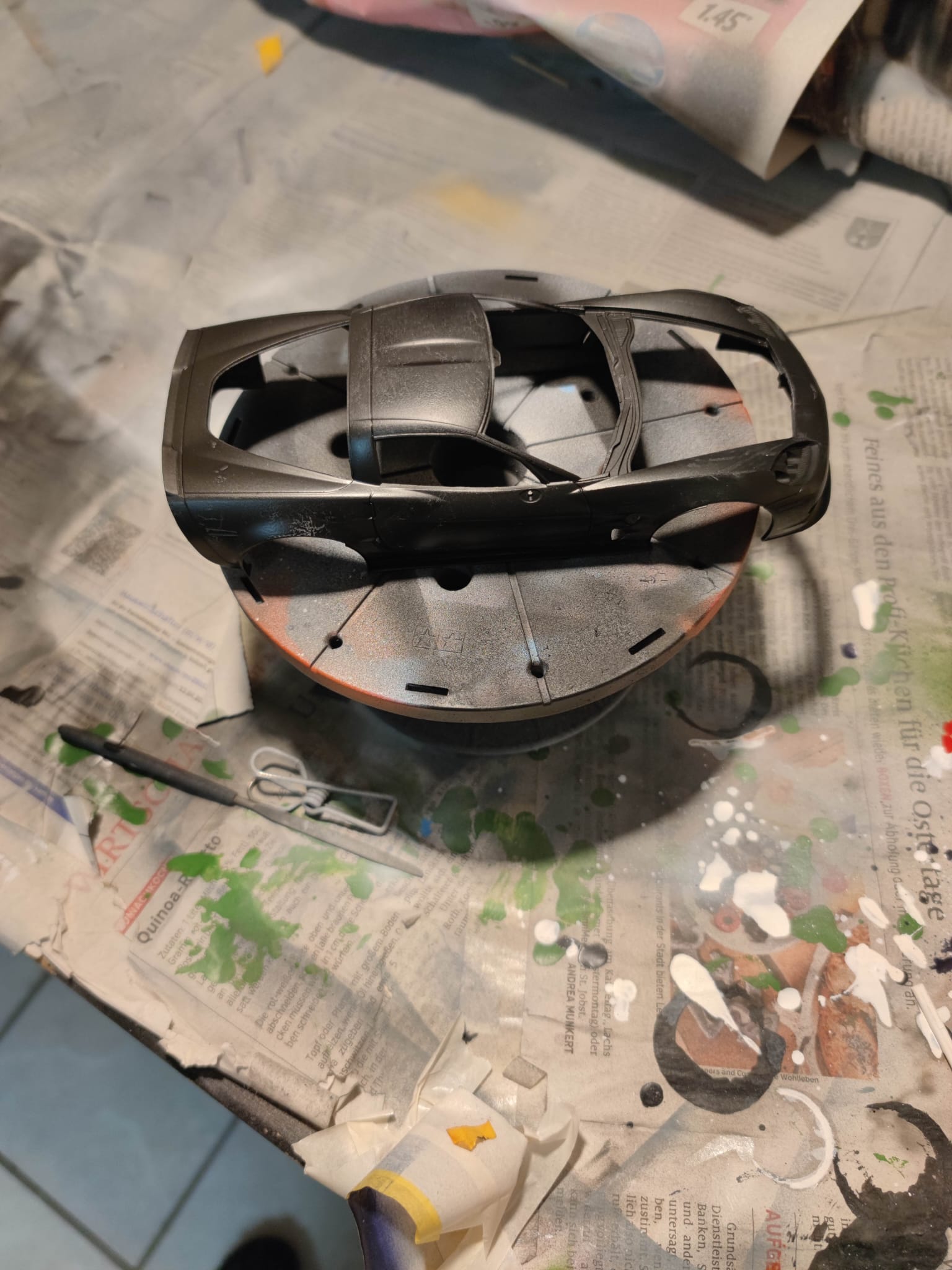 Die Karosserie hat heute seine erste Schicht Lack bekommen und trocknet jetzt. Bilder folgen