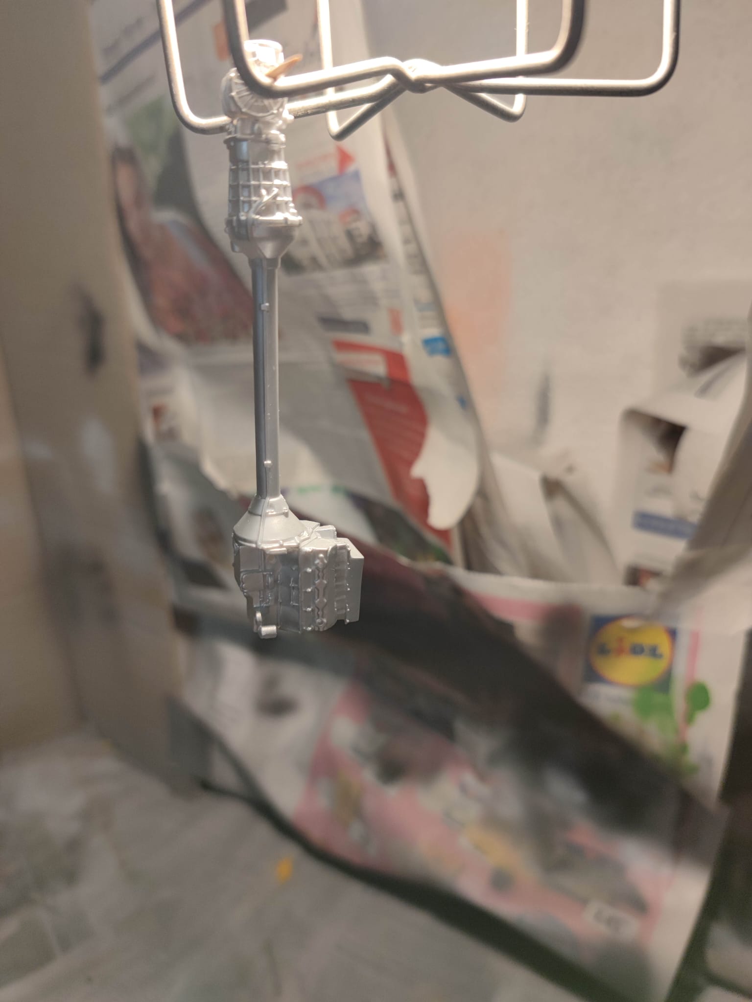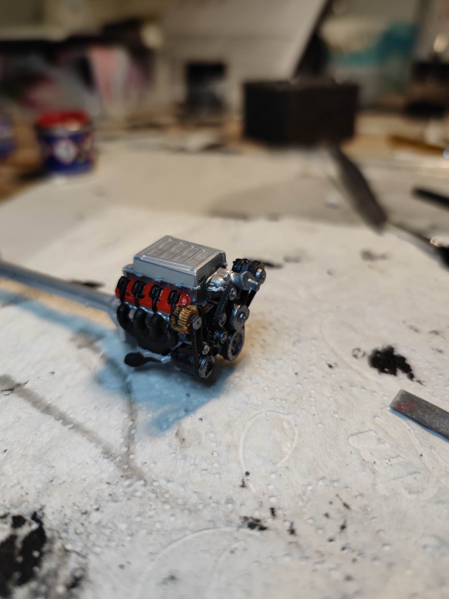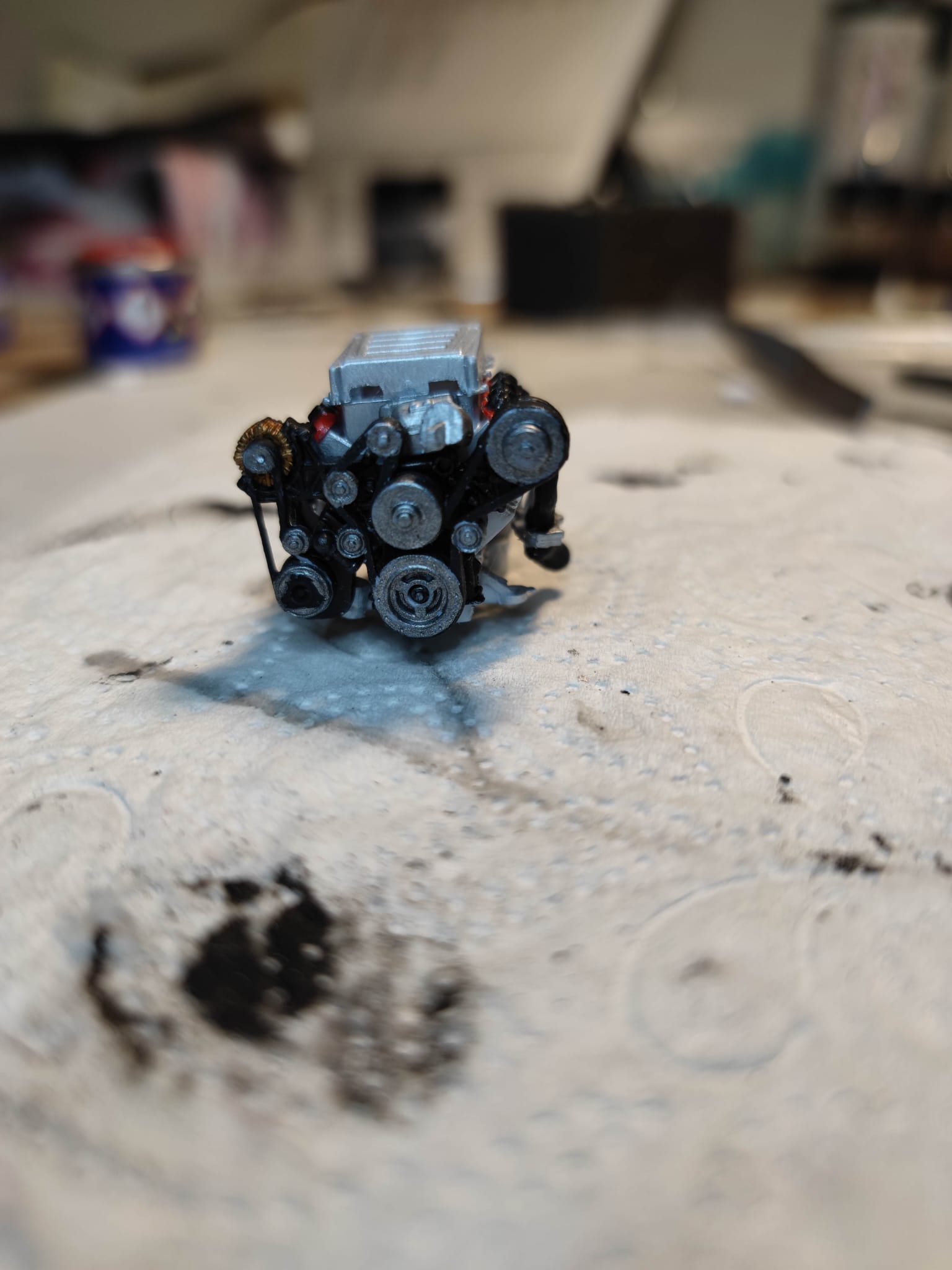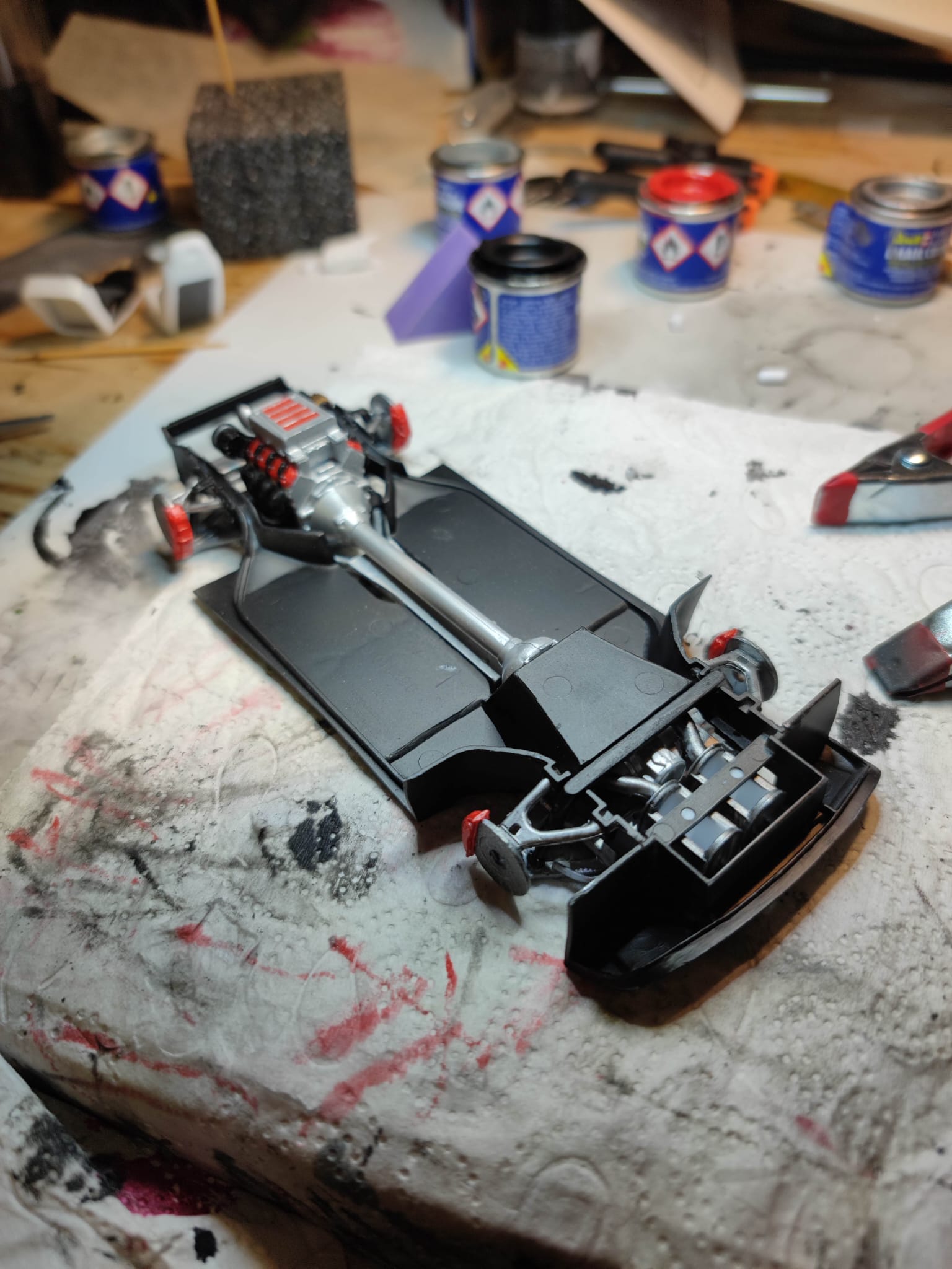 Der Motorblock mit Getriebe sind leider quasi aus einem Stück. Den habe ich mit white aluminium gebrusht. Den Unterboden und die Karosserie habe ich schwarz grundiert. Die anderen Teile habe ich mit dem Pinsel bemalt. Langsam finde ich da echt Spaß daran.