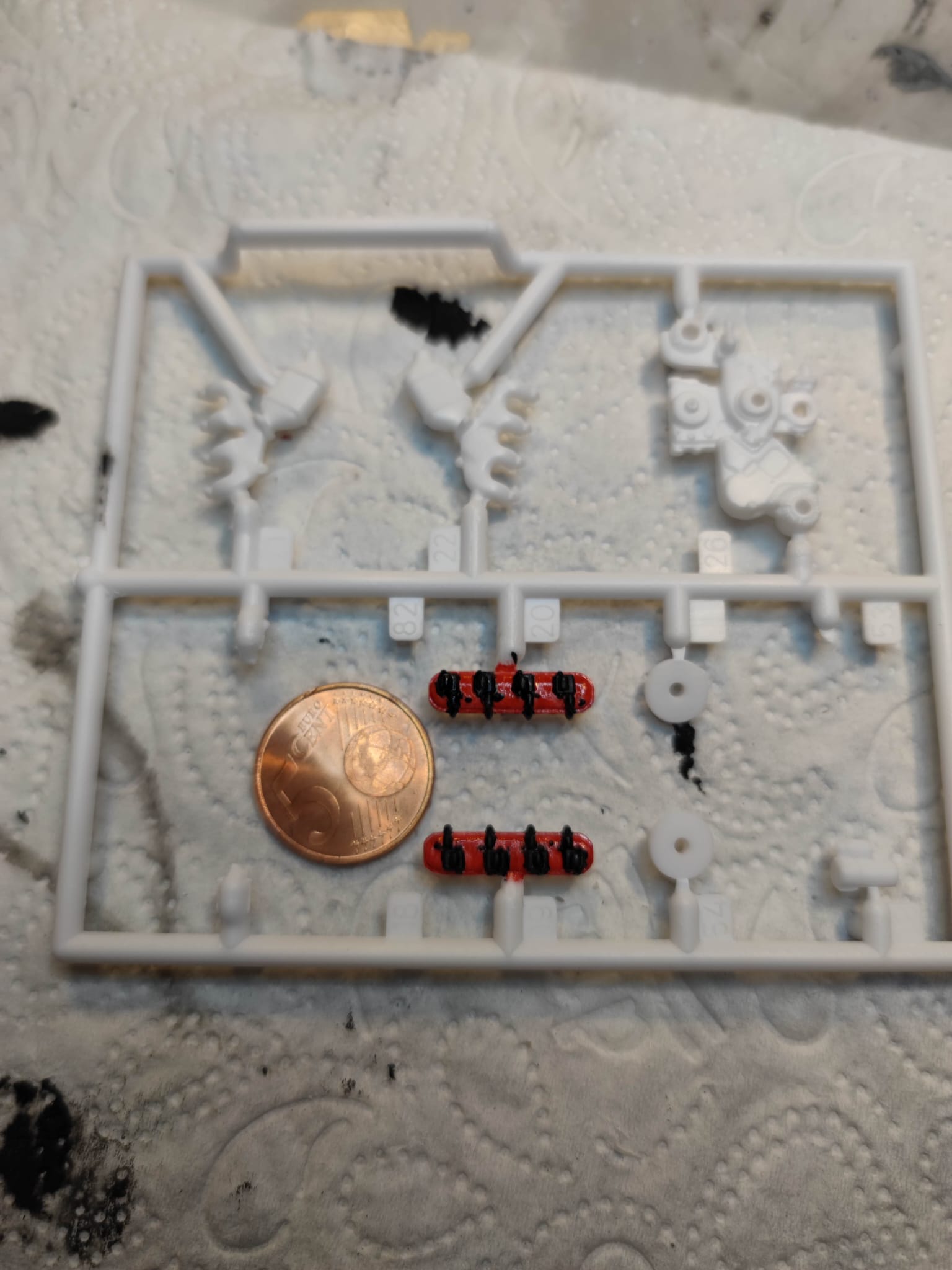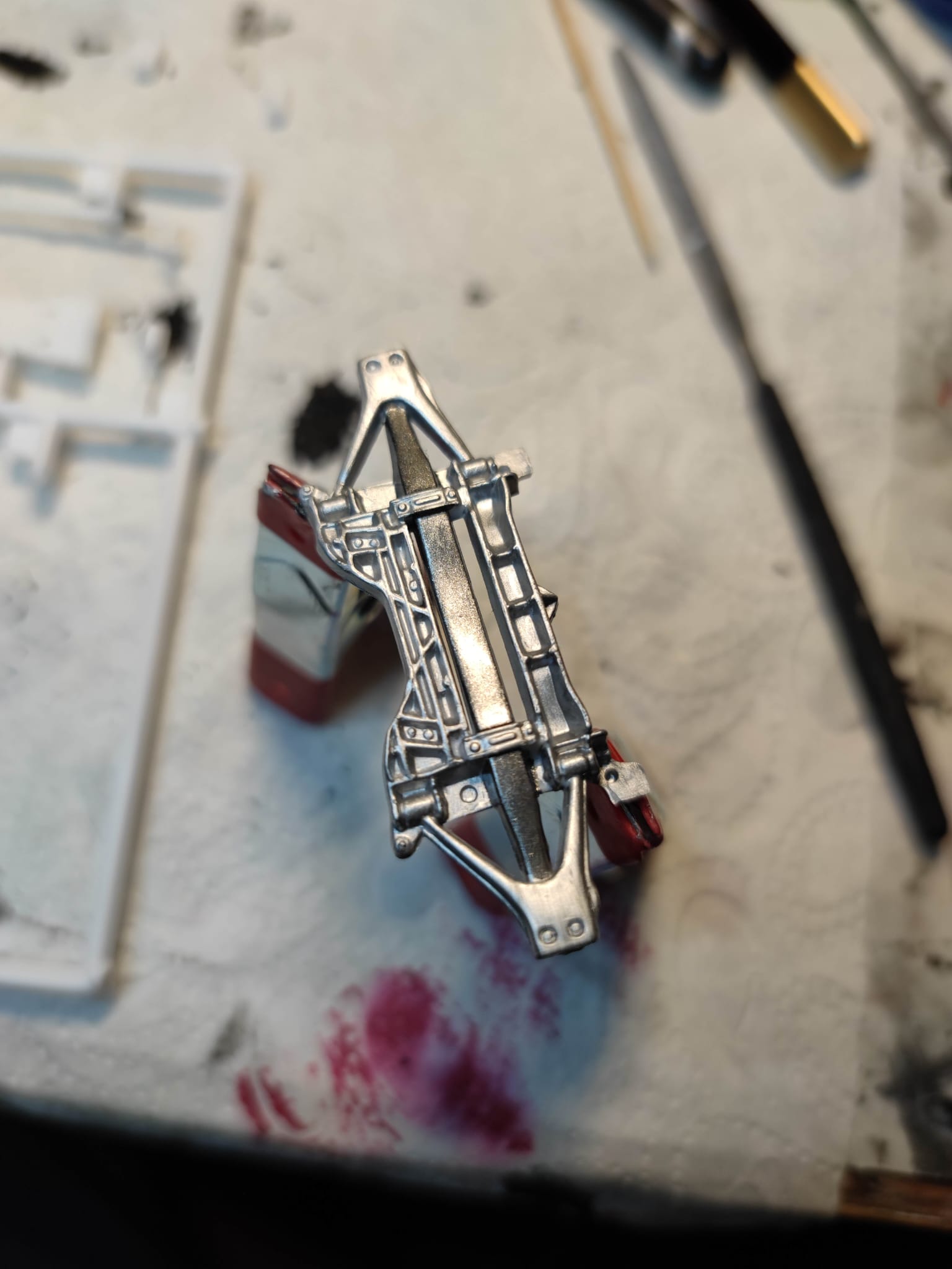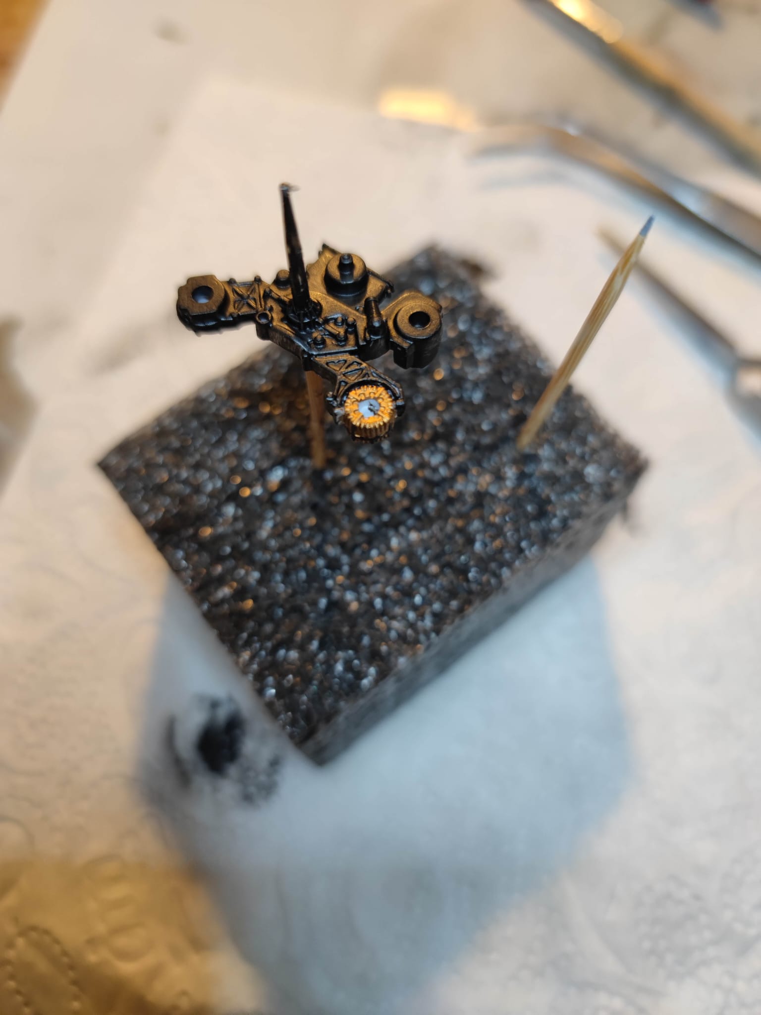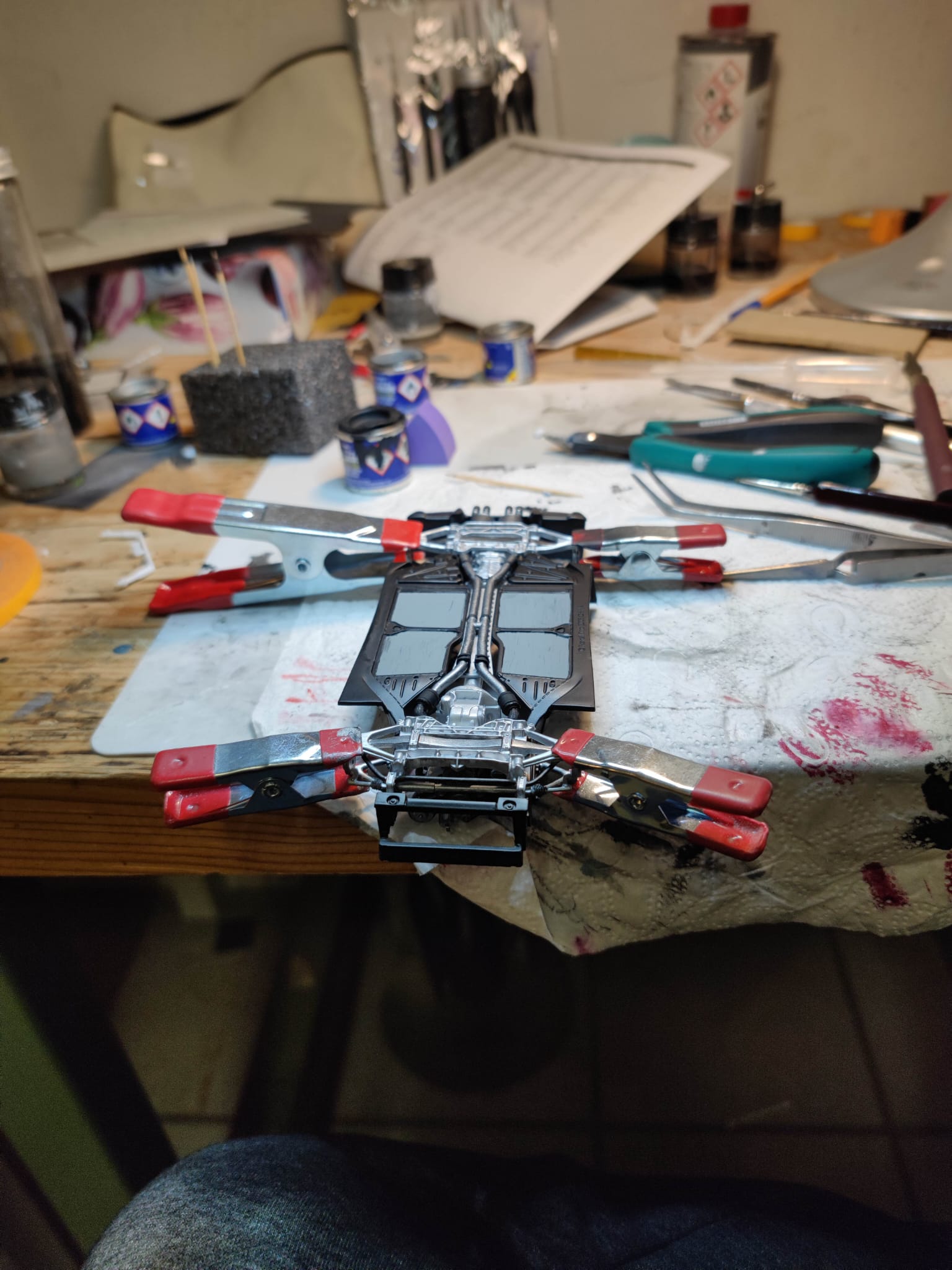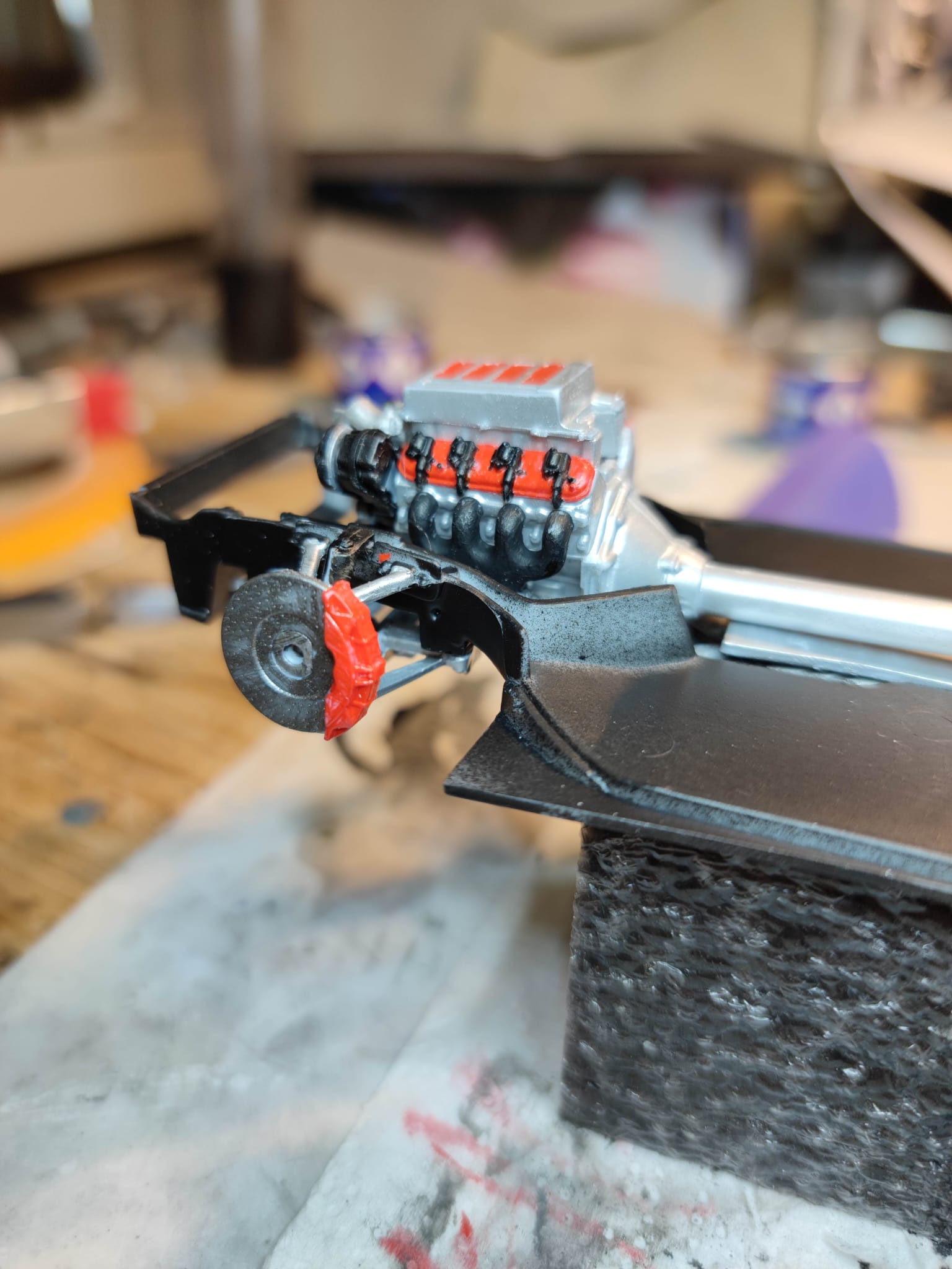 Der Motorblock mit Getriebe sind leider quasi aus einem Stück. Den habe ich mit white aluminium gebrusht. Den Unterboden und die Karosserie habe ich schwarz grundiert. Die anderen Teile habe ich mit dem Pinsel bemalt. Langsam finde ich da echt Spaß daran.