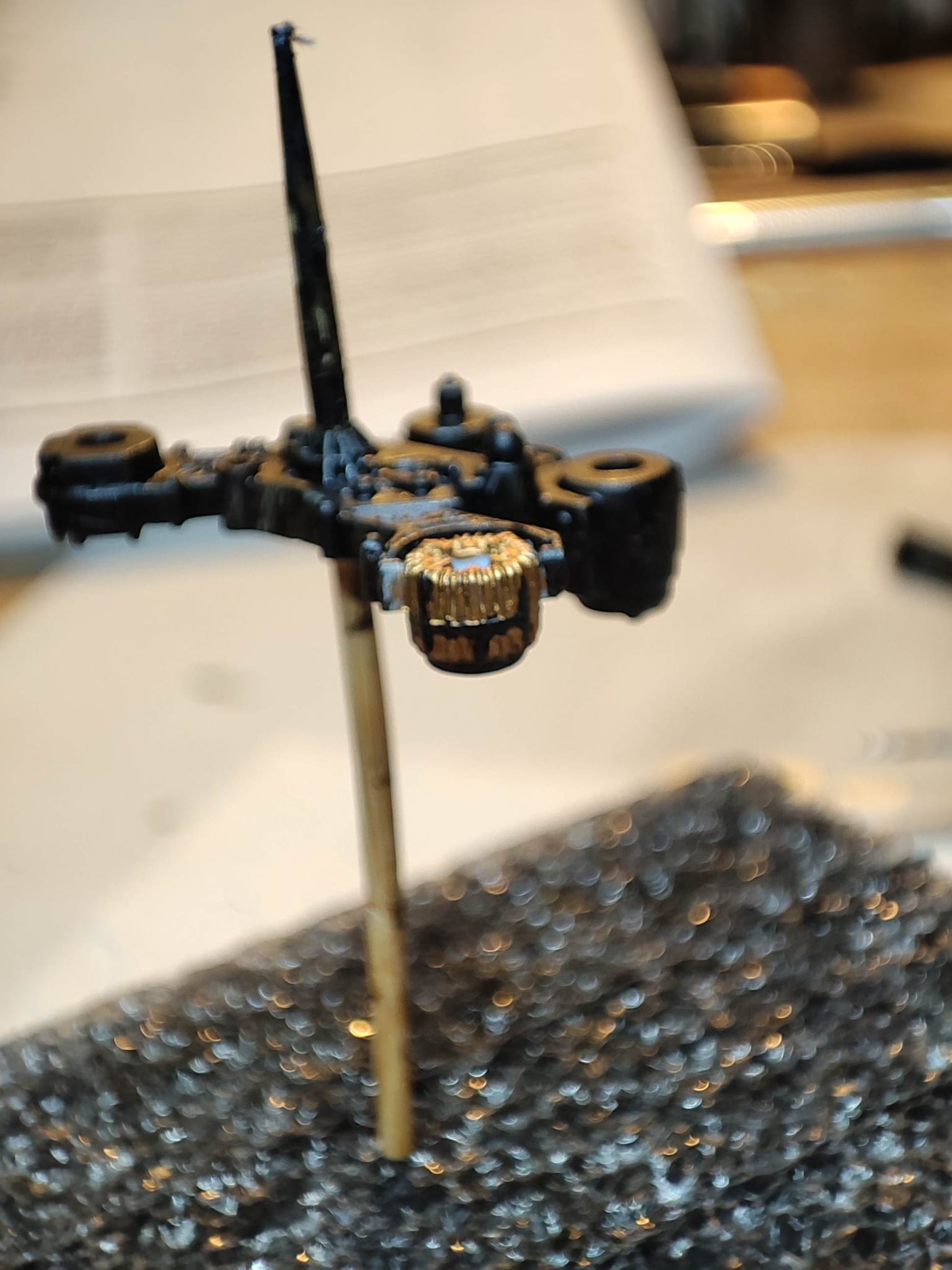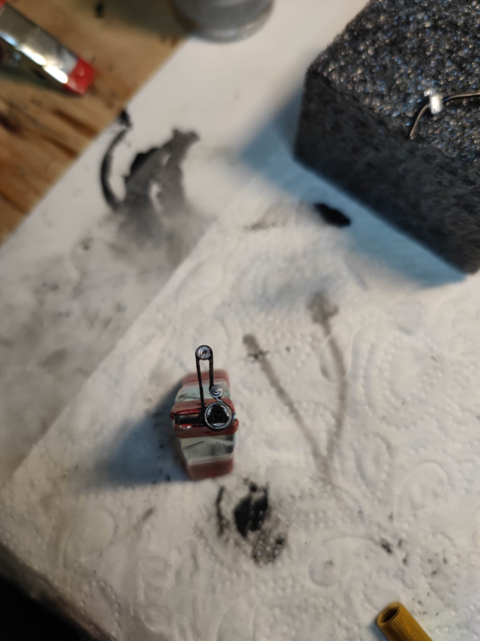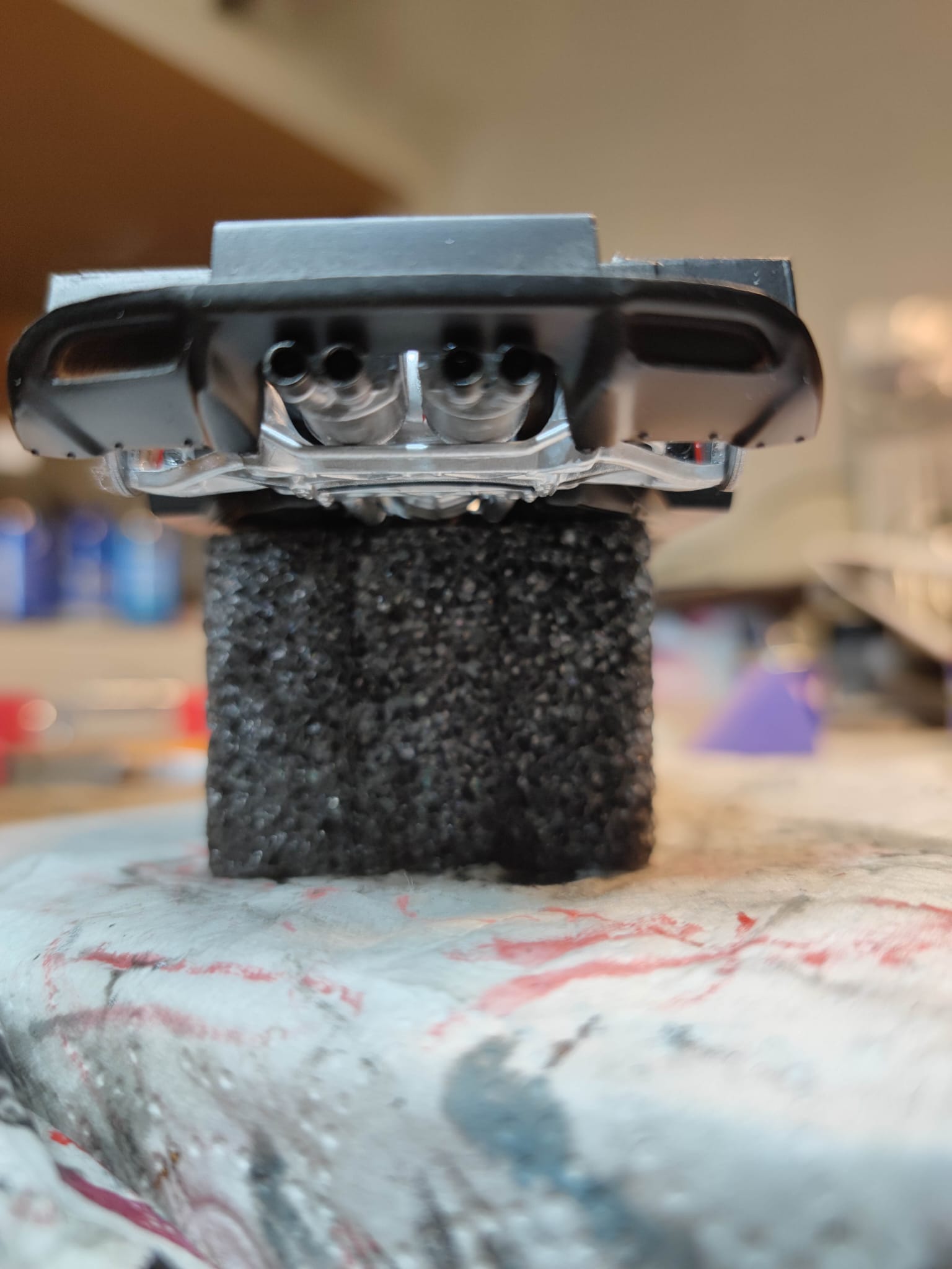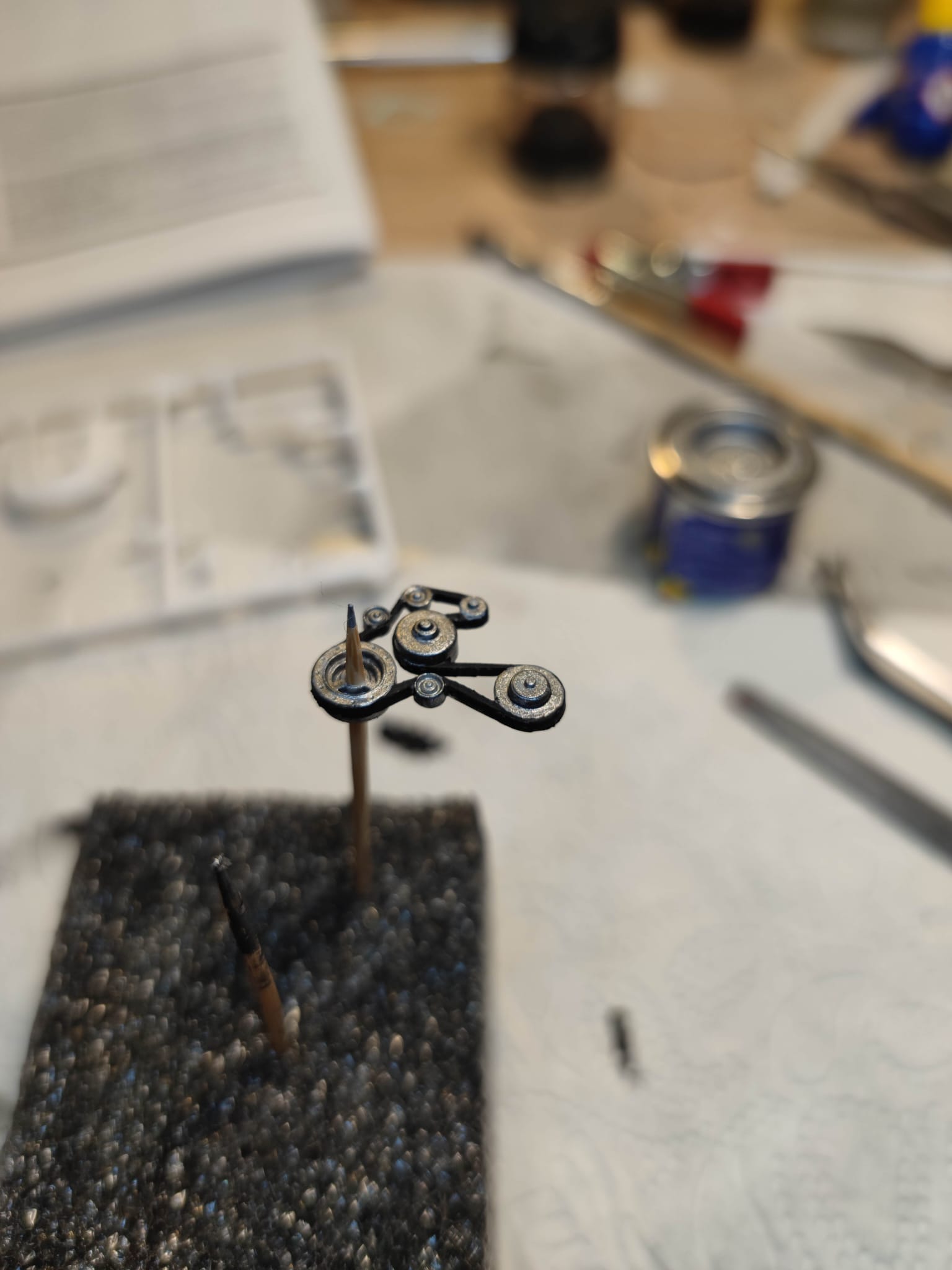 Der Motorblock mit Getriebe sind leider quasi aus einem Stück. Den habe ich mit white aluminium gebrusht. Den Unterboden und die Karosserie habe ich schwarz grundiert. Die anderen Teile habe ich mit dem Pinsel bemalt. Langsam finde ich da echt Spaß daran.