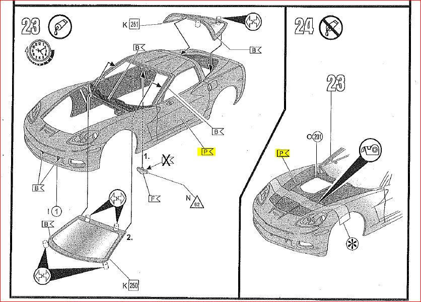 In der Bauanleitung (Seite 12) ist die Farbe "P" benannt. Das ist ein Mix aus Ultramarinblau (51) und Eisen (91) Bei der Motorhaube das "O" ist die Bezeichnung des Spritzlings