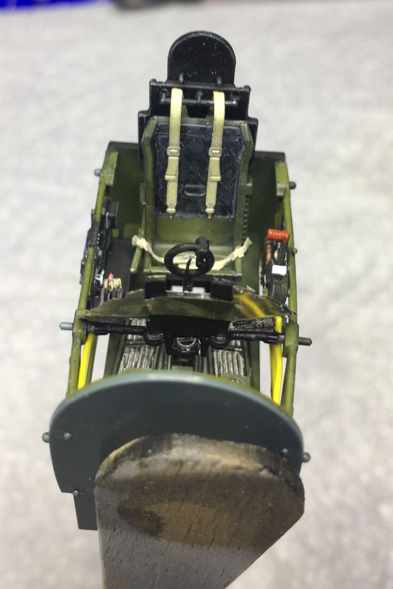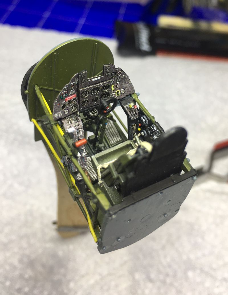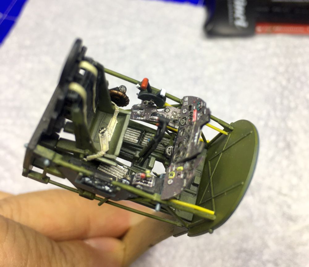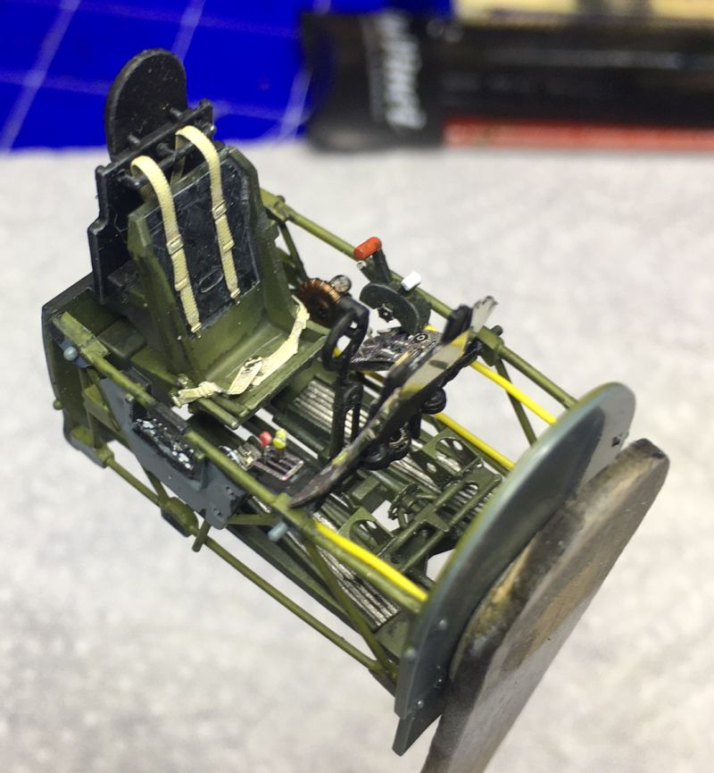Gestartet wurde mit dem Cockpit. Die farbigen Gurte und die Pedale sind geätzt. Alles wurde schwarz grundiert und dann mit Interiorgreen und Alu von Vallejo bemalt. Gealtert wurde mit Tamiya Panelliner und mit Revell Aqua-Eisen gebürstet.