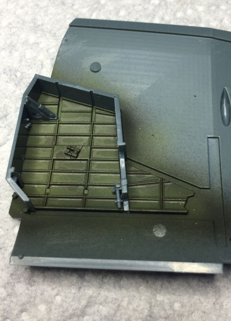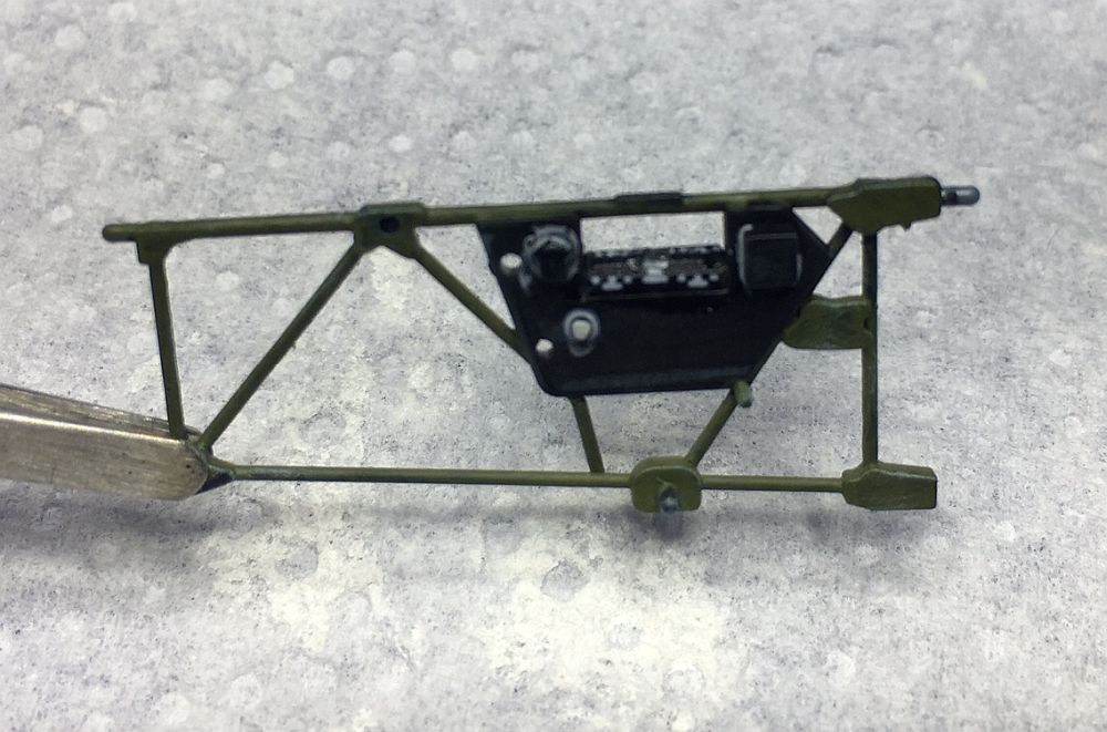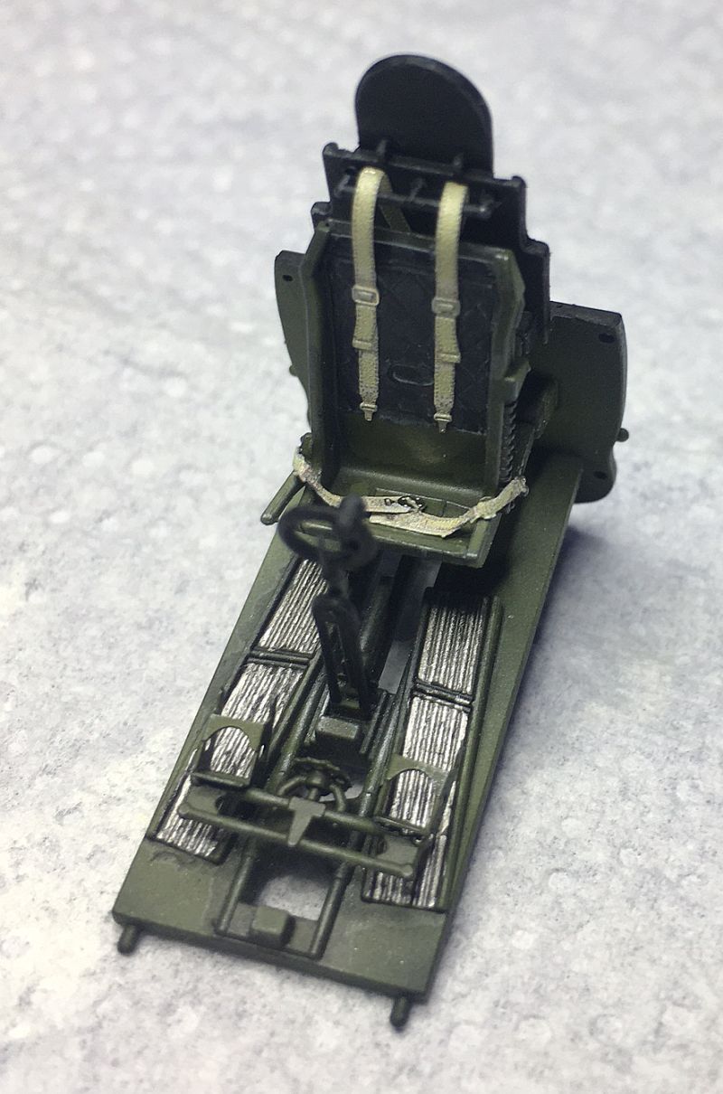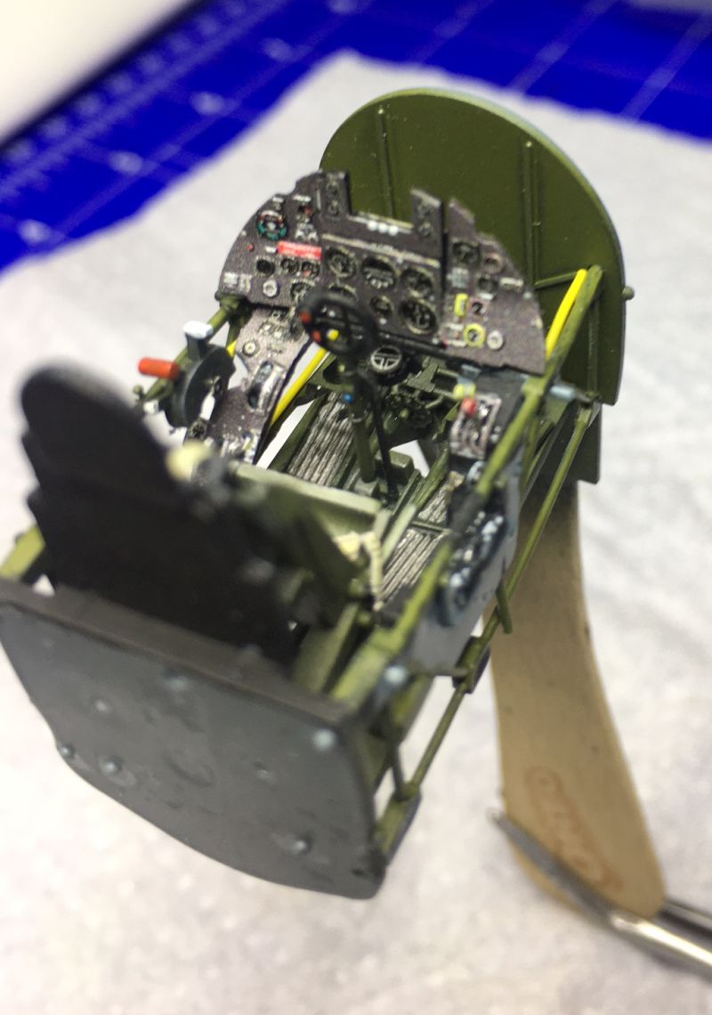 Gestartet wurde mit dem Cockpit. Die farbigen Gurte und die Pedale sind geätzt. Alles wurde schwarz grundiert und dann mit Interiorgreen und Alu von Vallejo bemalt. Gealtert wurde mit Tamiya Panelliner und mit Revell Aqua-Eisen gebürstet.