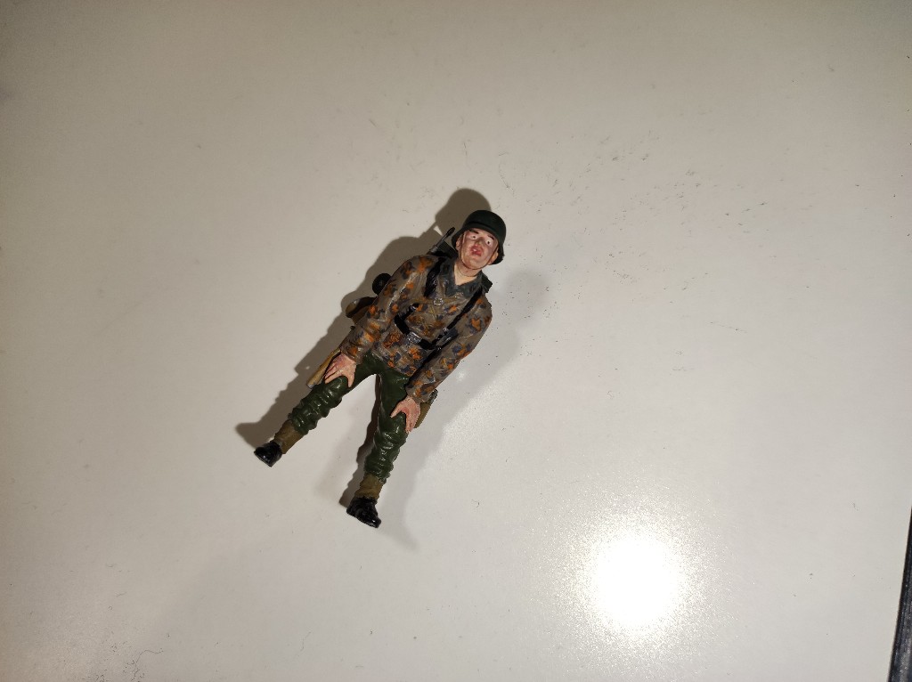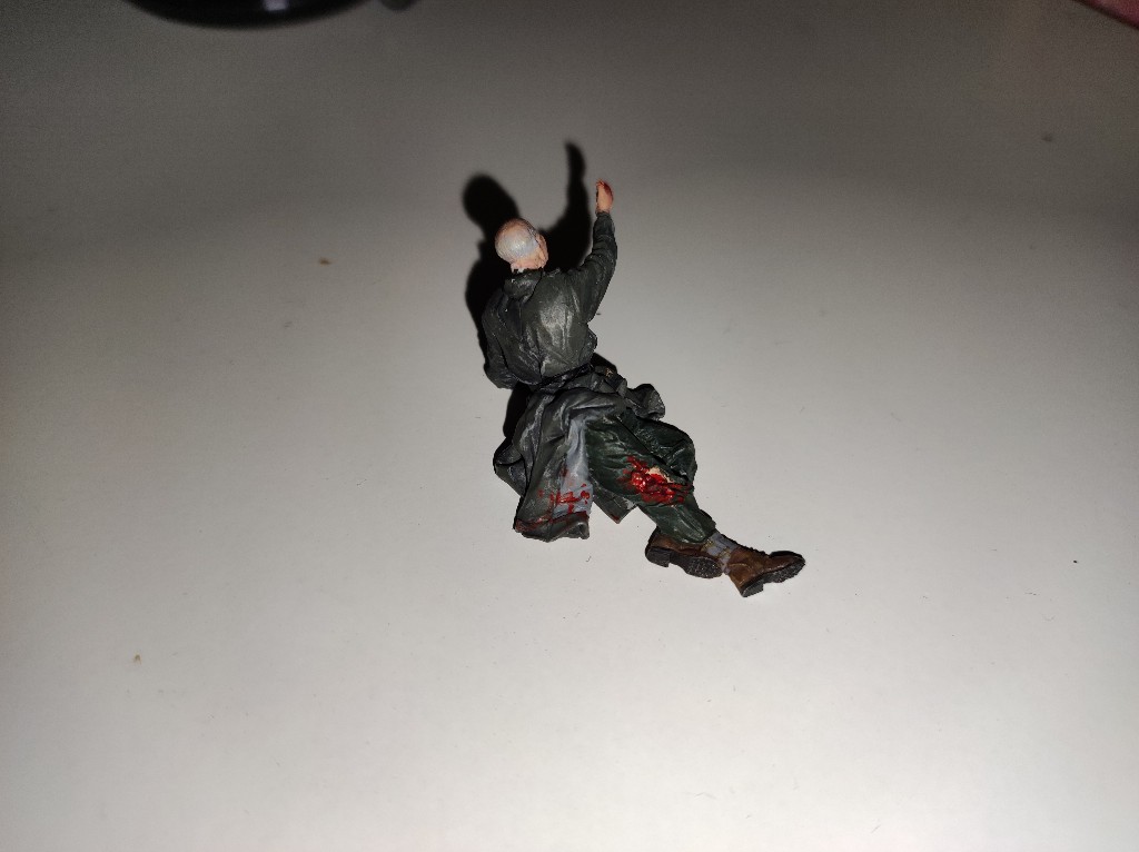Vermutlich durch einen Granttreffer verwundet, wenn nicht gar gefallen. Entsprechend läuft Blut aus dem Ohr und Nase